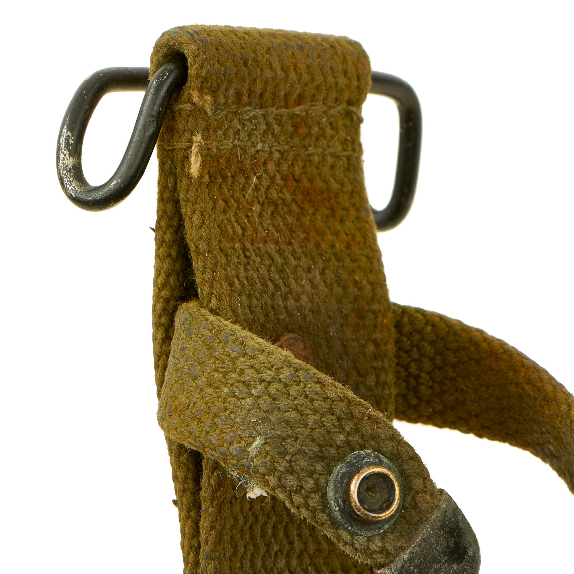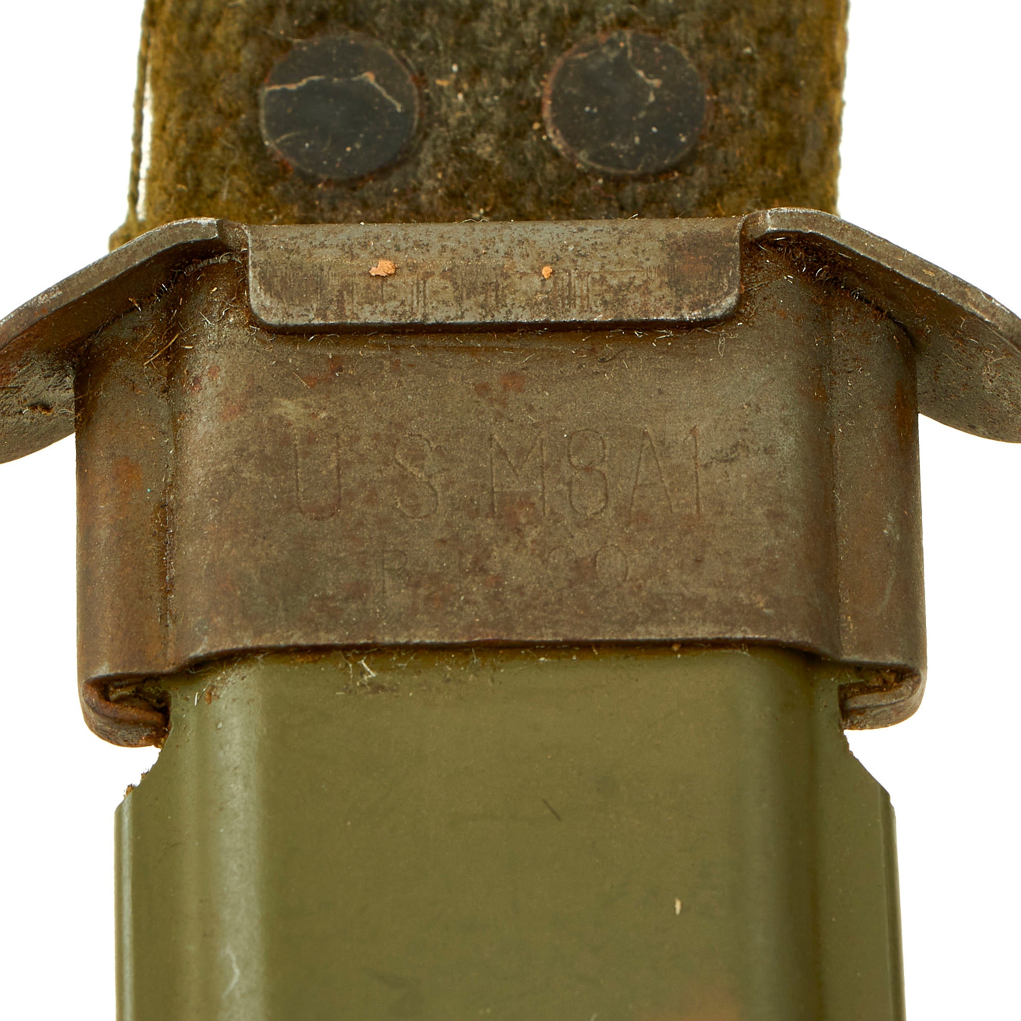 It comes in a nice WWII issue OD green thermoplastic impregnated cotton fabric scabbard marked U.S. M8 / B.M. CO., also in offered in very good condition. This early production scabbard was updated to the M8A1 standard by replacing the canvas frog with one that had a belt loop, as almost all were. There is some wear to the scabbard, but it still has almost all of the original green paint. The throat shows only slight wear to the finish, as shown. The canvas is in very good condition, and the snap still functions, with light finish wear. The scabbard was manufactured by Beckwith Mfg Co., a division of Victory Plastics, who manufactured many scabbards during the war.