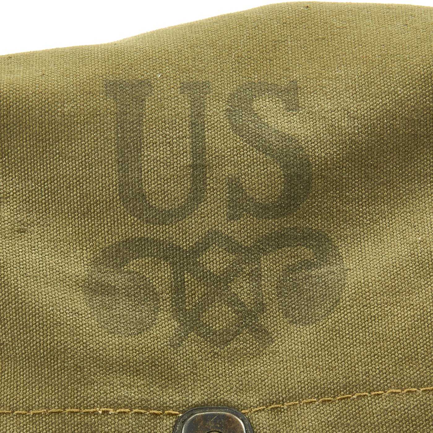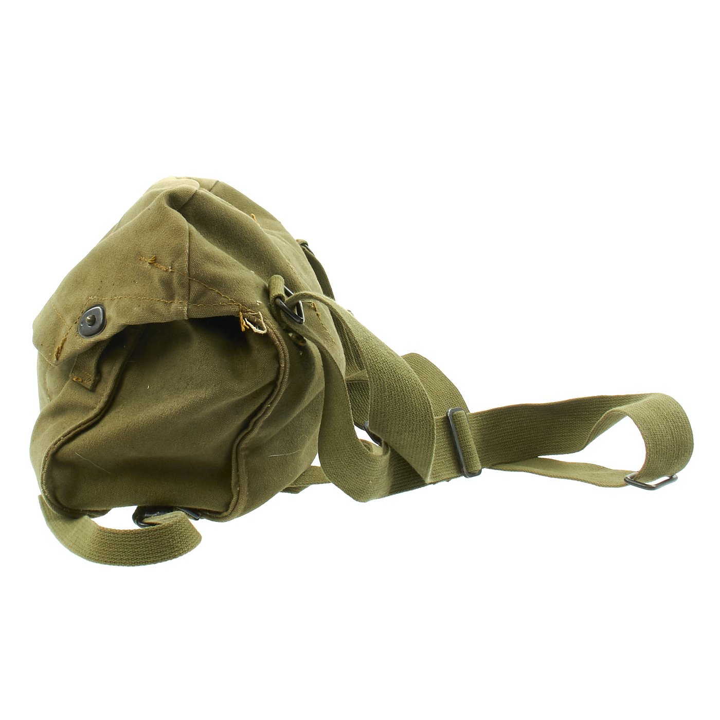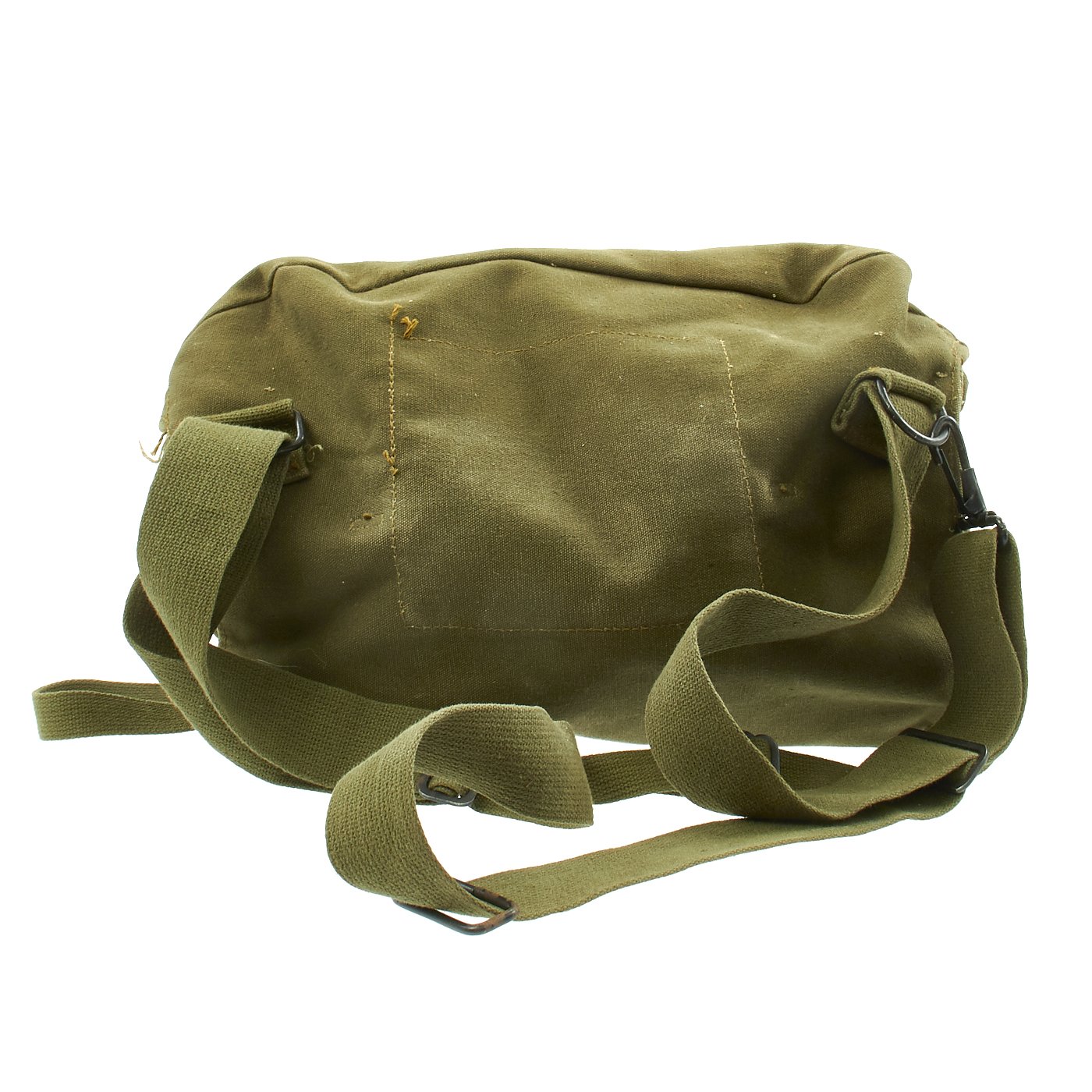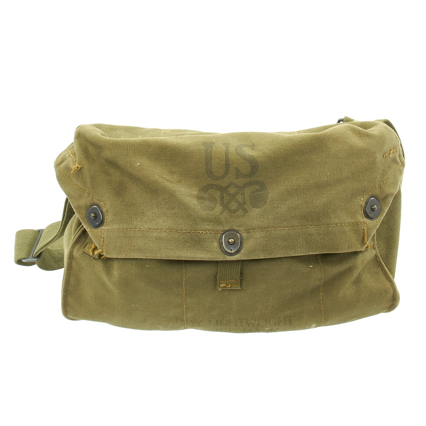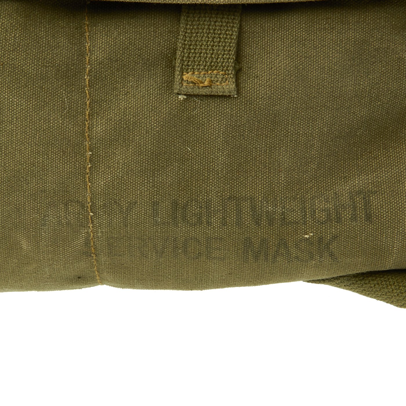 The M3 and M4 series of Lightweight Service Gas Masks required a new carrier bag due to the shorter hose length. The M6 bag was used for both the M3 and M4 masks (and others) to hold the mask itself, the canister, plus accessory items such as anti-dimming sets (to prevent fogging of the eye lenses), covers and protective ointment. The bag has interior pockets for accessories and is stenciled with "Army Lightweight Service Mask" on the exterior front, near the bottom. The M6 bag has a top closure that is secured with three LTD fasteners. Like other WW II webbing and bags, the bag color was OD #3 early in the war but changed to the darker OD #7 shade in 1943.