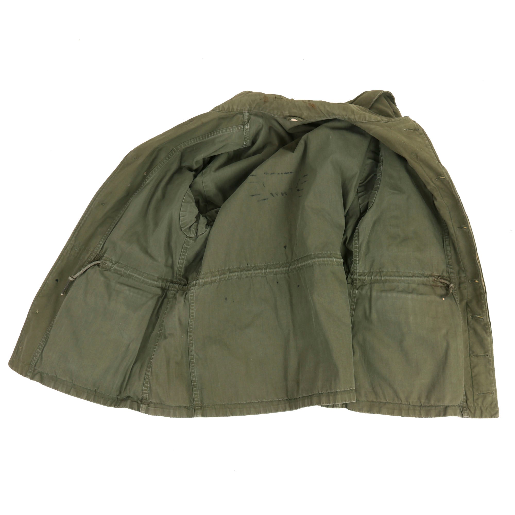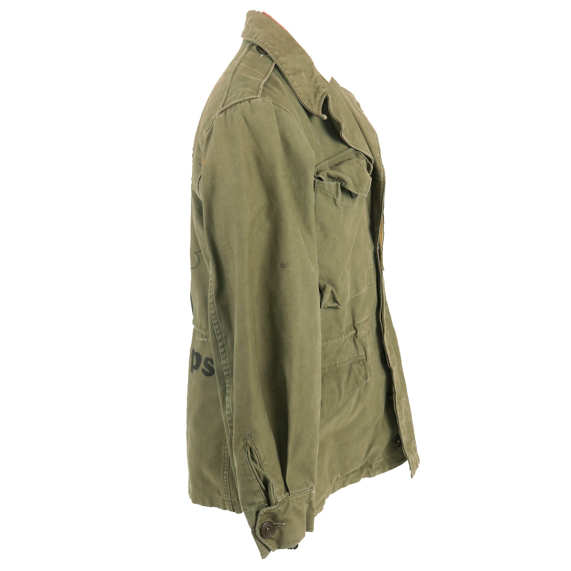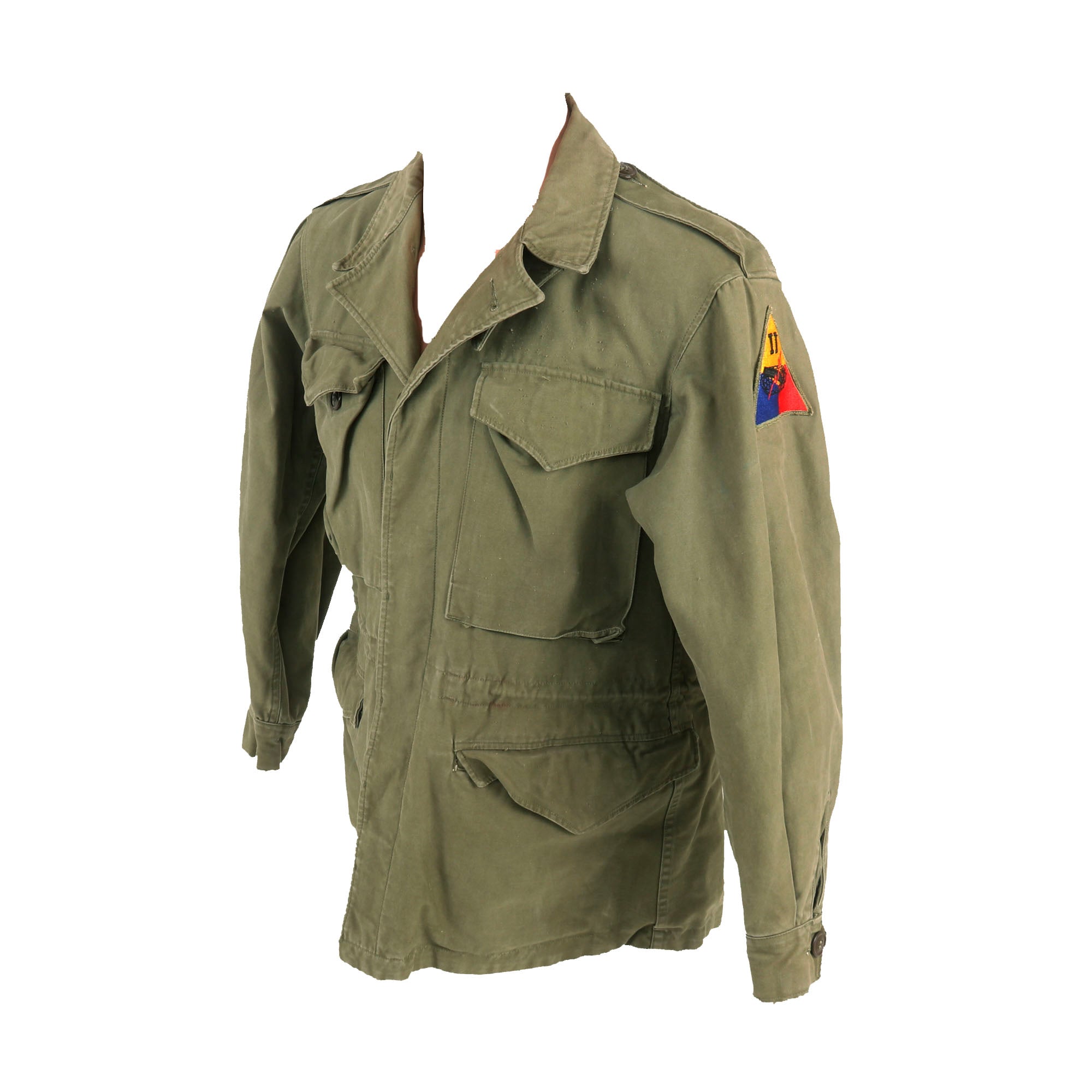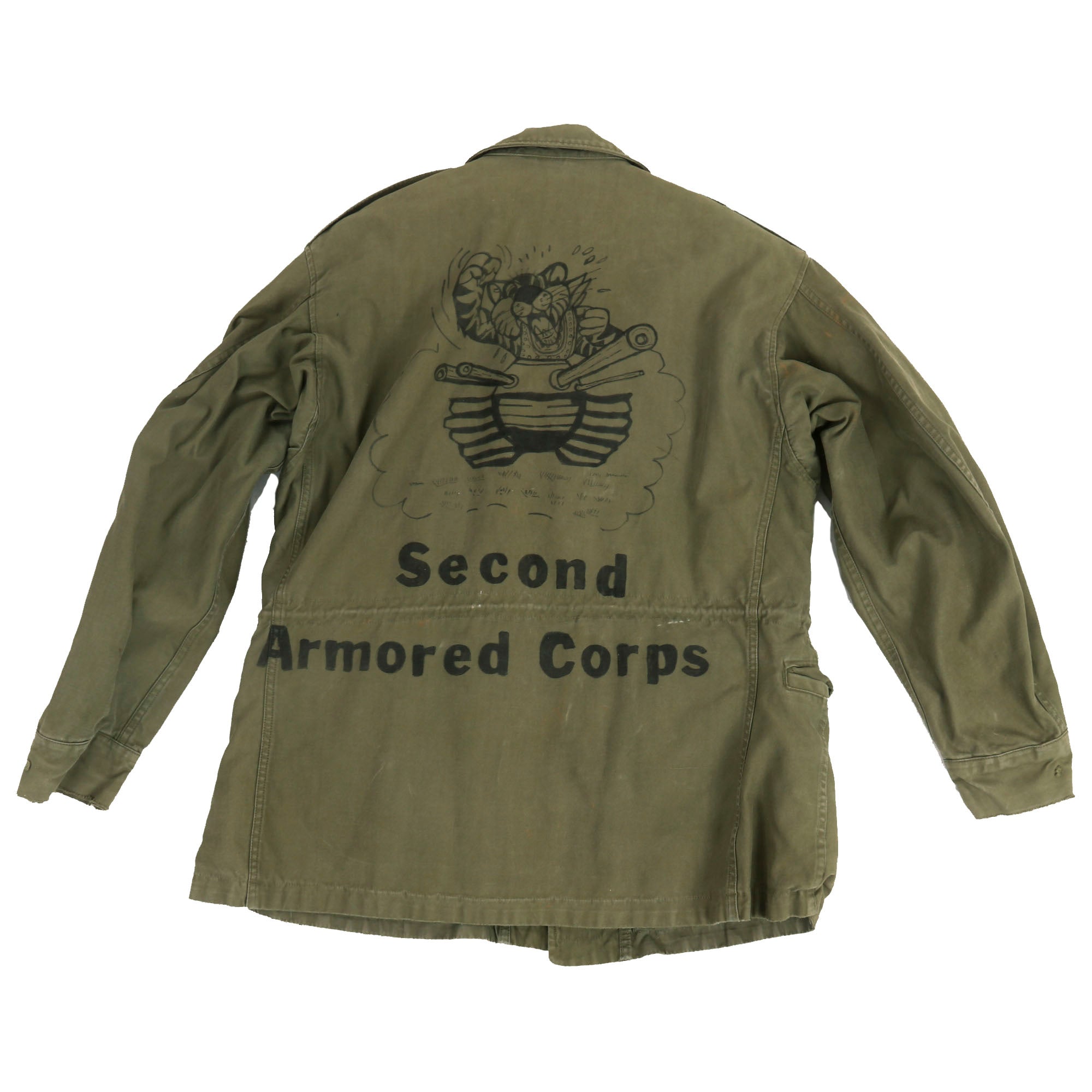 Original Item: Only One Available. This is a wonderful example of a WWII Era M43 field jacket, issued and worn during the Korean War era. The best feature of the jacket is the Second Armored Corps “Tiger in Tank” artwork on the back of the jacket. There are no arsenal/manufacture tags present on the jacket, so confirmation of a date cannot be found. The artwork on the reverse does appear to be period done due to the aging and fading that is present.