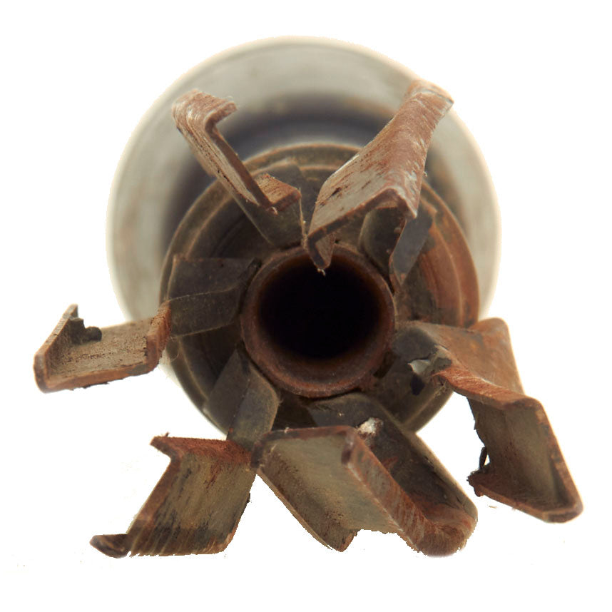 The inert rocket measures approximately 22 inches long and has not been repainted OD green like we so often see. The warhead and fin assembly still unscrew, allowing the interior to be inspected. The rocket does have SIMCO stamped where it meets the warhead and is also stamped on the tail fin assembly. There are no dents on the cone and all the fins are present but are bent and misshapen. The rocket still retains much of the original black paint but no white stenciling. The M7A1 rocket is nearly identical to the M6A1 with the only difference being the lack of an explosive charge in the M7A1.