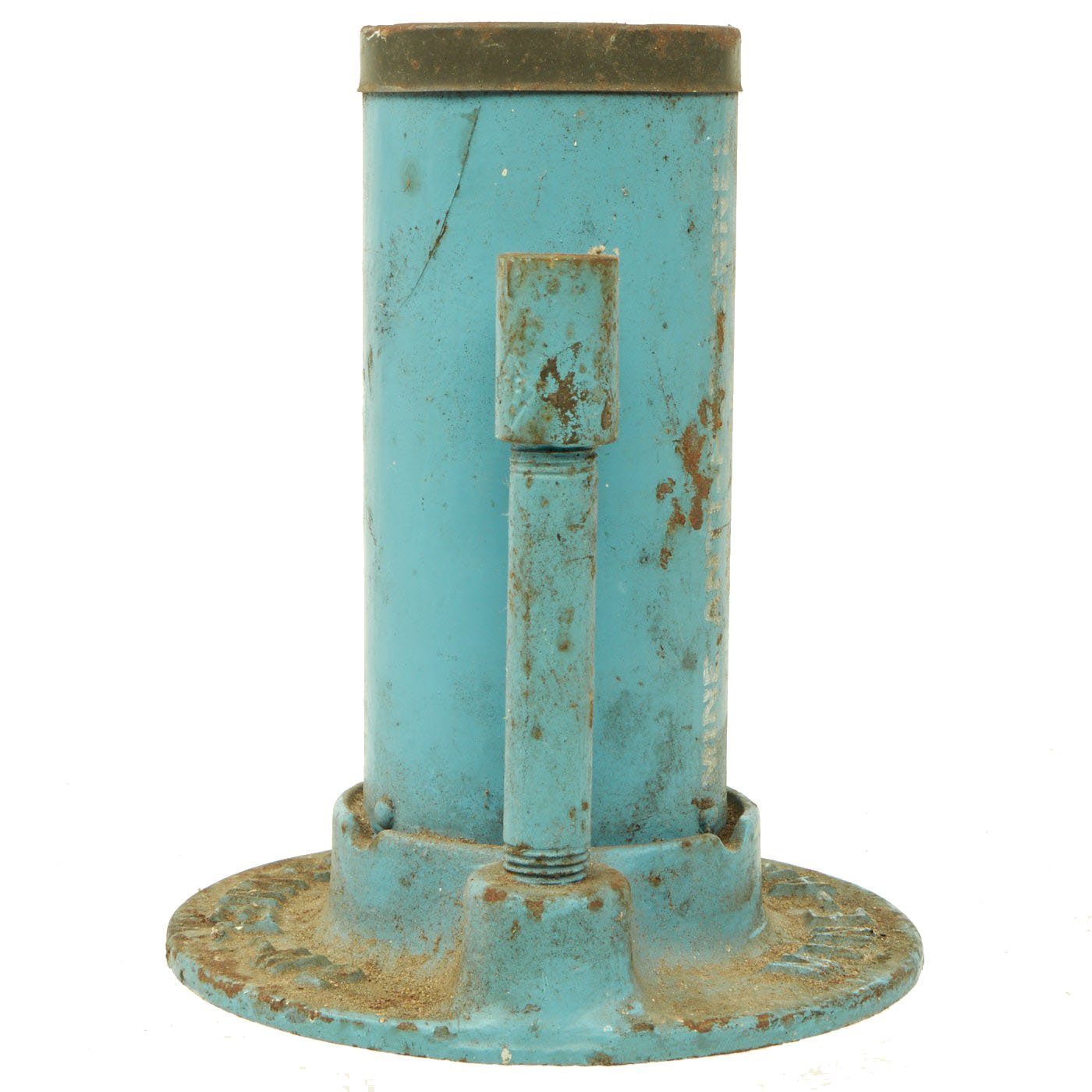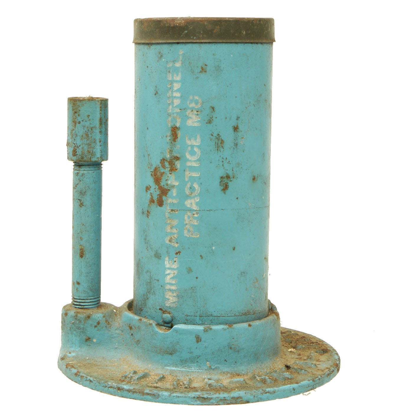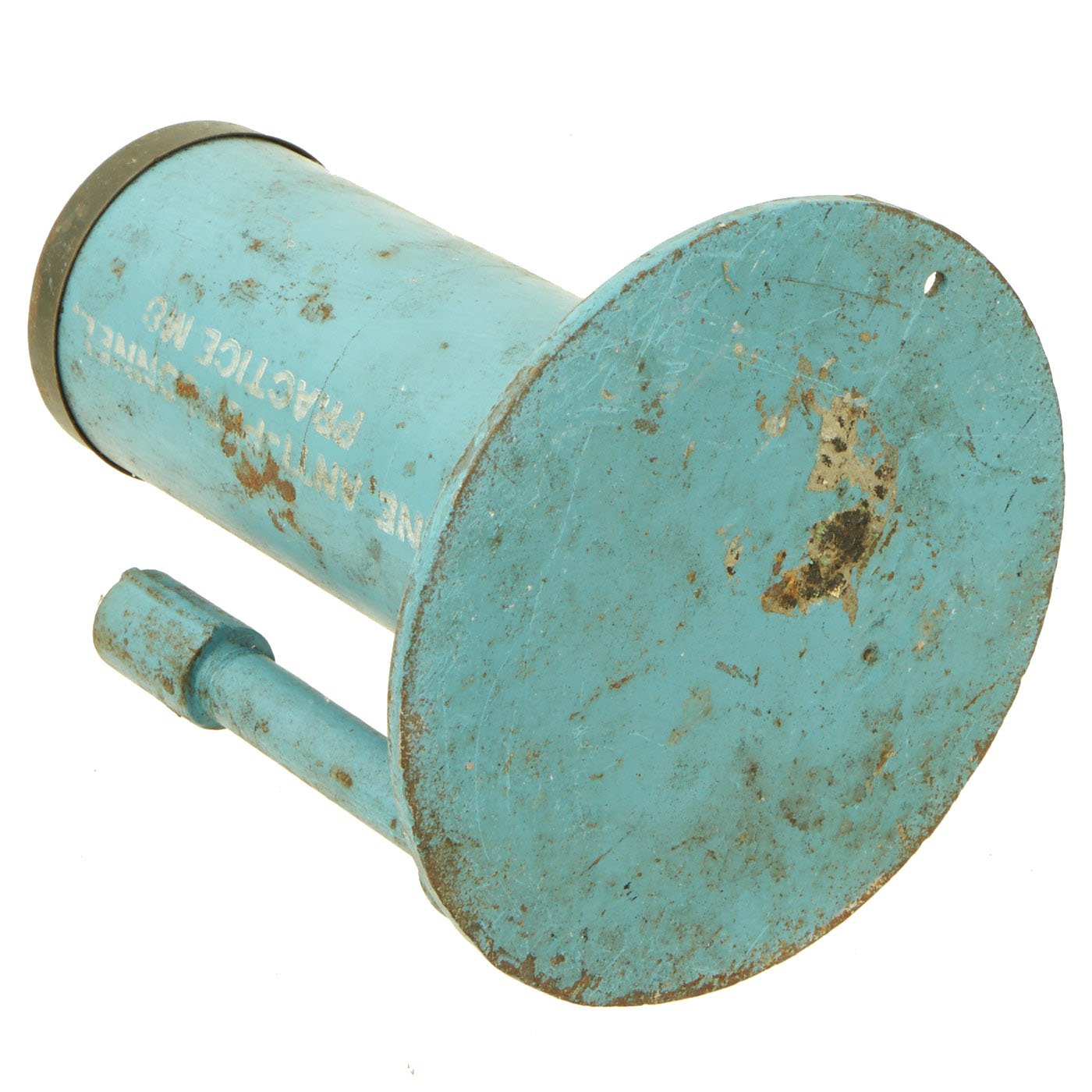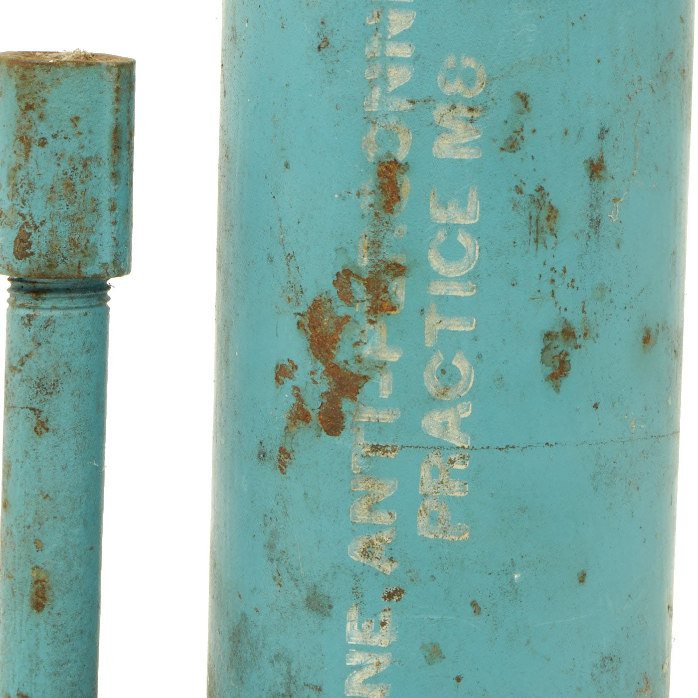 This example is completely inert per BATF specifications, and cannot be converted to an explosive devise. It still features the original top cap, attached to the body. It is mostly painted sky blue, the standard color for U.S. training and practice ordnance. The base is marked MINE - ANTI - PERSONNEL - M2, and the side of the tube indicates it is a MINE ANTI-PERSONNEL PRACTICE M8. It is still in very good condition, with just some light rusting and wear.