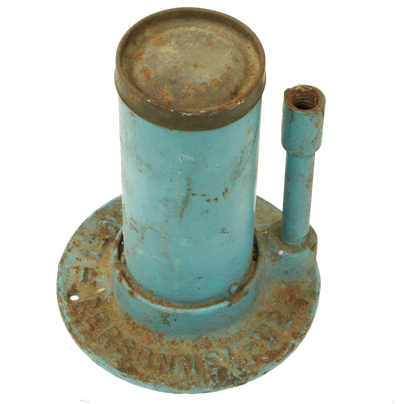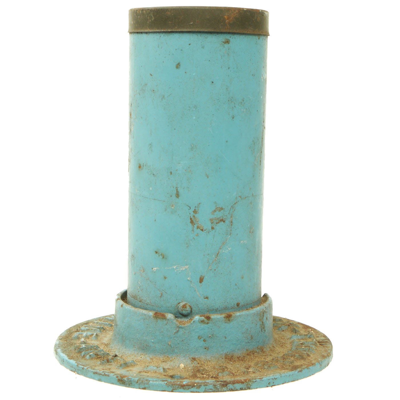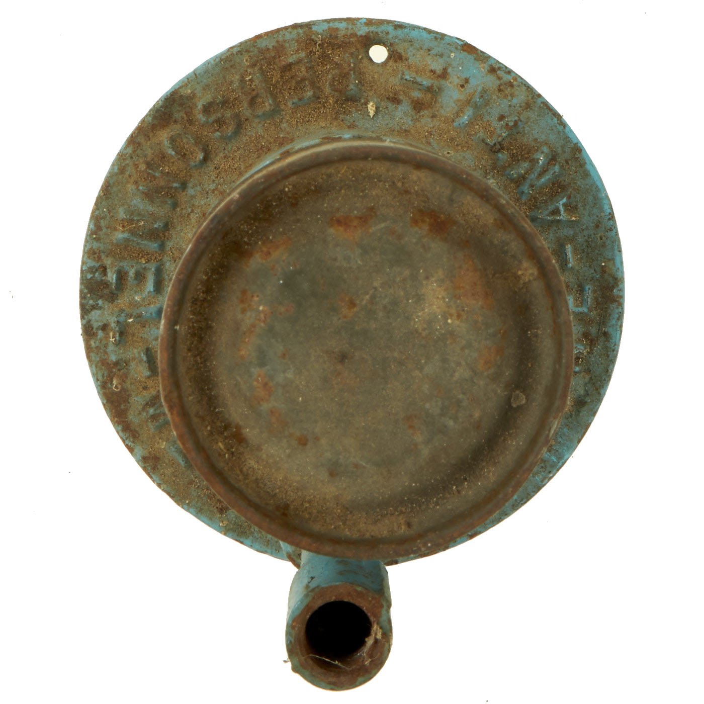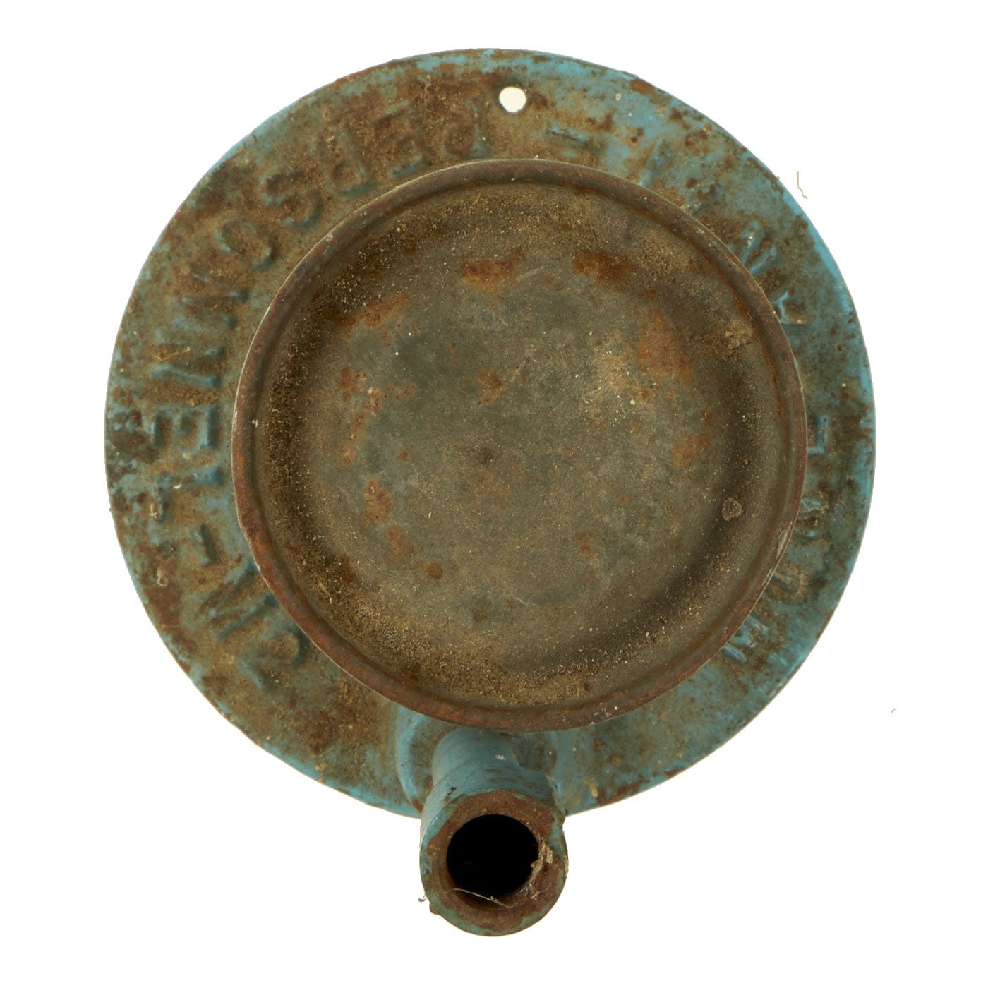 This example is completely inert per BATF specifications, and cannot be converted to an explosive devise. It still features the original top cap, attached to the body. It is mostly painted sky blue, the standard color for U.S. training and practice ordnance. The base is marked MINE - ANTI - PERSONNEL - M2, and the side of the tube indicates it is a MINE ANTI-PERSONNEL PRACTICE M8. It is still in very good condition, with just some light rusting and wear.
