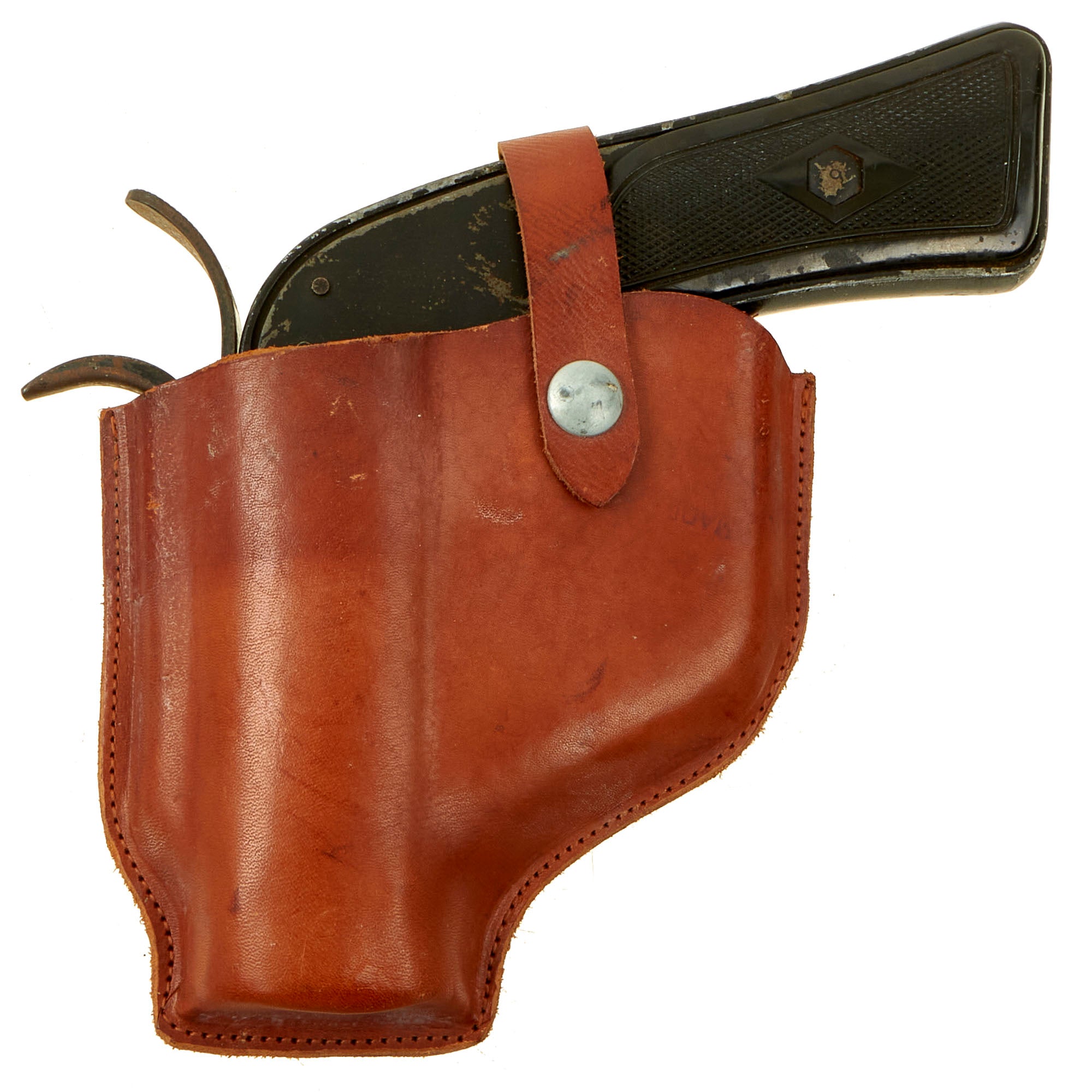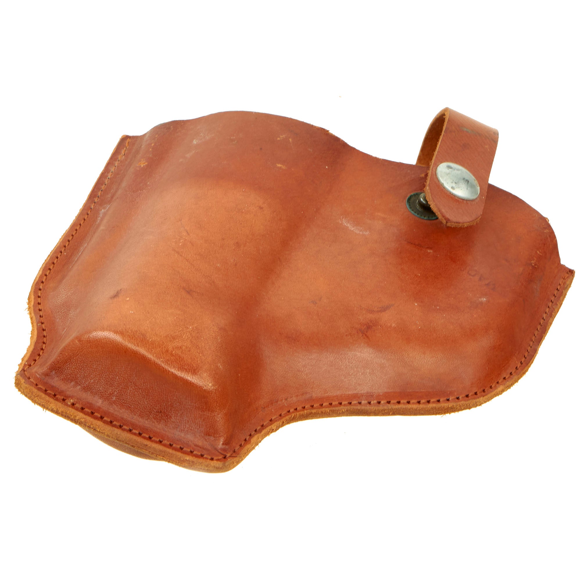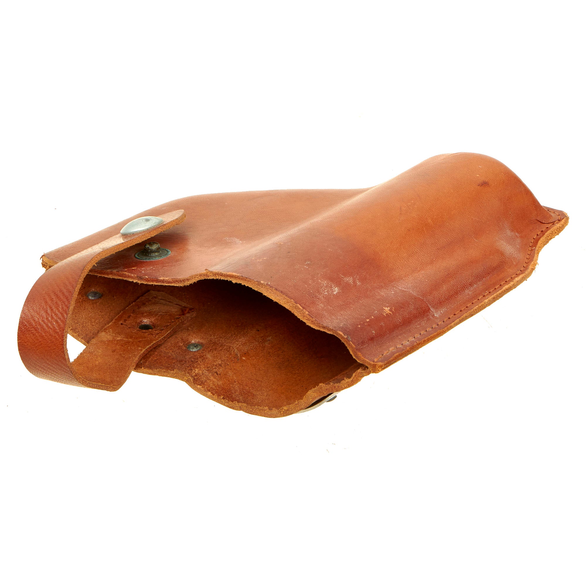 The leather holster is beautiful but does show signs of being stored for a long period of time. The leather itself is still soft, not cracked or damaged, the aluminum plate on the back is still present, undamaged and has all 7 original rivets. On the face of the holster MADE IN CANADA can still be seen but barely.