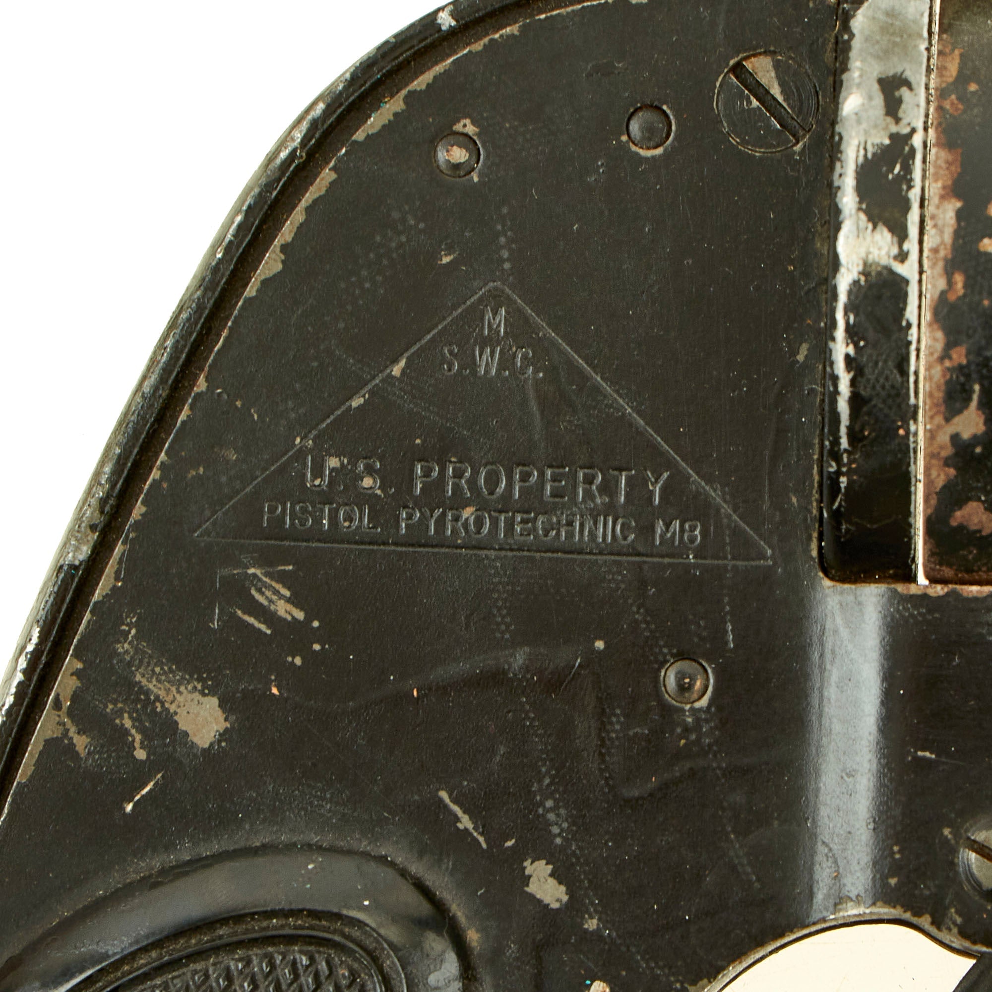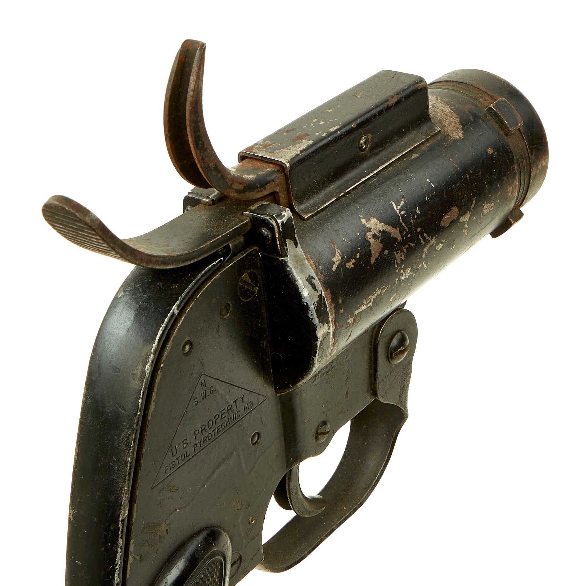 Original Item: Only One Available. This is a very nice condition M8 37mm big-bore signal pistol, as used during WWII. The barrel has studs for attachment to a flare port in the fuselage of large aircraft such as bombers. The right side of the frame is marked inside a triangle: