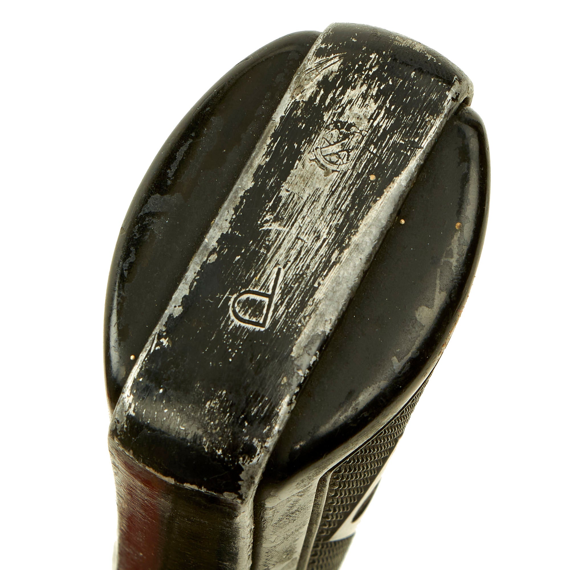 The abbreviation at the top indicates manufacture by McInerney Spring & Wire Co., one of several contractors employed to make these pistols. This example is offered in very good fully functional condition, and is marked on the spine of the grip with SERIAL No. 341876. A good deal of the original finish is present, even the paint on the aluminum portions. As far as we can tell, no parts are missing, and the firing pin is present and functional. It is marked with the U.S. Ordnance "Crossed Cannons" proof and "P" on the bottom of the grip.