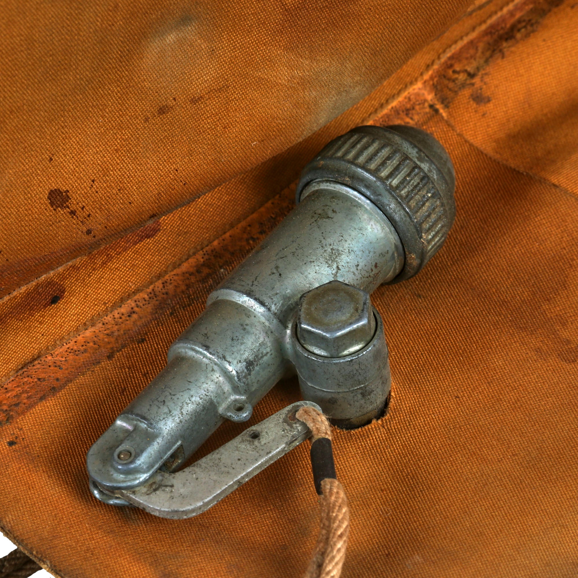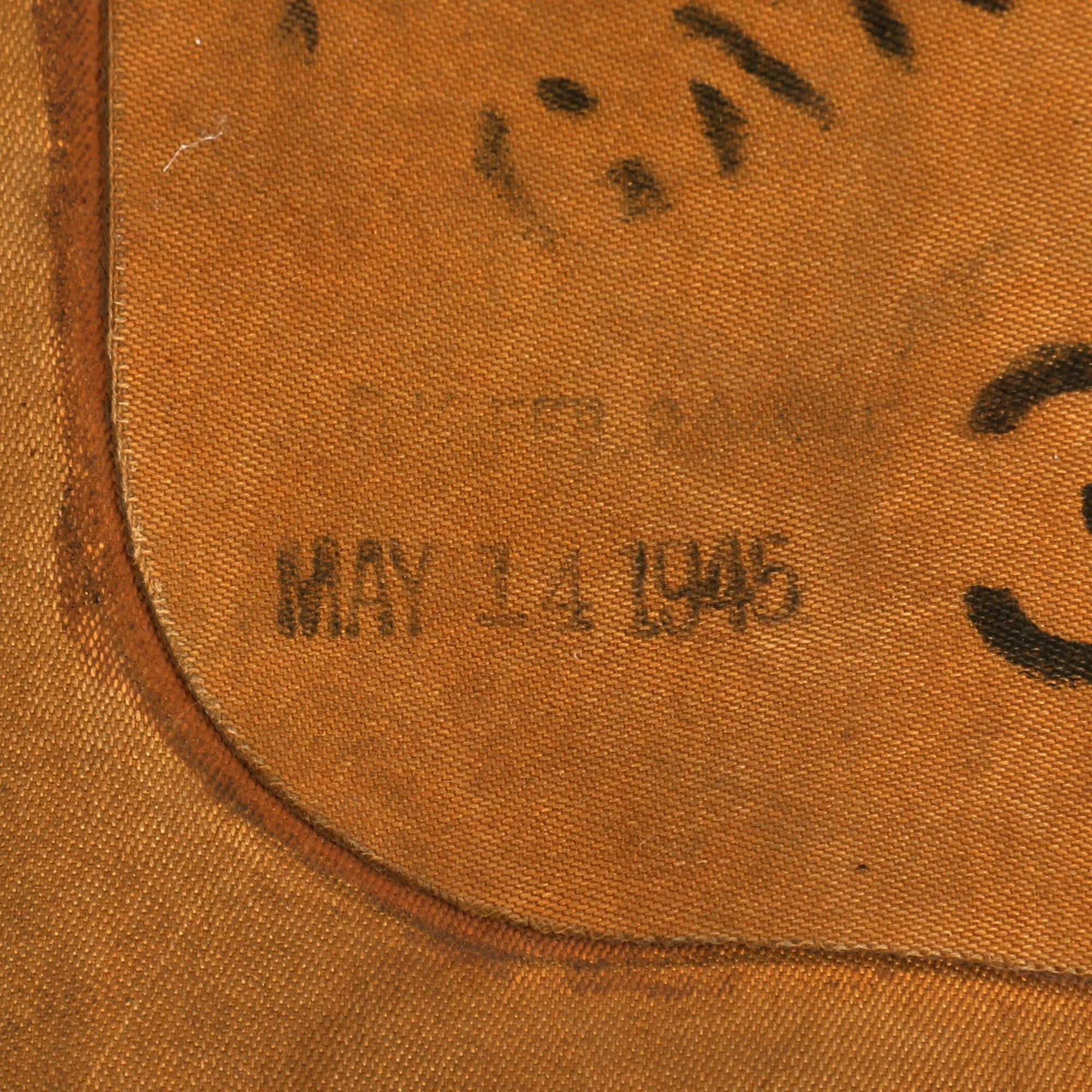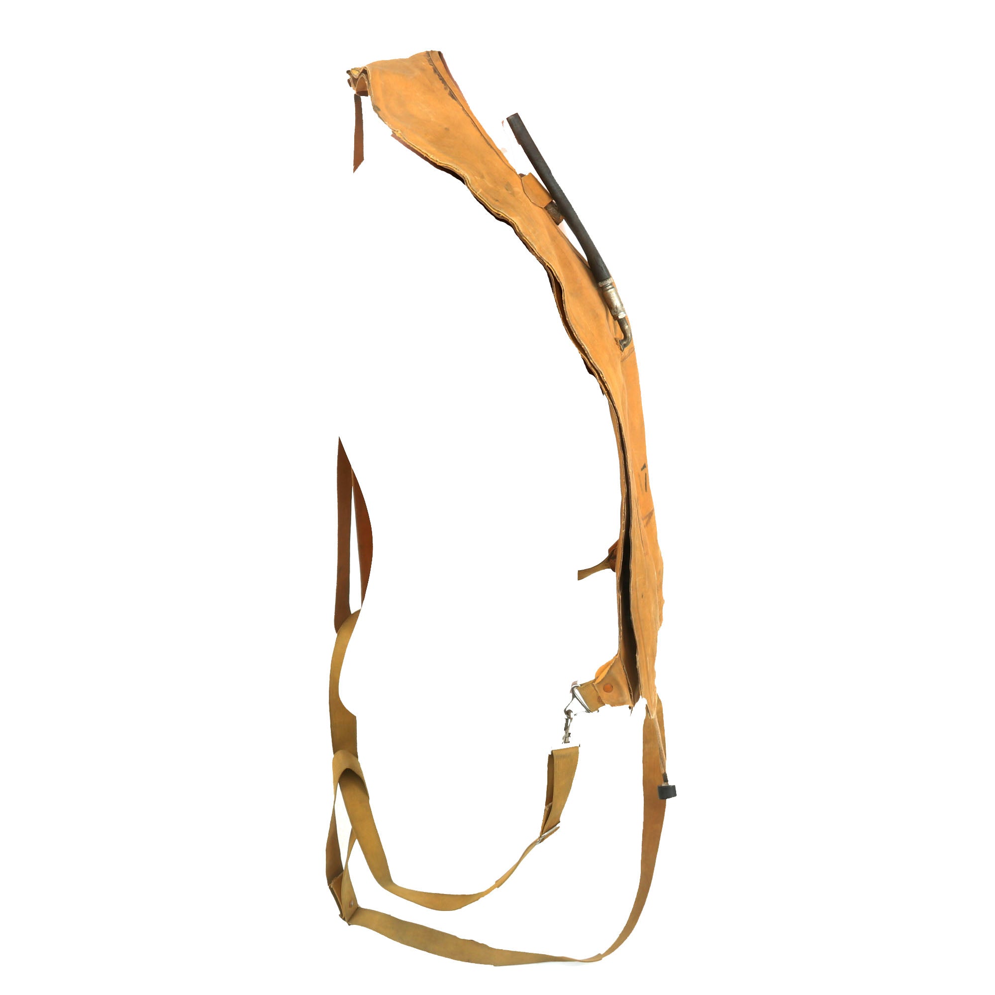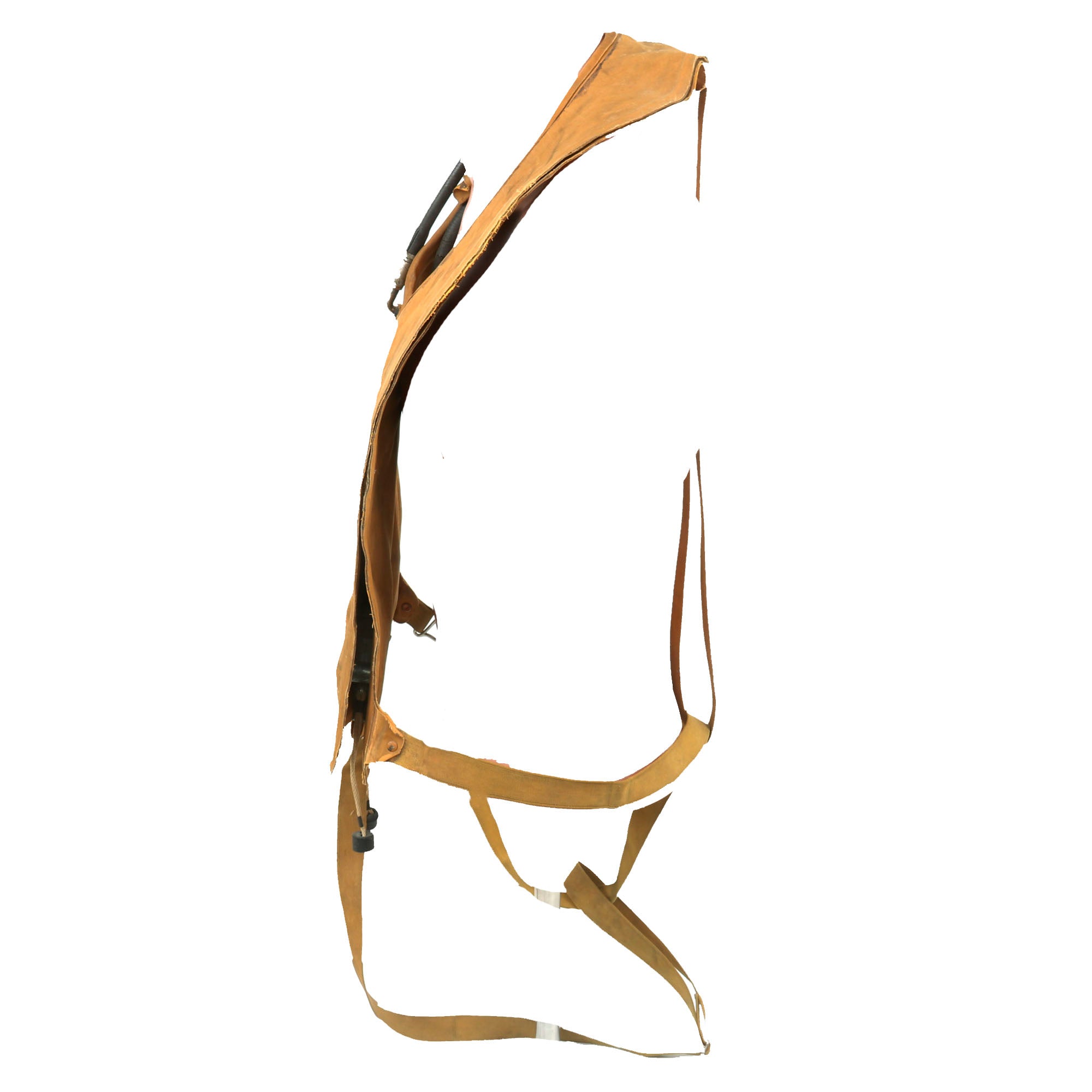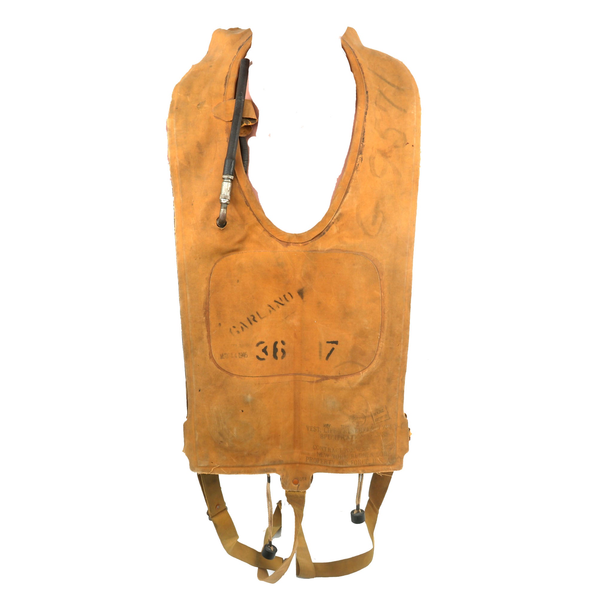 This example is in good display condition, and is complete. It is the USAAF version, in a yellow-tan color. It has all of the original tie down straps, and the original C02 inflation valves and retainers are present. Both original pull cords are intact, though there are no spent C02 canisters. Both manual inflation tubes are still present, as well as the original valves, and they seem to be somewhat functional. The material is heavily stiffened and some material comes off if moved too much. The vest is named GARLAND in stenciling on the front.