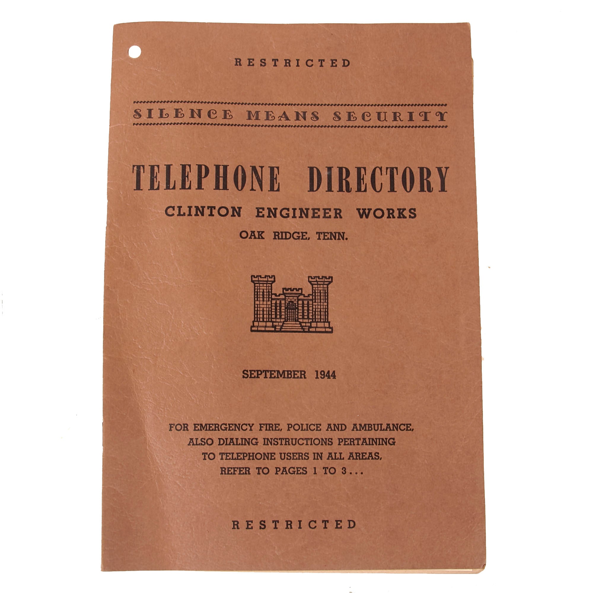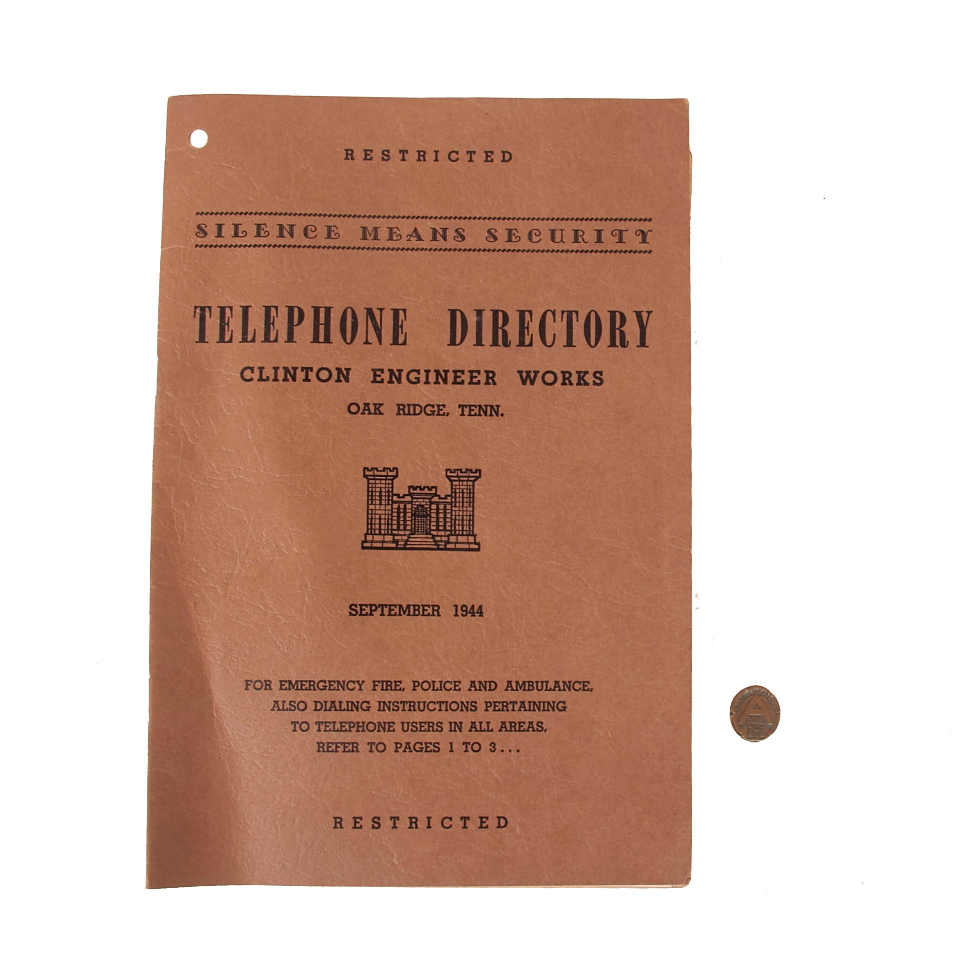 Original item: Only One Available. This is a great grouping consisting of the Telephone Directory for Clinton Engineer Works, the production installation of the Manhattan Project that during World War II produced the enriched uranium used in the 1945 bombing of Hiroshima, as well as the first examples of reactor-produced plutonium, and a genuine bronze MANHATTAN PROJECT pin that was given to the workers who spent less than one year on the project. A sterling silver pin would be awarded to workers who spent over one year on the project.