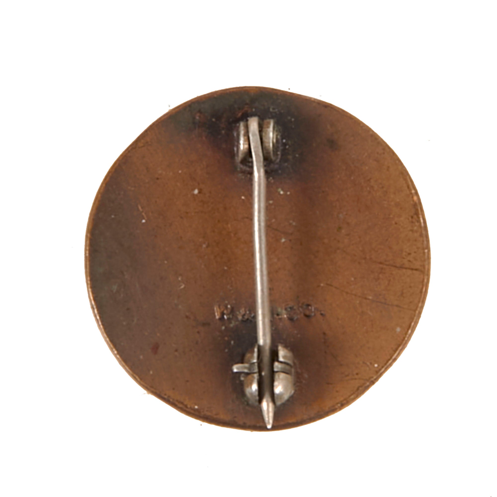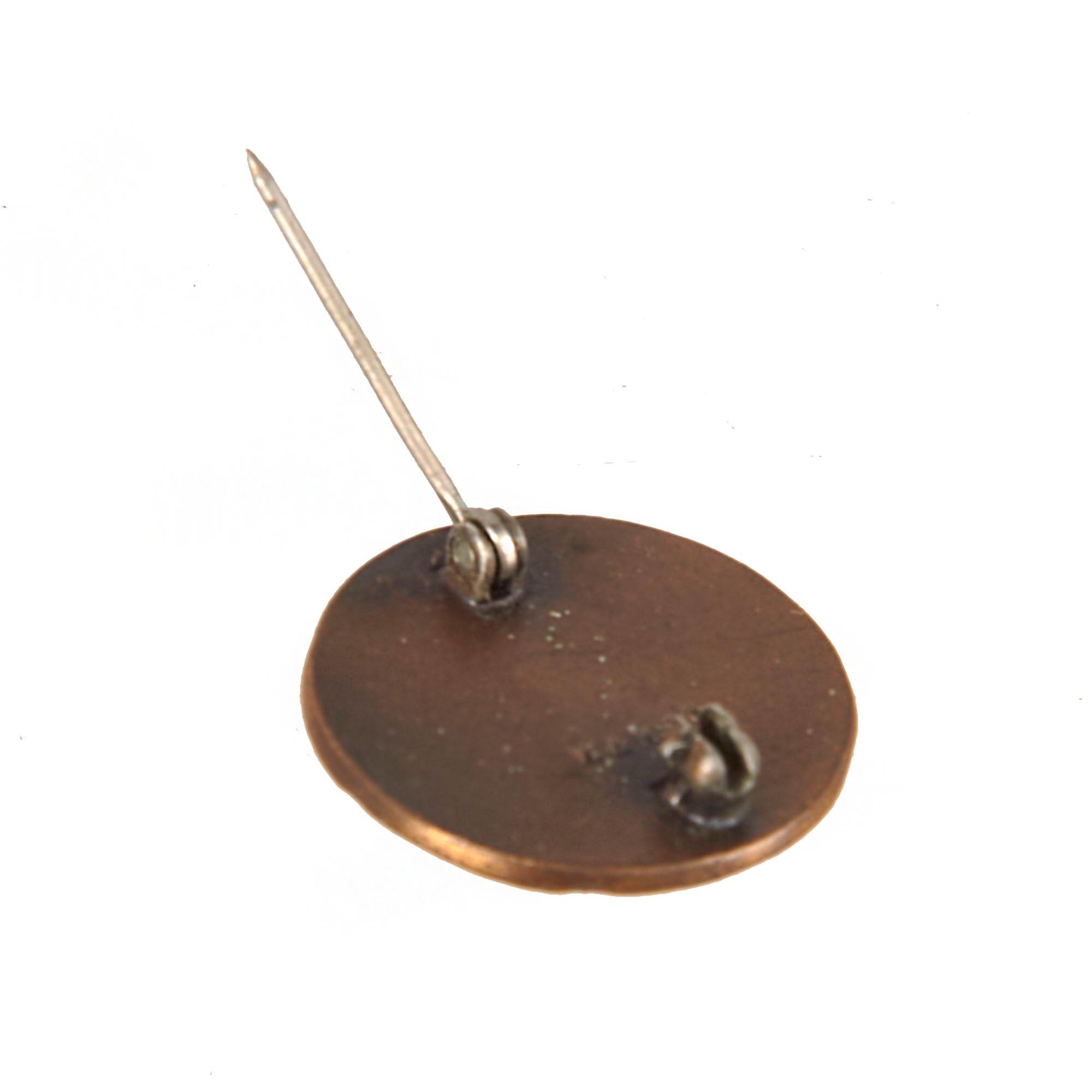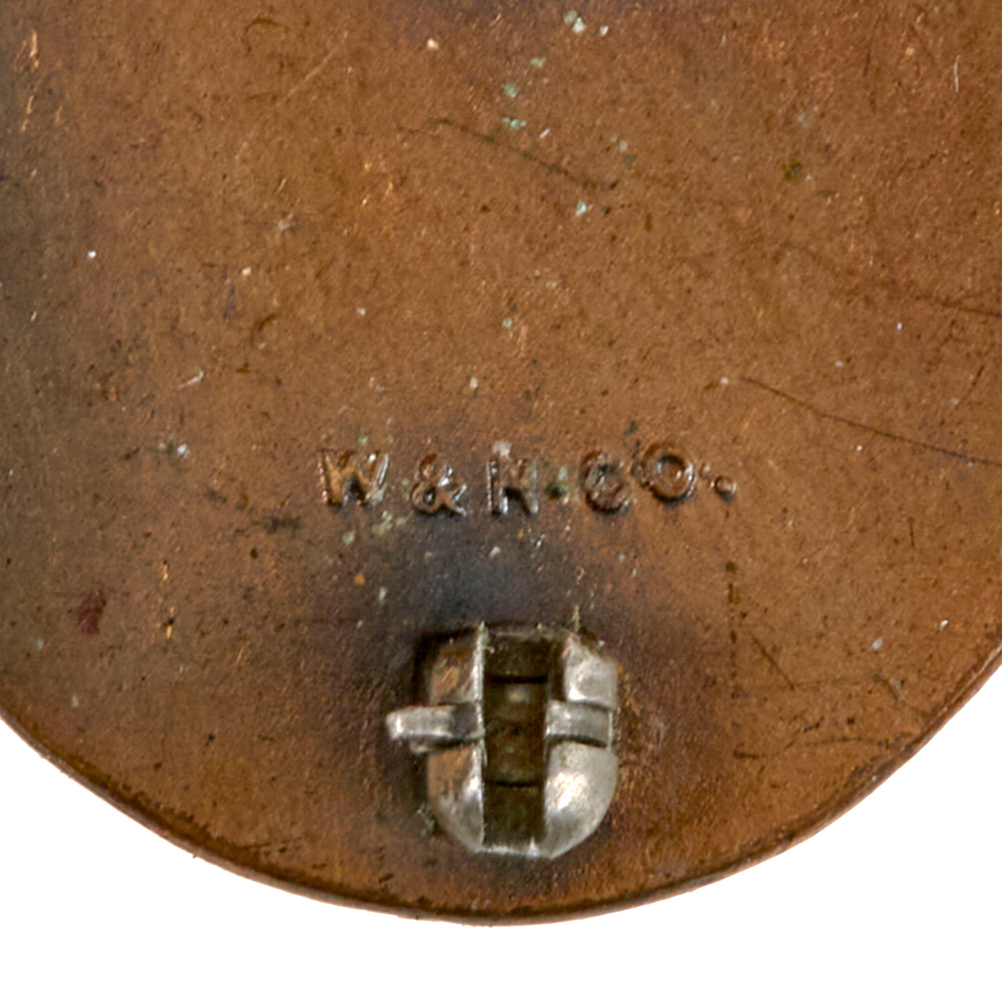 The pin is in very good condition with a working pin and catch. It is nicely marked on the reverse with W & H CO. for Whitehead & Hoag Company, the maker of these pins. The pin measures 11/16” round, and has a lovely patina.