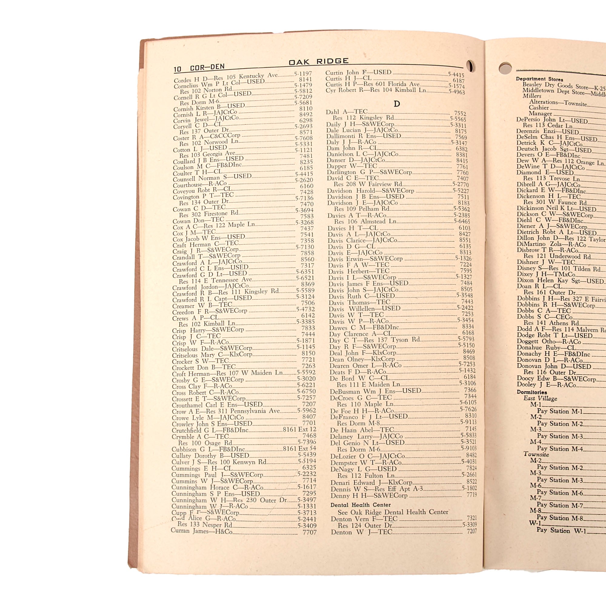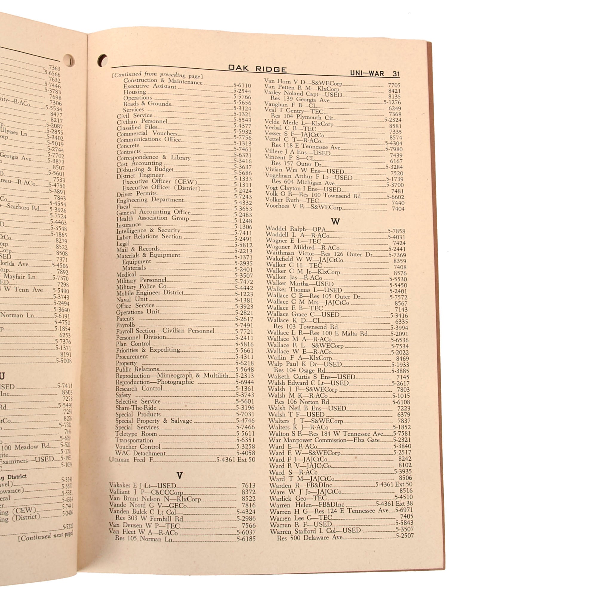 The directory is in good condition, measuring 6¾ x 10”, with all 48 pages retained. The front bears RESTRICTED over SILENCE MEANS SECURITY. It is dated to September 1944, and on the interior is a separate page denoting that on September 9th, 1944, all phone numbers in the Townsite area would be changed. A great addition. We haven’t been able to find many other examples of this directory, making it a very scarce offering. The only issue is that there is some bending in the book, but nothing serious.