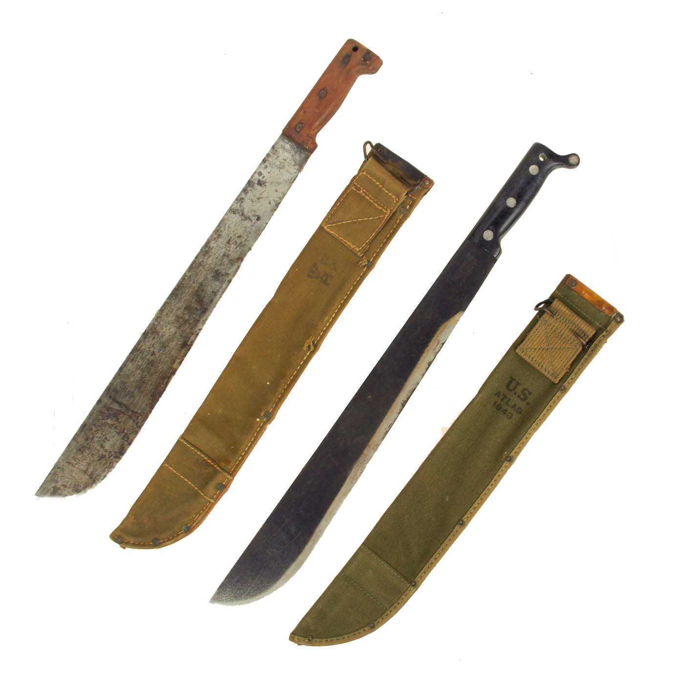 Original Items: Only One Lot of 2 Available. A machete is a broad blade used either as an agricultural implement similar to an axe, or in combat like a long-bladed knife. The blade is typically 30 to 45 centimeters (12 to 18 in) long and usually under 3 millimeters (1⁄8 in) thick. In the Spanish language, the word is possibly a diminutive form of the word macho, which was used to refer to sledgehammers. Alternatively, its origin may be machaera, the name given by the Romans to the falcata. It is the origin of the English language equivalent term matchet, though it is less commonly used. In much of the English-speaking Caribbean, such as Jamaica, Barbados, Guyana, and Grenada and in Trinidad and Tobago, the term cutlass is used for these agricultural tools.