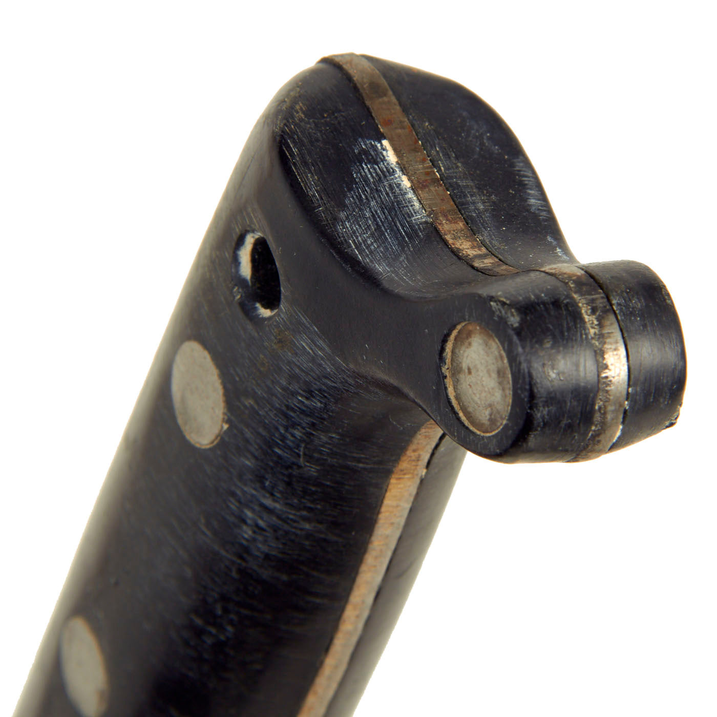 The machete is in wonderful, service used condition without any extensive damage present. There is some staining and pitting to the blade and the bakelite grip scales are solid and in wonderful condition. The edge is still nice and sharp.
