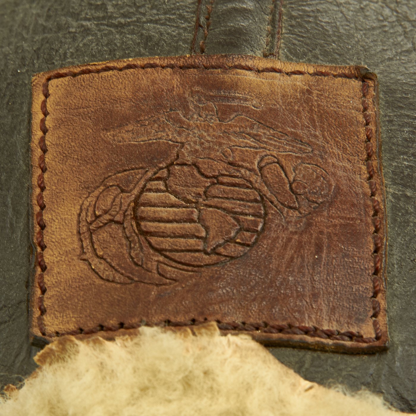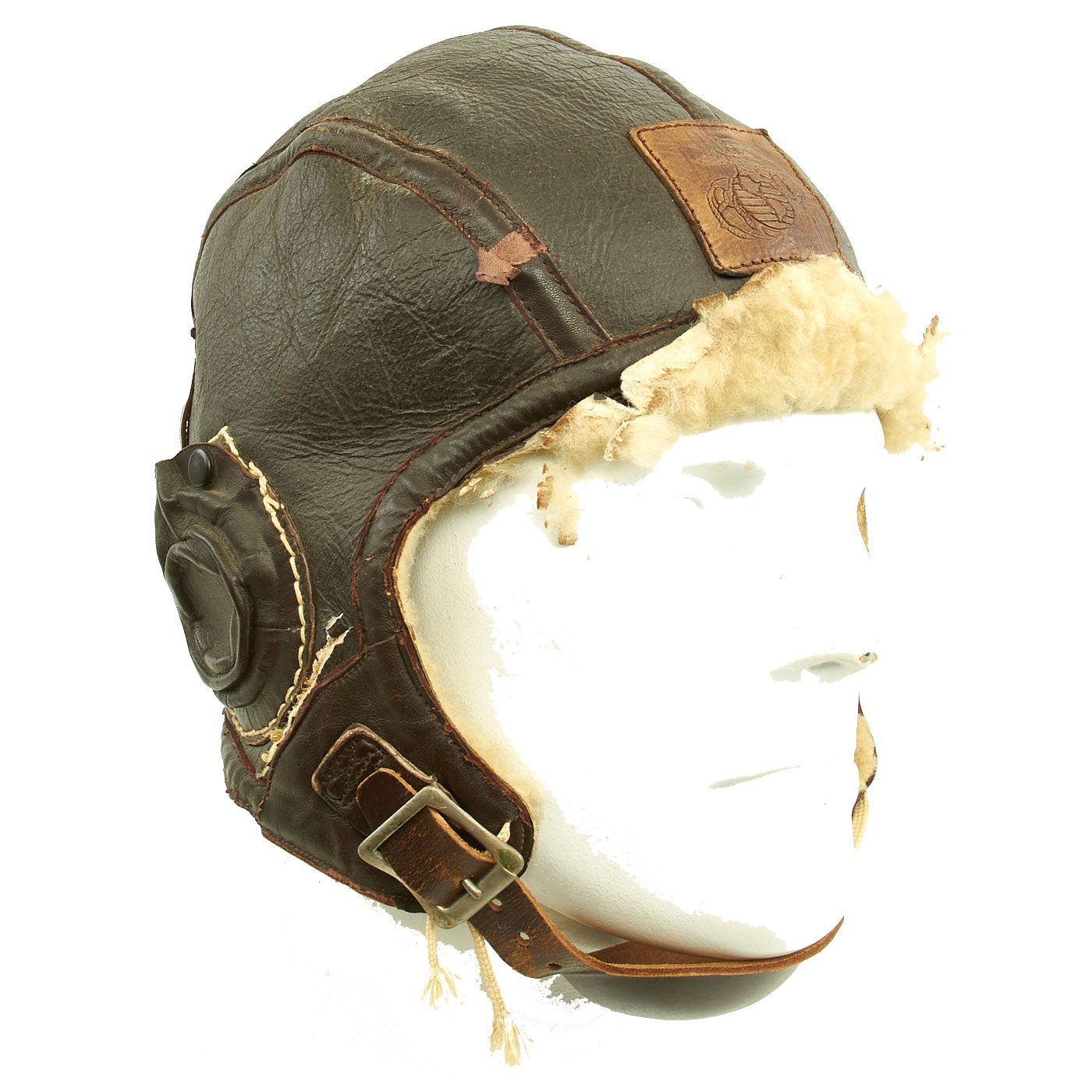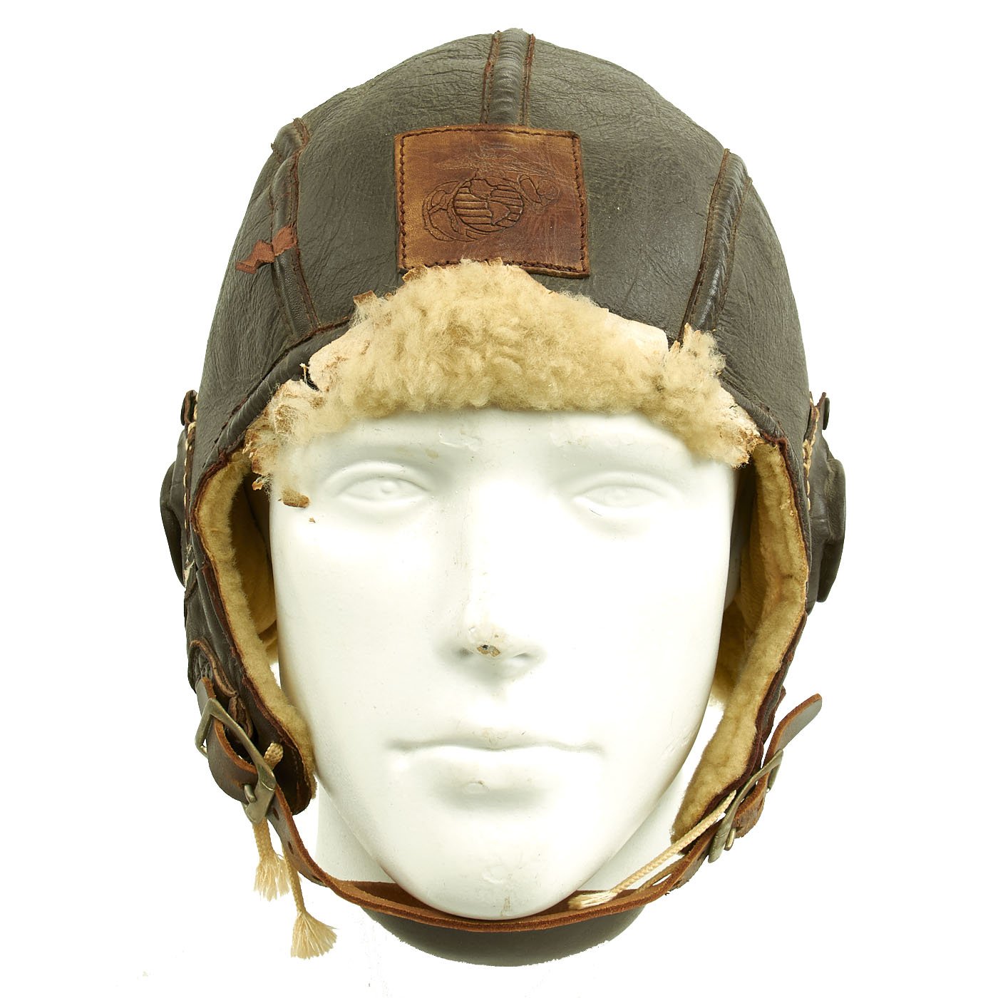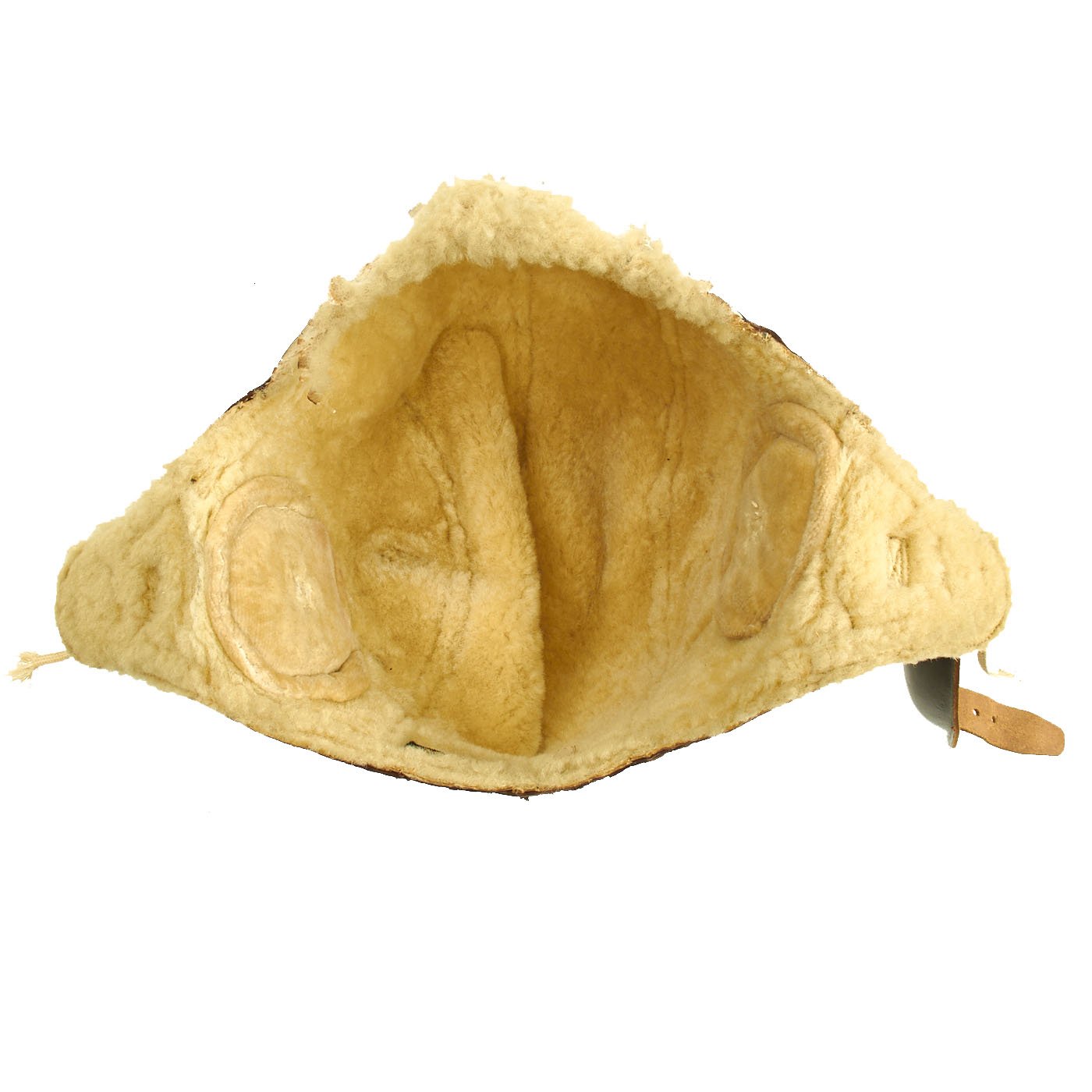 Original Item: Only One Available. The winter, shearling lined, version of the Naval Aircraft Factory (“NAF”) Model 1092 flight helmet used by Navy and Marine Corps aviators during the war. This example features a branded USMC EGA to the front and is offered in excellent near mint condition. It has the original data label that reads: