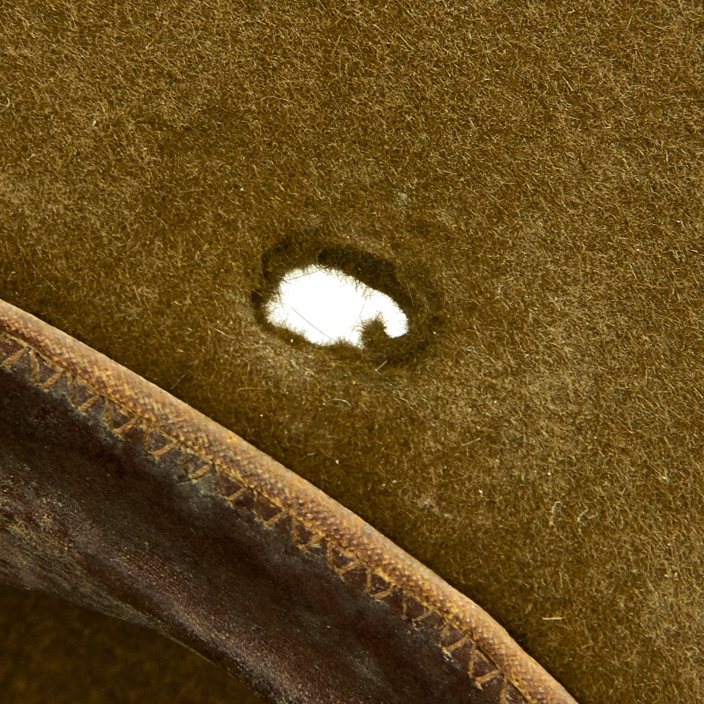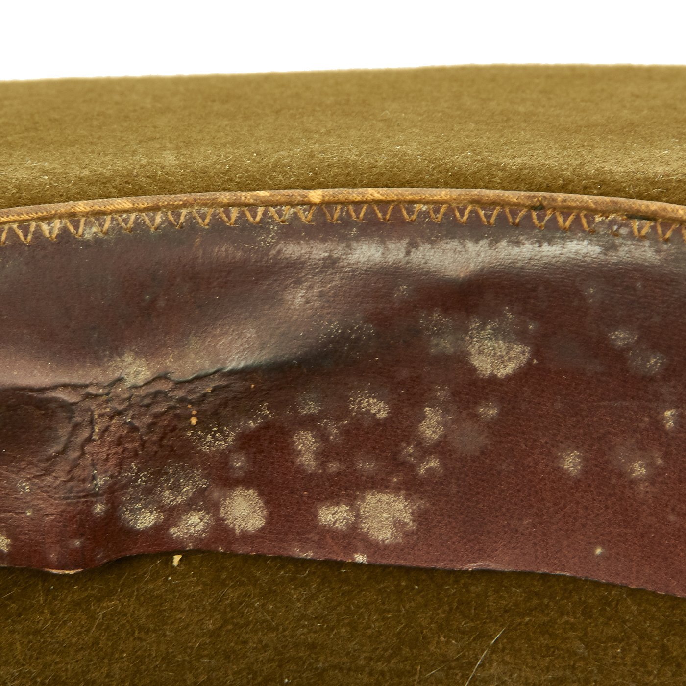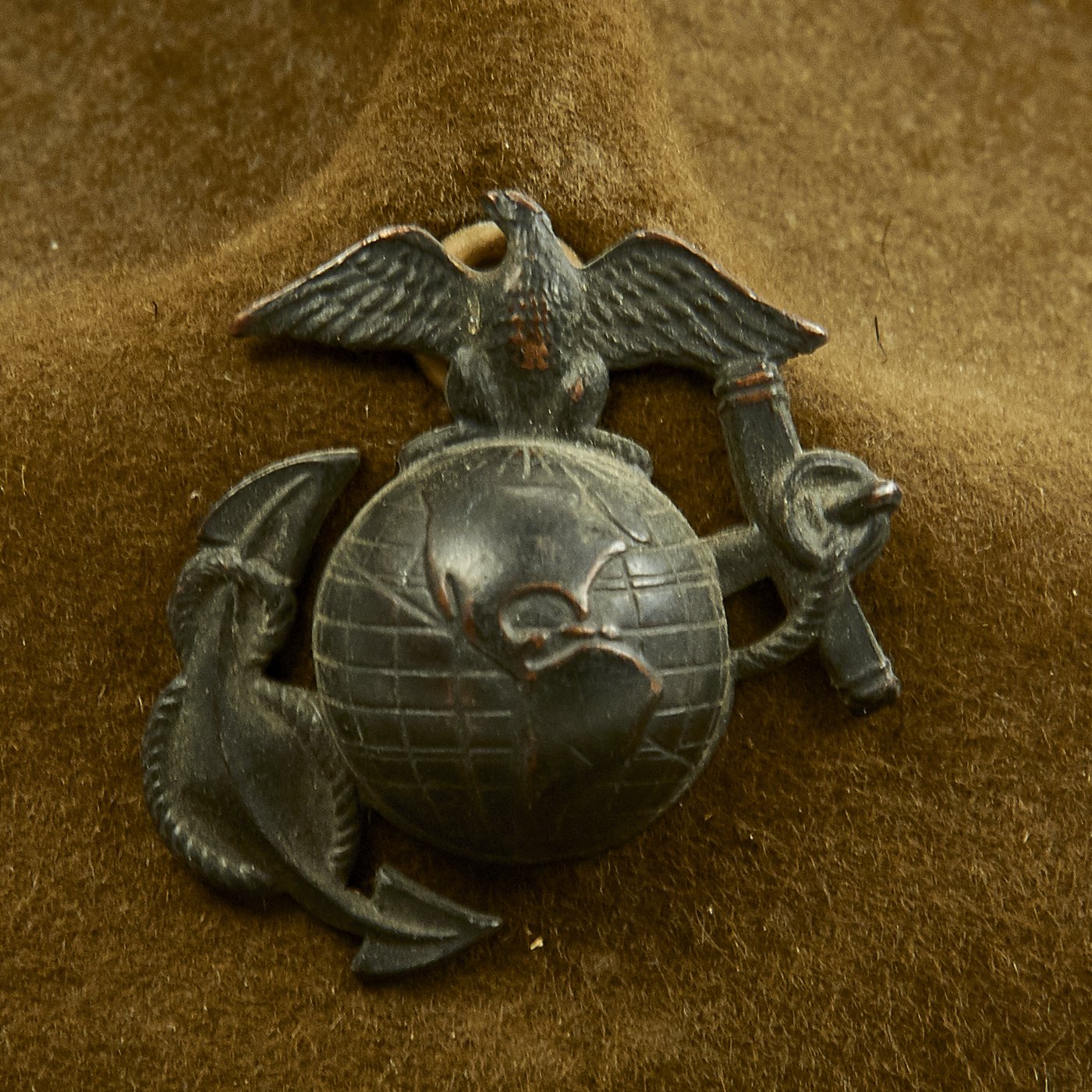 This WWII issue example is very nice, and is made of pressed OD Green felt, which is still quite stiff around the brim. The front crown of the cap of course has a correct WWII issue large U.S. Marine Corps EGA bronze screw back pin, which retains the original blacked finish quite well. It also still has the original band around the outside, used to hide the stitches that attached the liner. The cap has a hole on either side where the brim meets the crown, so most likely at one point it had a chin strap installed.