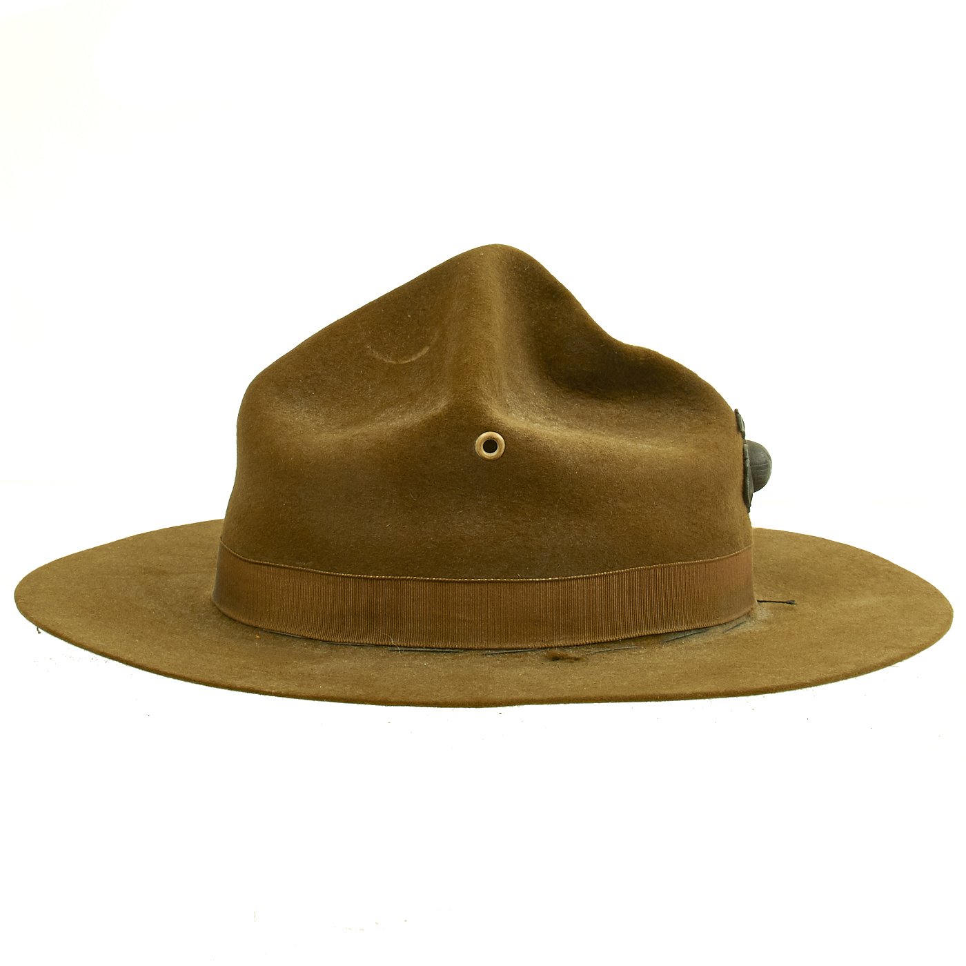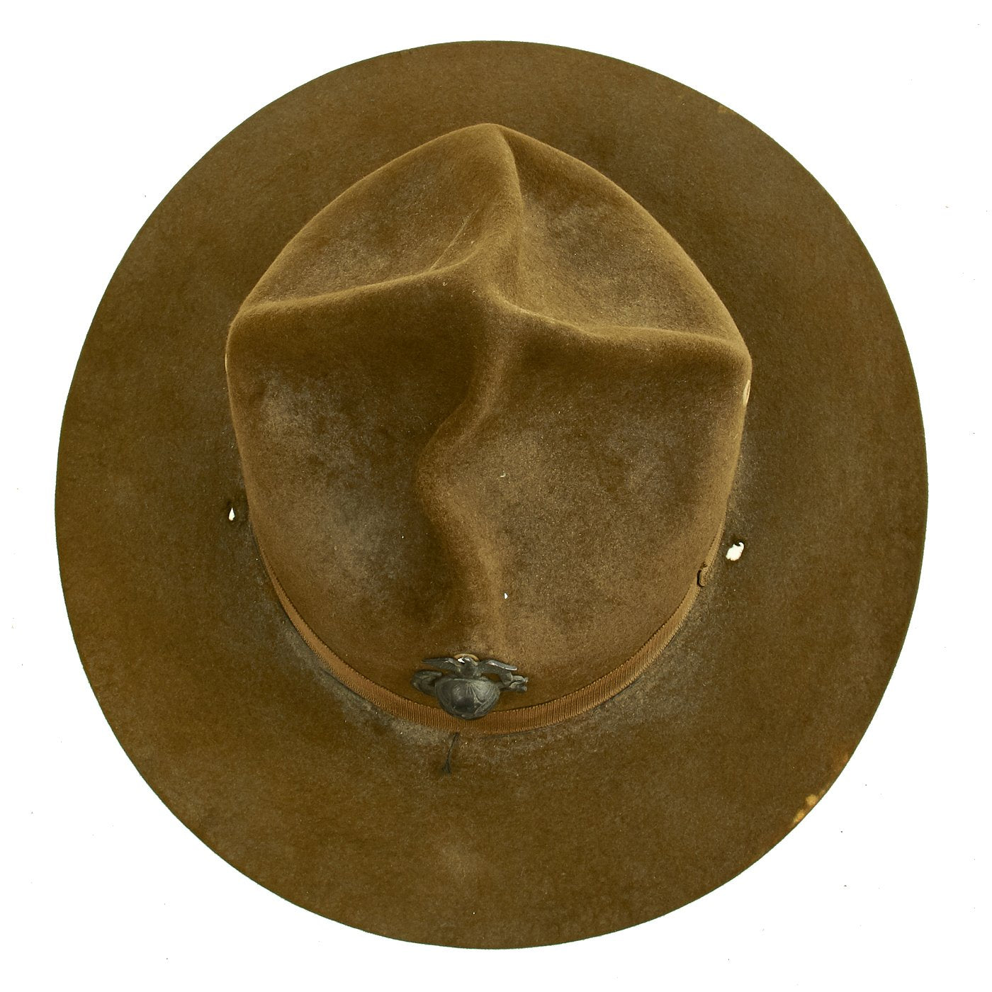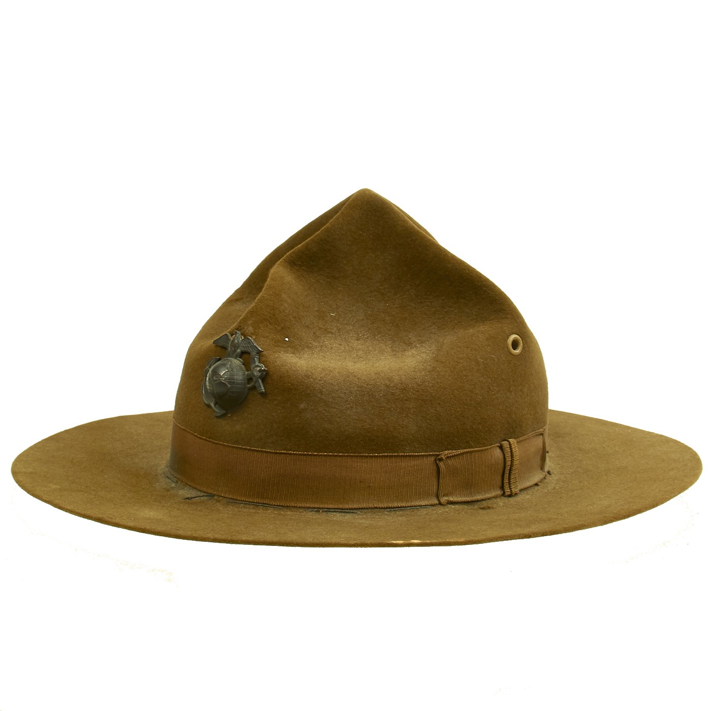 Original Item: Only One Available. This is a very nice WWII Issue U.S. Marine Corps Campaign Hat, often called a "Drill Instructor Cover" in the USMC Today. However, it wasn't until 1956 that these were made the official headwear of Marine Corps Drill instructors, and during WWII they were worn by various different types of personnel, dependent on need and location.