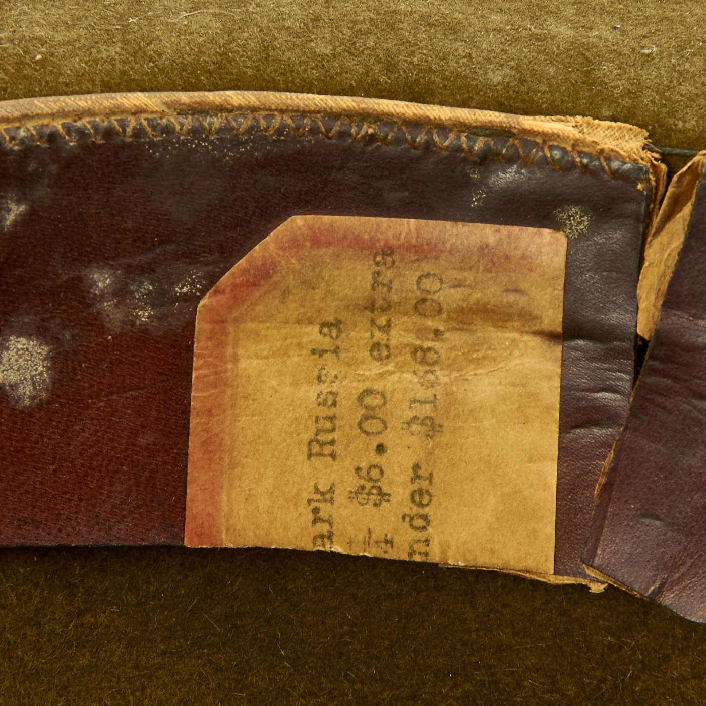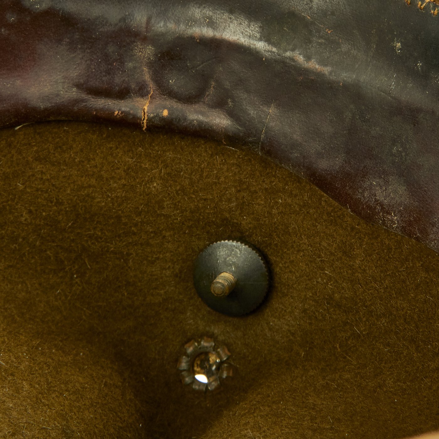 The interior of the cap still has the original leather sweatband, though it is definitely worn from age and sweat. It is cracked in places, and definitely somewhat delicate. There is a small label on the back, however we cannot quite make out what it says.