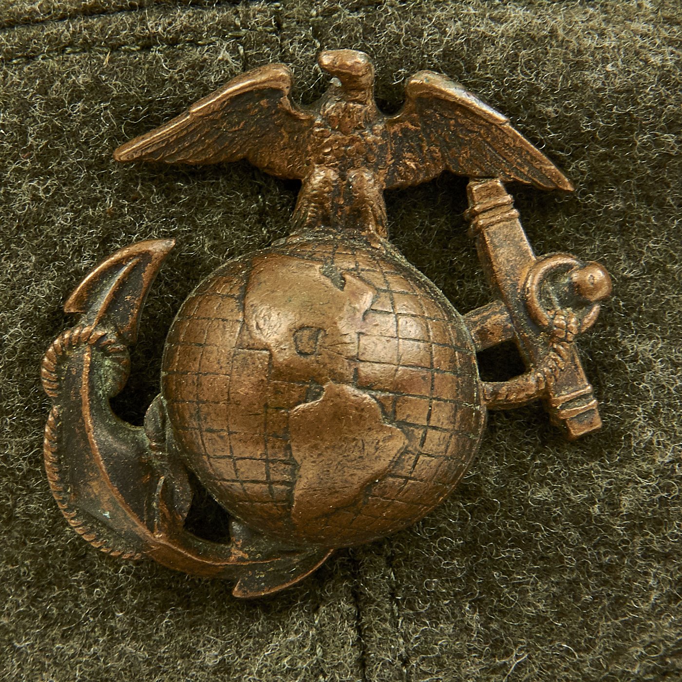 The cap is in very good shape, with just a few month nips, and has a lovely black leather visor to the front, with the usual checking on the finish. It looks to be leather over a fiberboard stiffener. The black leather adjustable chinstrap is secured to the cap with two bronze USMC EGA side buttons, and is in very good shape. The front crown of the cap of course has a large U.S. Marine Corps EGA bronze screw back pin, which retains the original blacked finish quite well.