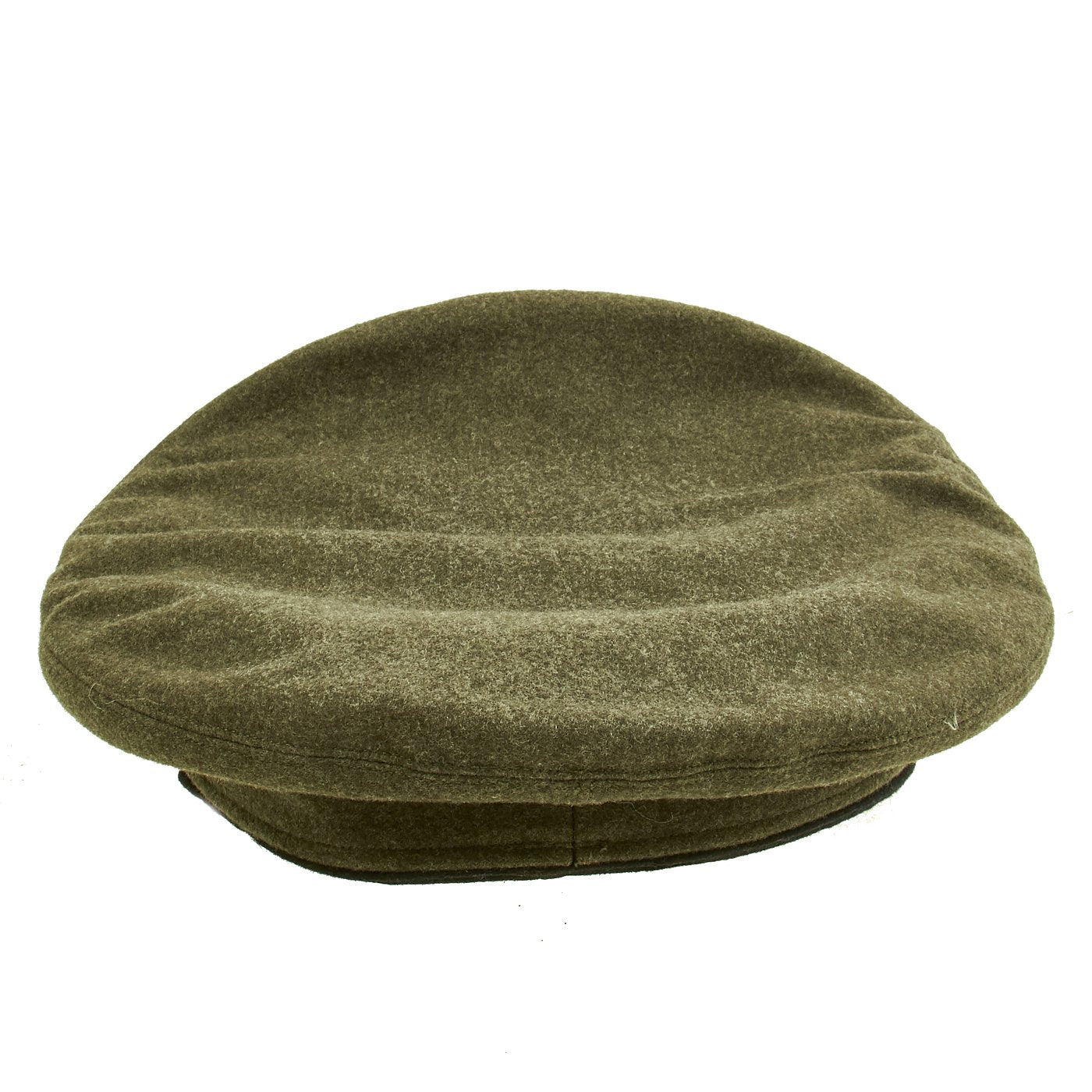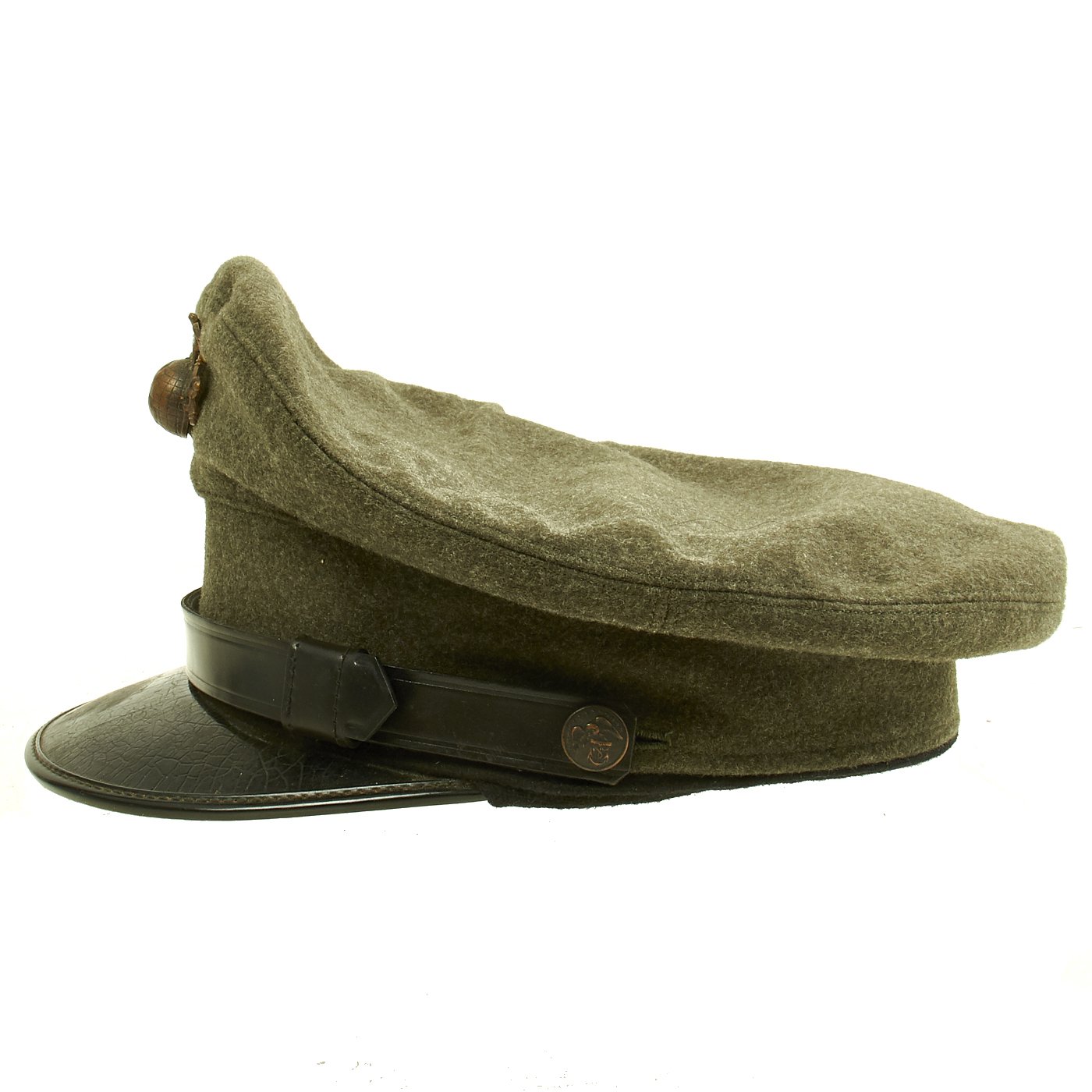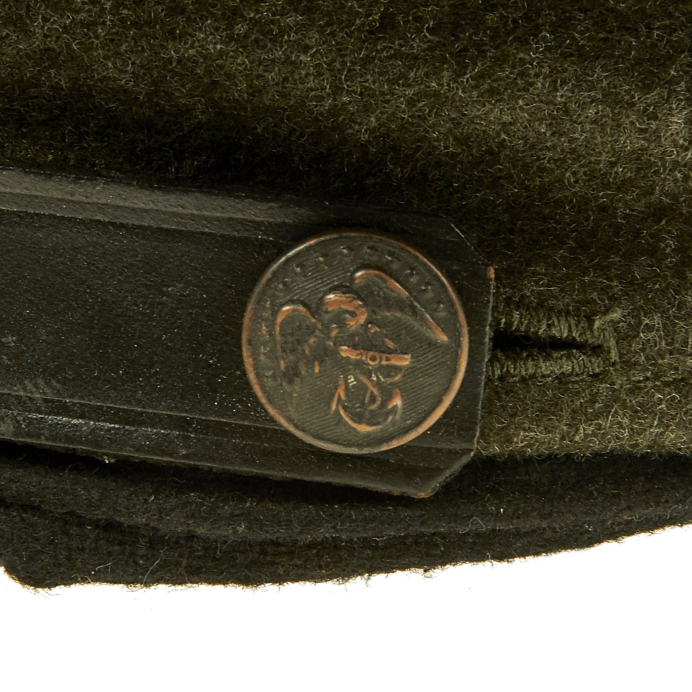 Original Item: Only One Available. This is a very nice WWII Issue U.S. Marine Corps Visor cap, very similar in design to the U.S. Navy "Complete" or "Combination" cap. It utilizes a wicker frame base with with a dark navy blue wool covering, which is what the visor/peak and chin strap are attached to. Then the OD green wool cover is placed over this, and secured in place with the chin strap. This way, the Marine would not need to buy a different cap to use with his dress blue uniform.