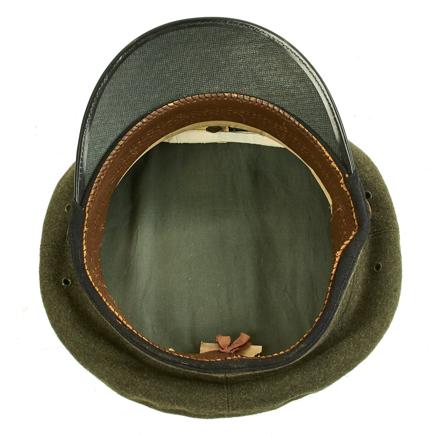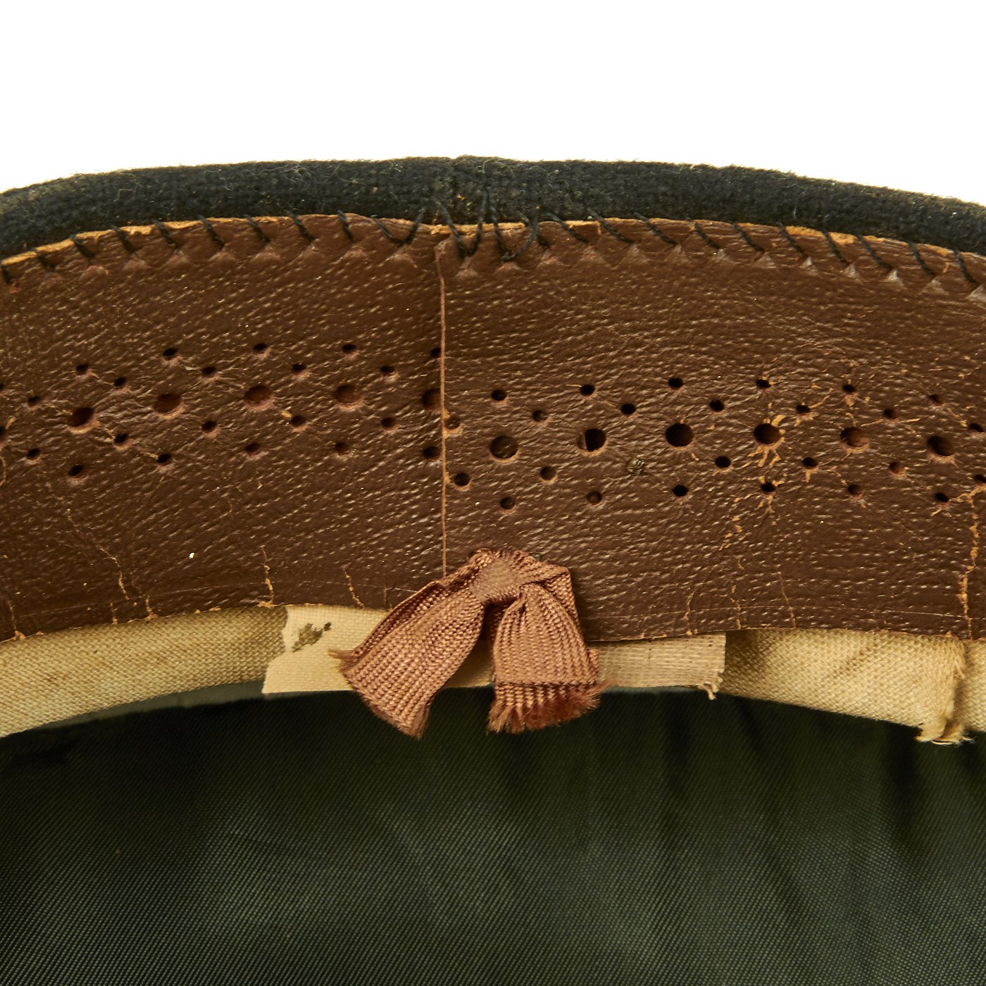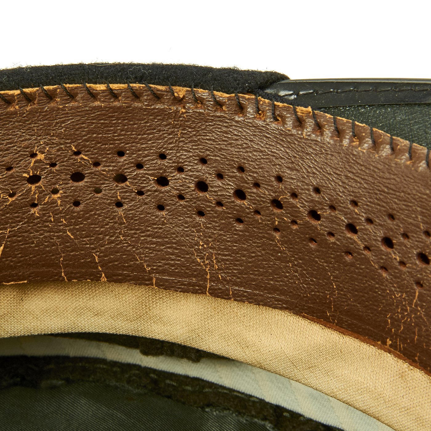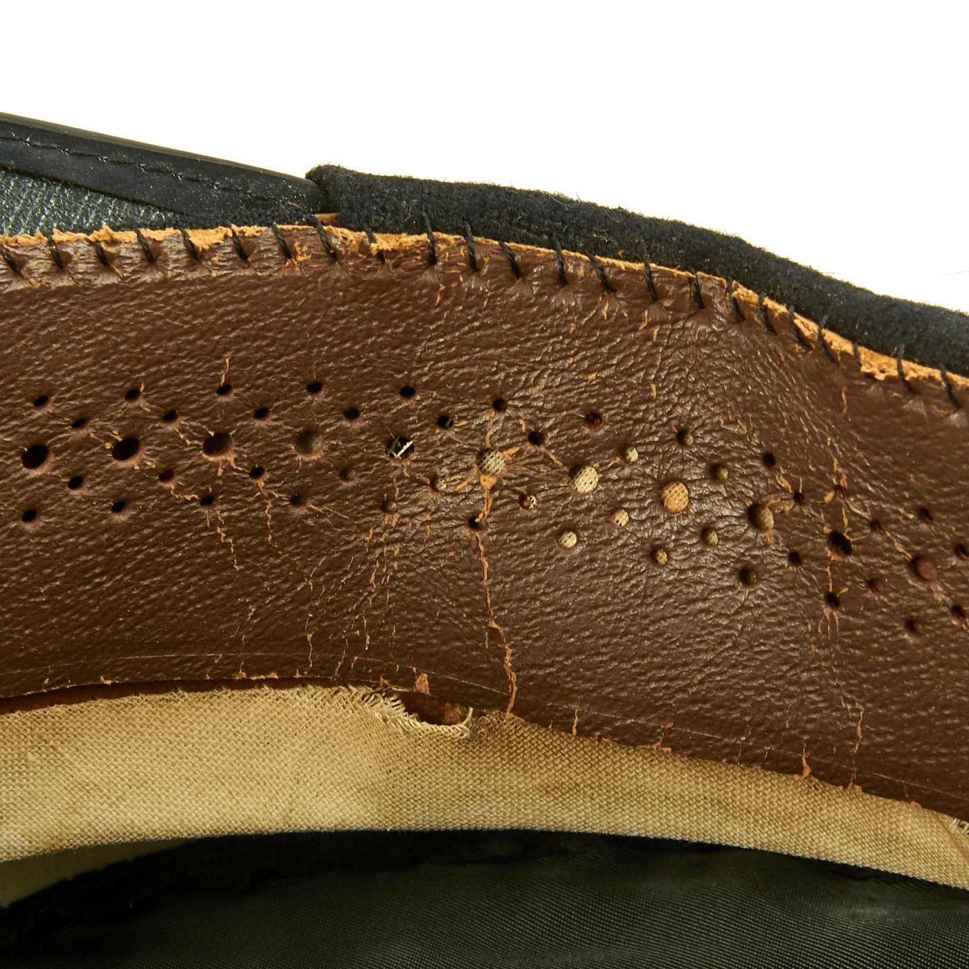 The interior is sheer green fabric, and is in good condition, with the original crown stiffener still present, though it is somewhat bent and does not support the crown anymore. There is a small 7 size tag inside the cap, which is loose and falling apart unfortunately. The sweatband is leather, however it also is a bit deteriorated, and is in fragile condition. The stitching however is still mostly intact, something we don't usually see.