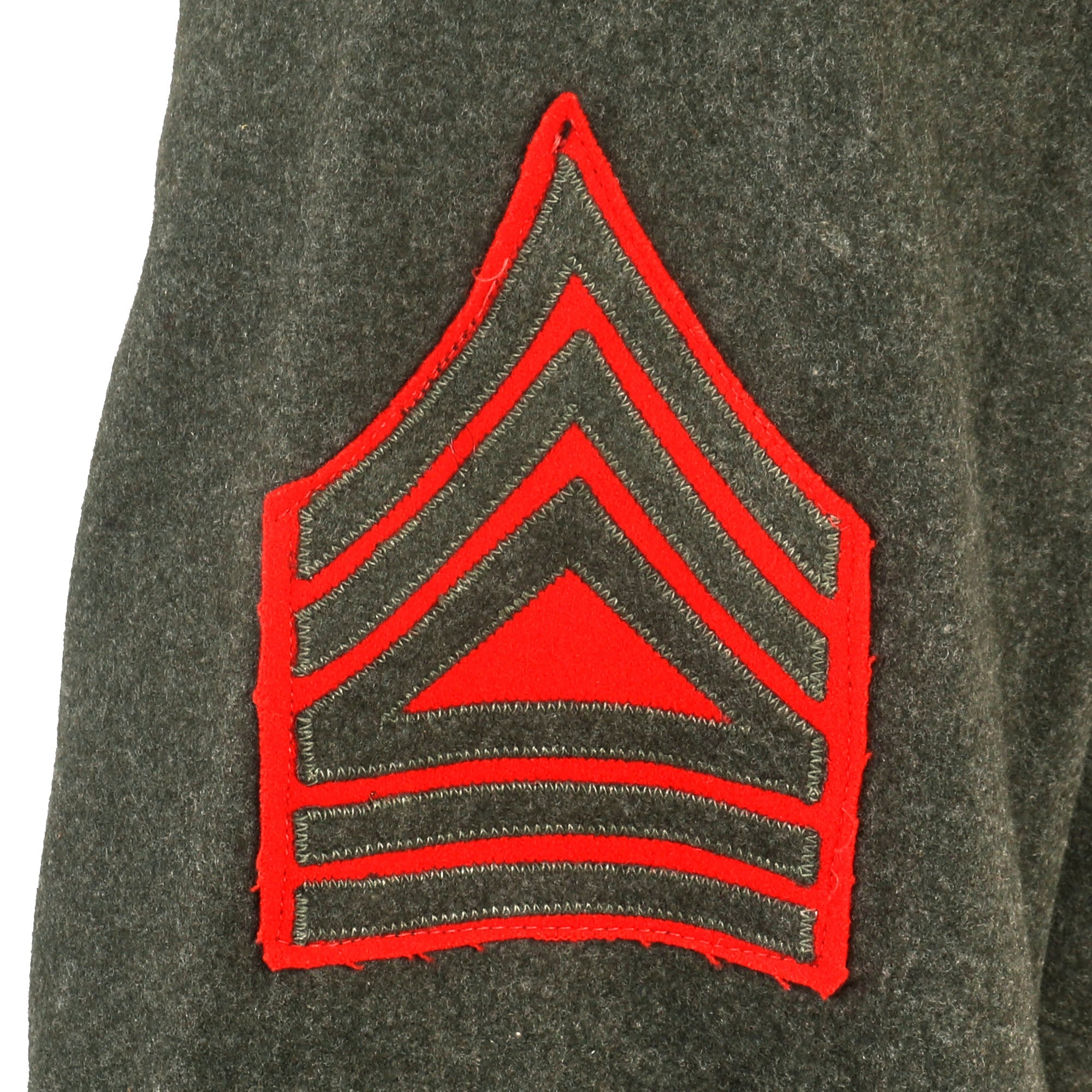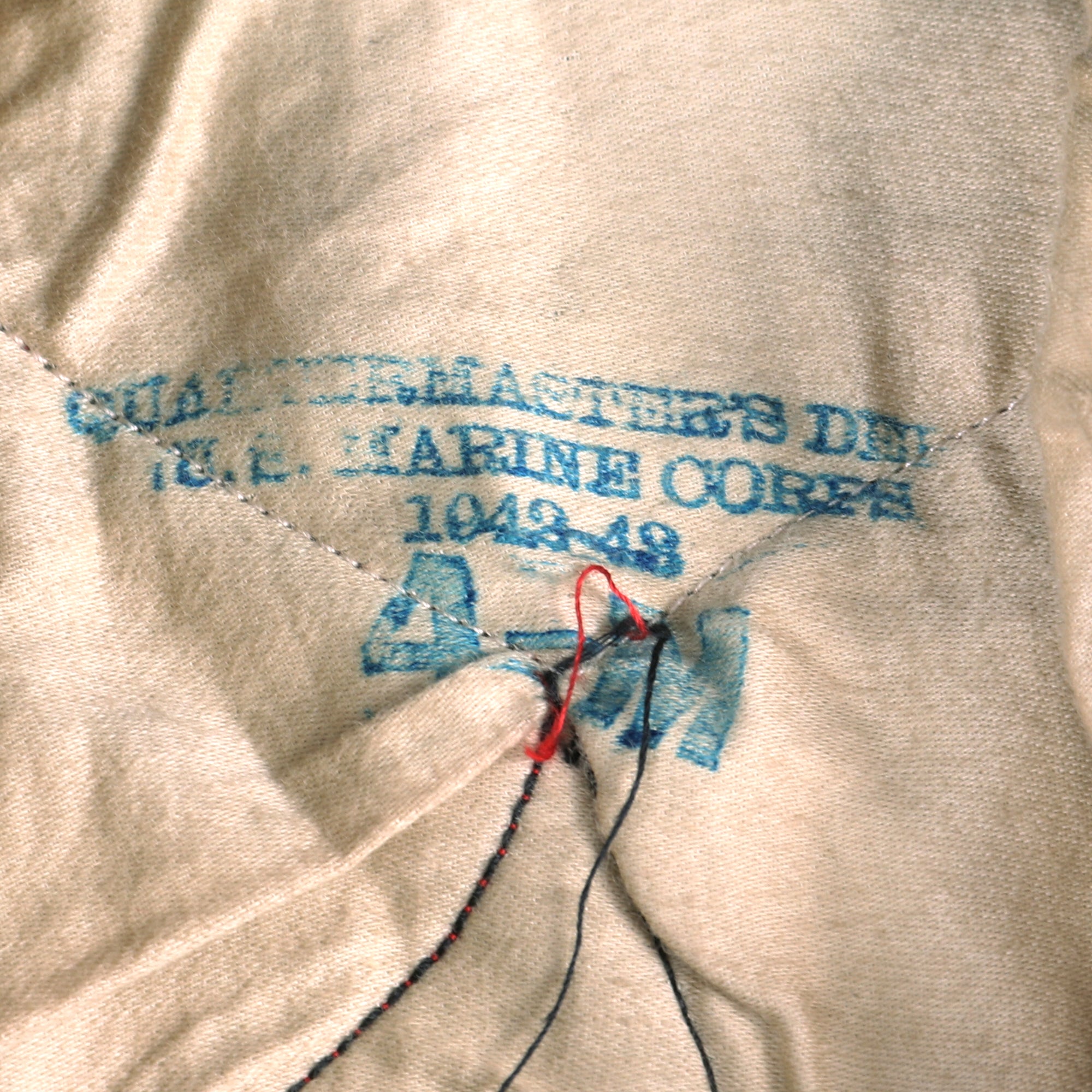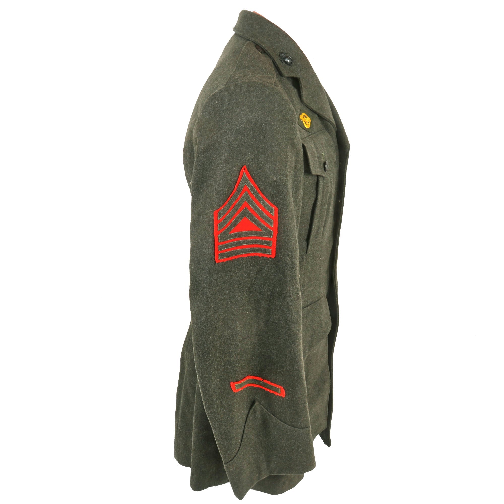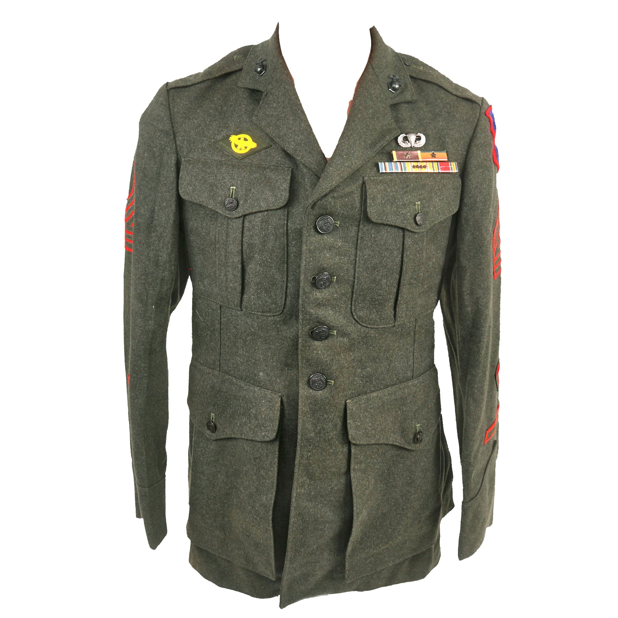 The jacket bears a gorgeous 1st Marine Parachute Regiment patch on red felt backing on the left shoulder, with Master Technical Sergeant chevrons on both sleeves. On both cuffs are one service stripe, denoting 4 years of service. Above this on the left cuff is a red Parachutist qualification patch. There are Enlisted Marine EGA collar insignia, and a “Ruptured Duck” Honorable Discharge badge above the right breast pocket. Above the left breast pocket is a likely Sterling set of Jump Wings with a pinback, and below this is a 5-place ribbon bar with the Purple Heart with a Gold Star, the Navy Presidential Unit Citation with a star, the American Campaign Medal, the Pacific Campaign Medal with four campaign stars, and the US WWII Victory Medal. The jacket is dated on the interior left shoulder with a USMC Quartermaster stamp of 1942-1943.