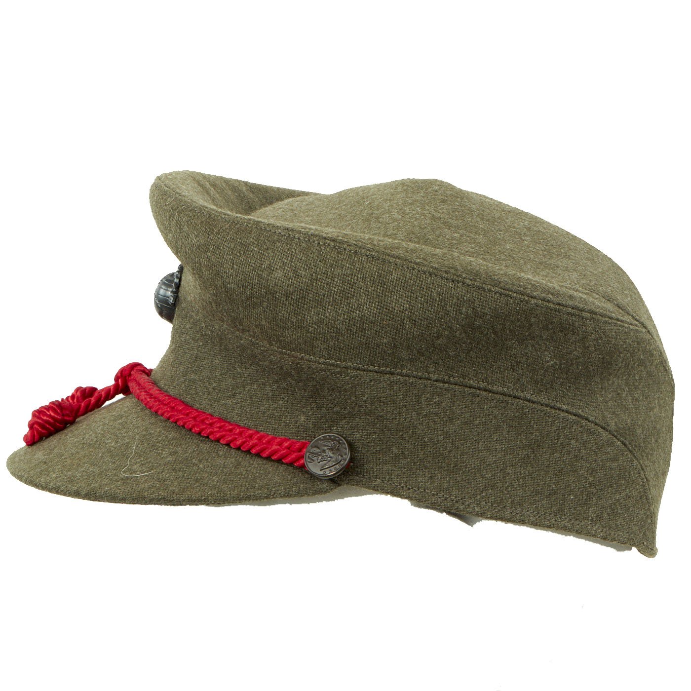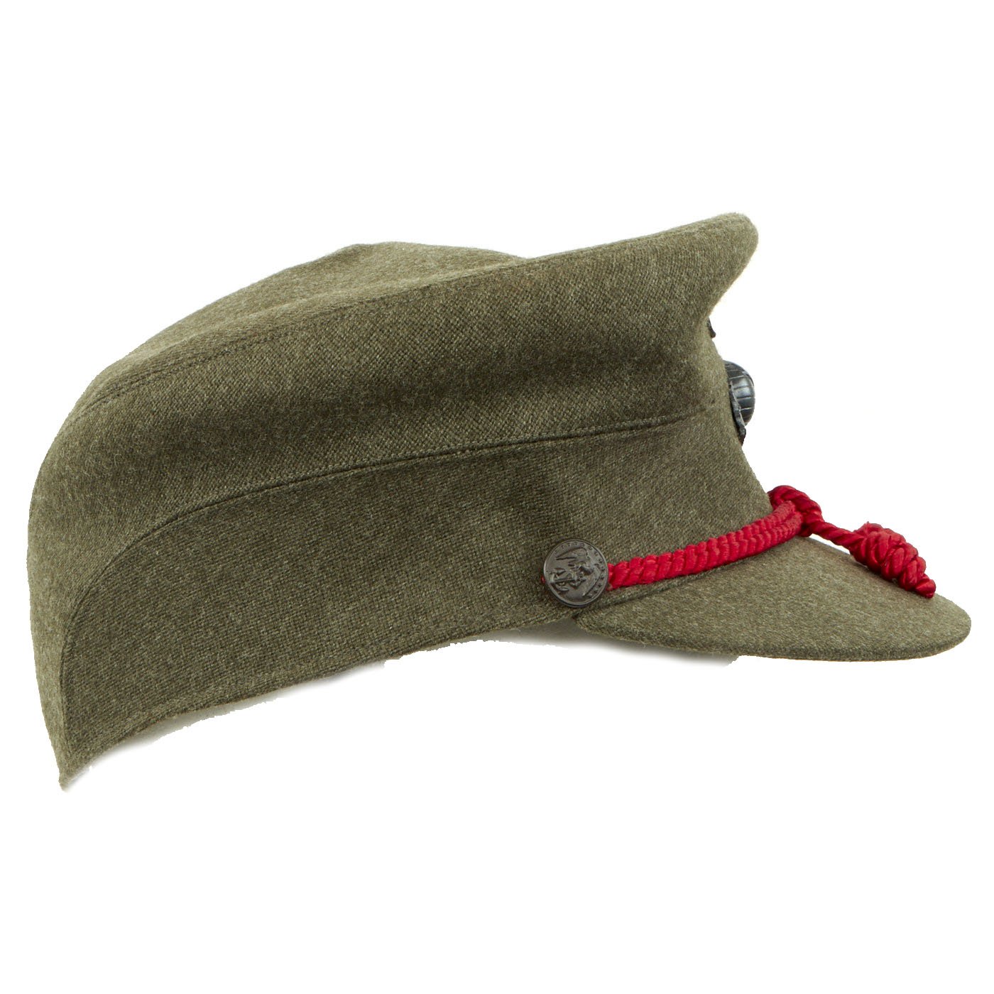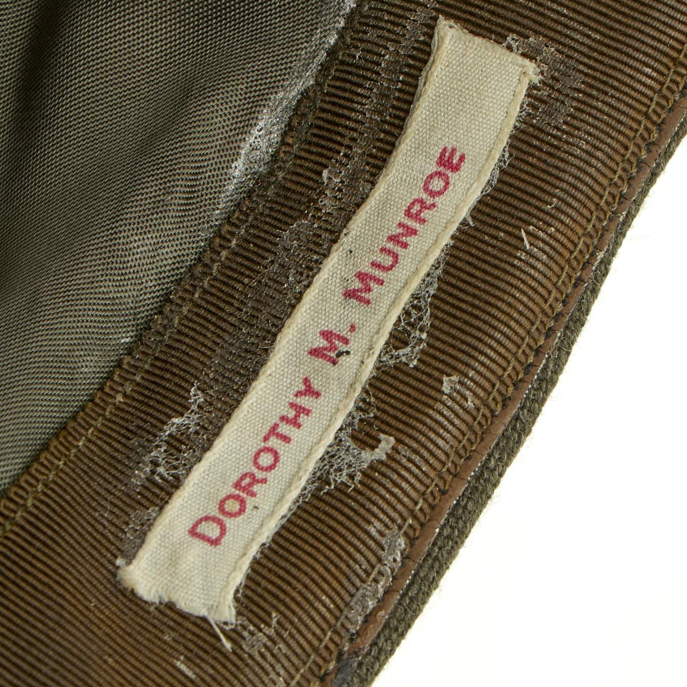 This USMC Marine US WW2 WOMEN'S WINTER WOOL SERVICE DRESS VISOR CAP is in excellent shape, with no damage to the tough forest green wool construction. boasts the classic knotted red hat cord with brown plastic side buttons, and has a rayon crown lining. Size the reads 23 1/2 and has a name tag to Dorothy M. Monroe. A fine example of a rare, original USMC Marine US WW2 WOMEN'S WINTER WOOL SERVICE DRESS VISOR CAP.