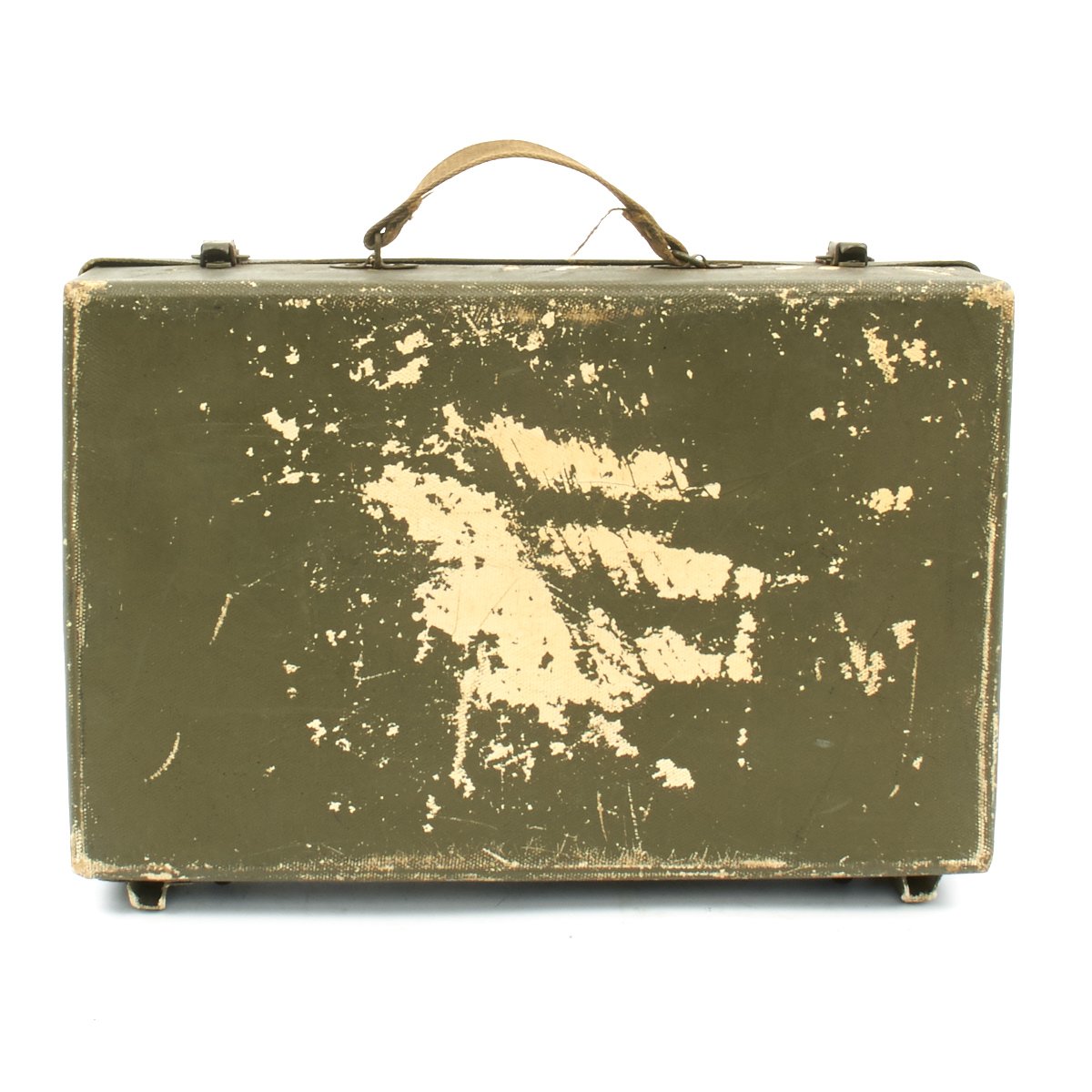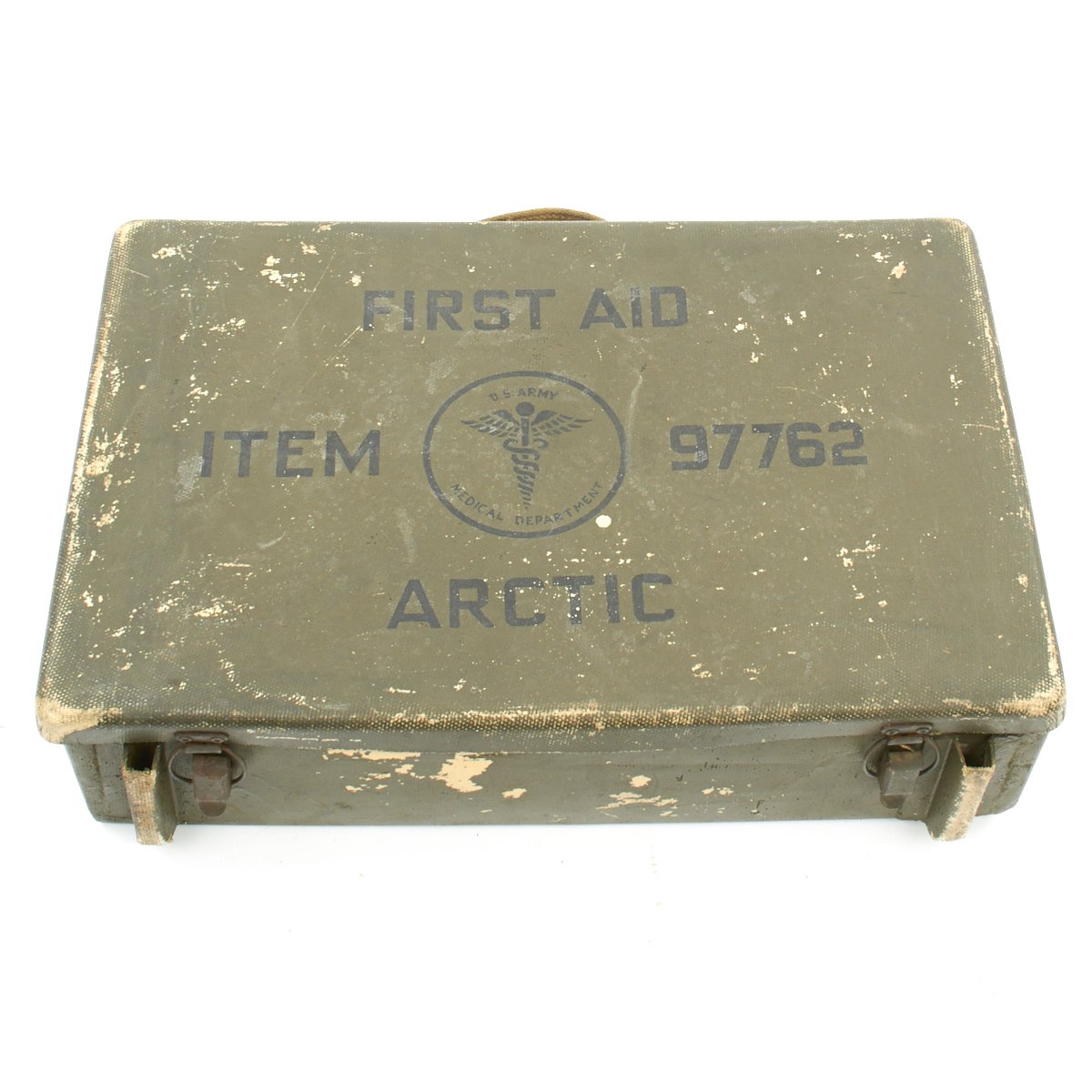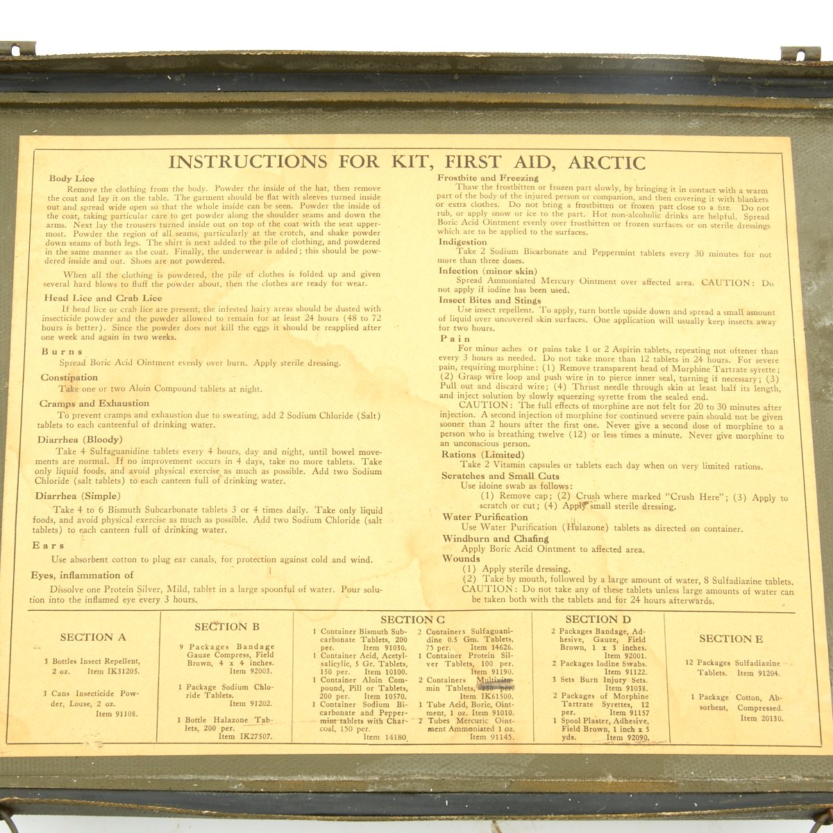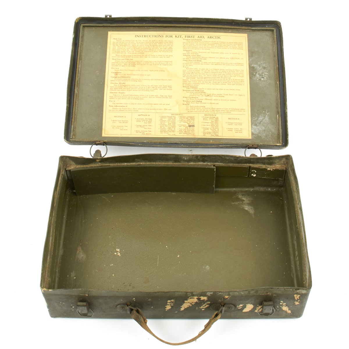 Original Item: Only One Available. Extremely rare very good condition U.S. WW2 Arctic First Aid Kit Case with original paper instruction and contents paper label which mounted to the inside lid. All clasps are in working order and it features original paint. The exterior is stenciled in black paint: