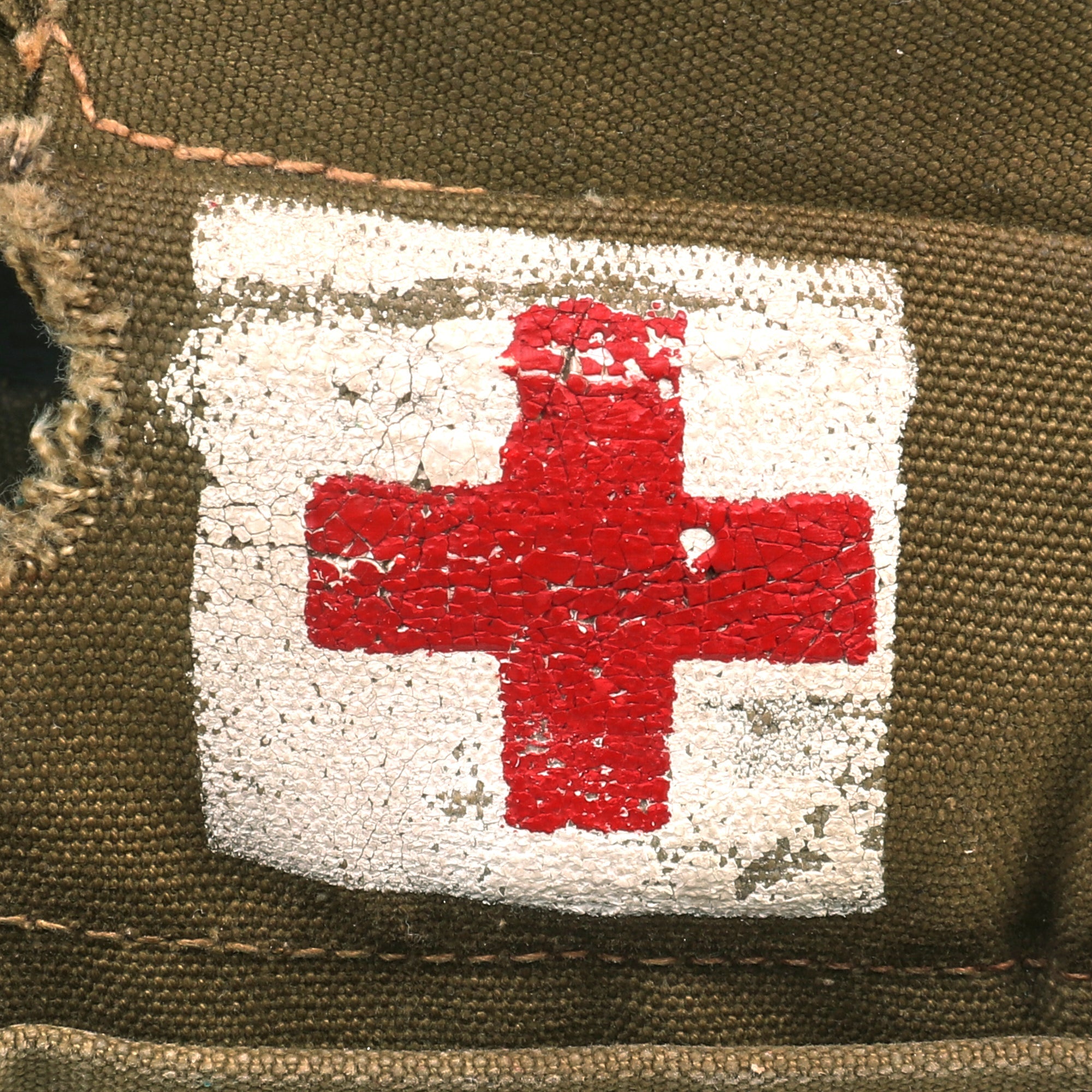 -Pouch, marked MEDICAL DEPARTMENT U.S.A. with Red Cross painted on bottom. Many holes from mice.