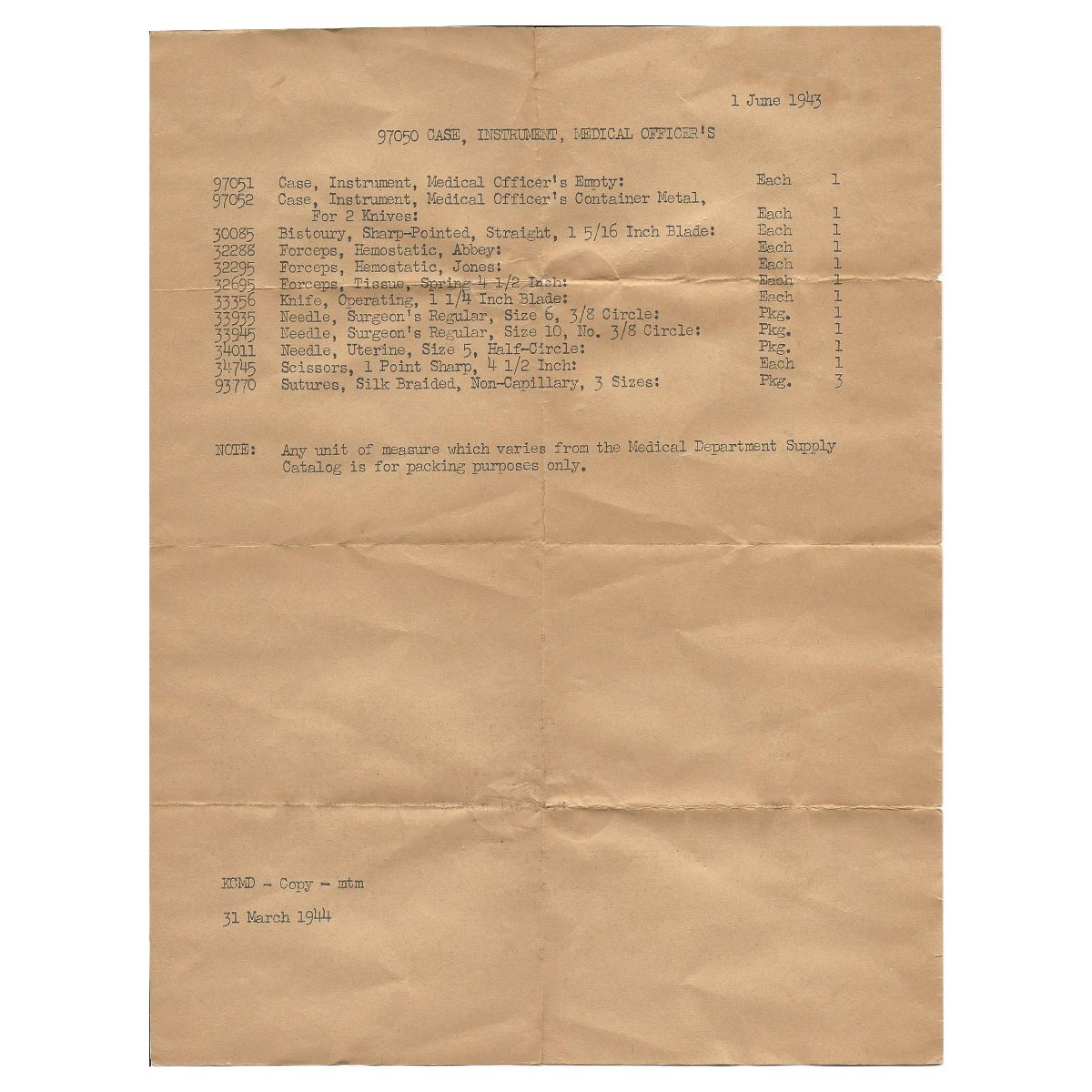 Original Items: Only One Available. This is a nice complete genuine WWII U. S. Medical Officer's Case Field Surgical Kit Roll, in unissued condition. It comes complete with an original 1943/44 dated contents list still with the original and complete contents: