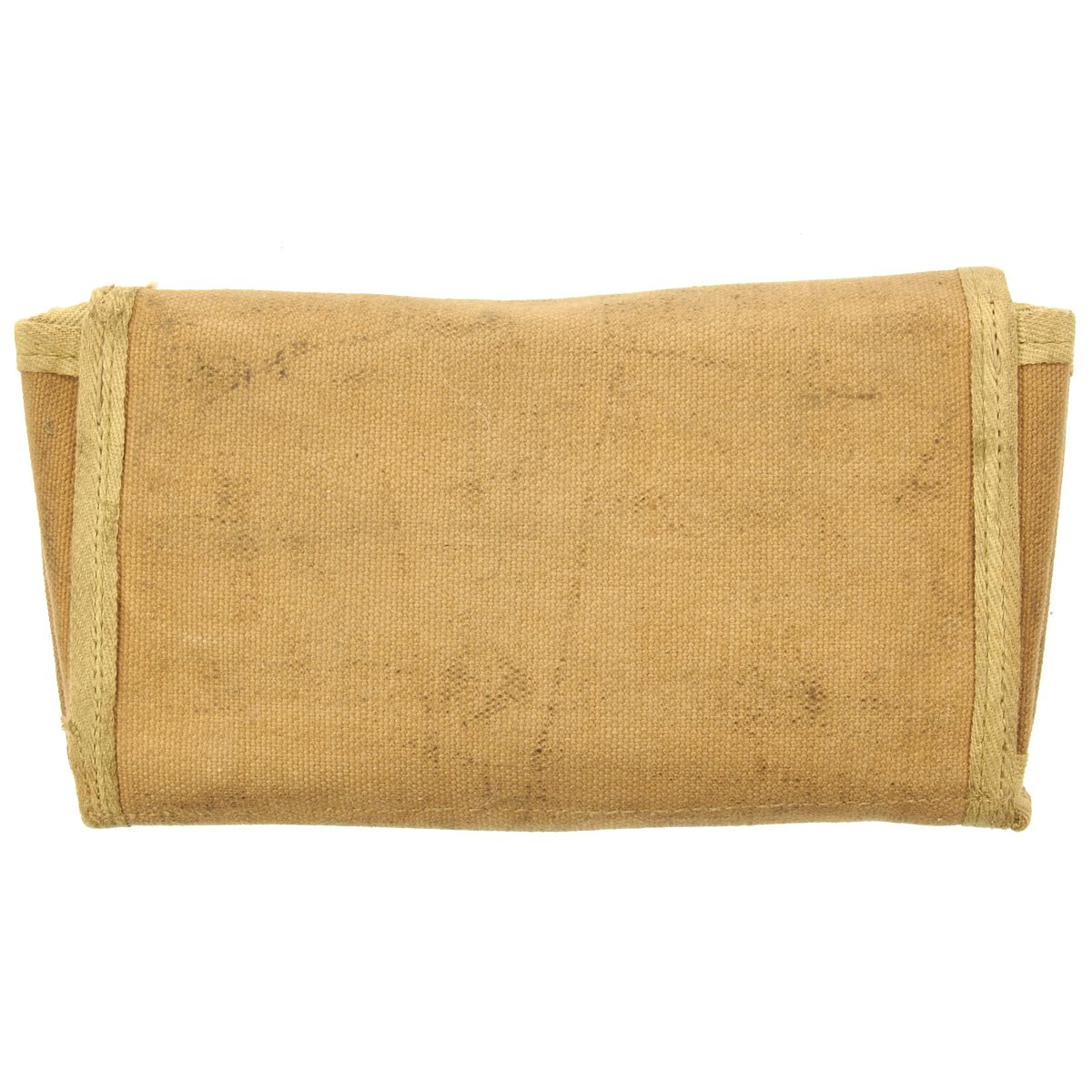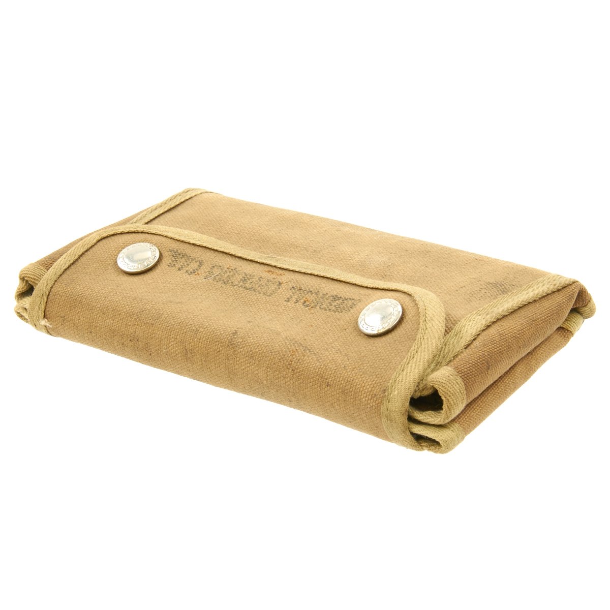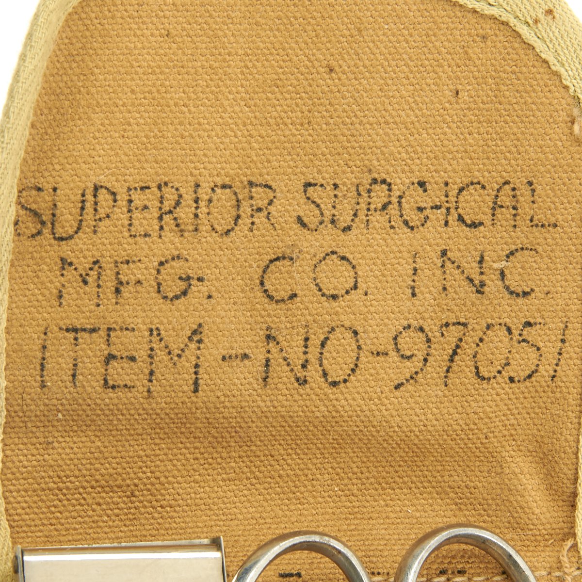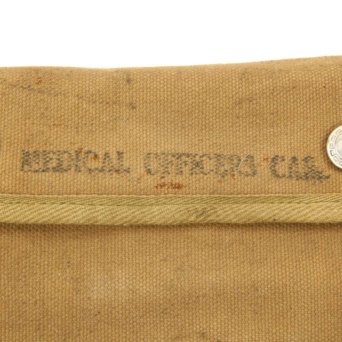 - Original unissued Medical Officer's Field Surgical kit roll Case, marked: MEDICAL OFFICERS CASE between the two snaps that hold it closed. The inside has slots for the various tools, complete with ink stamped outlines to aid in packing. It is also maker marked: SUPERIOR SURGICAL / MFG CO. INC. / ITEM-NO-97051.