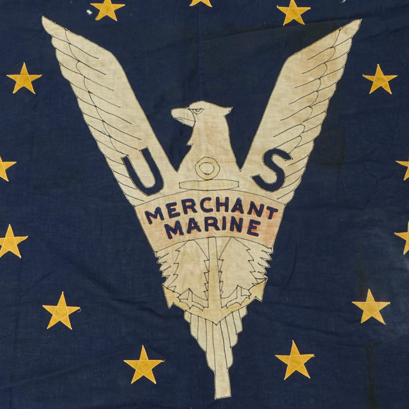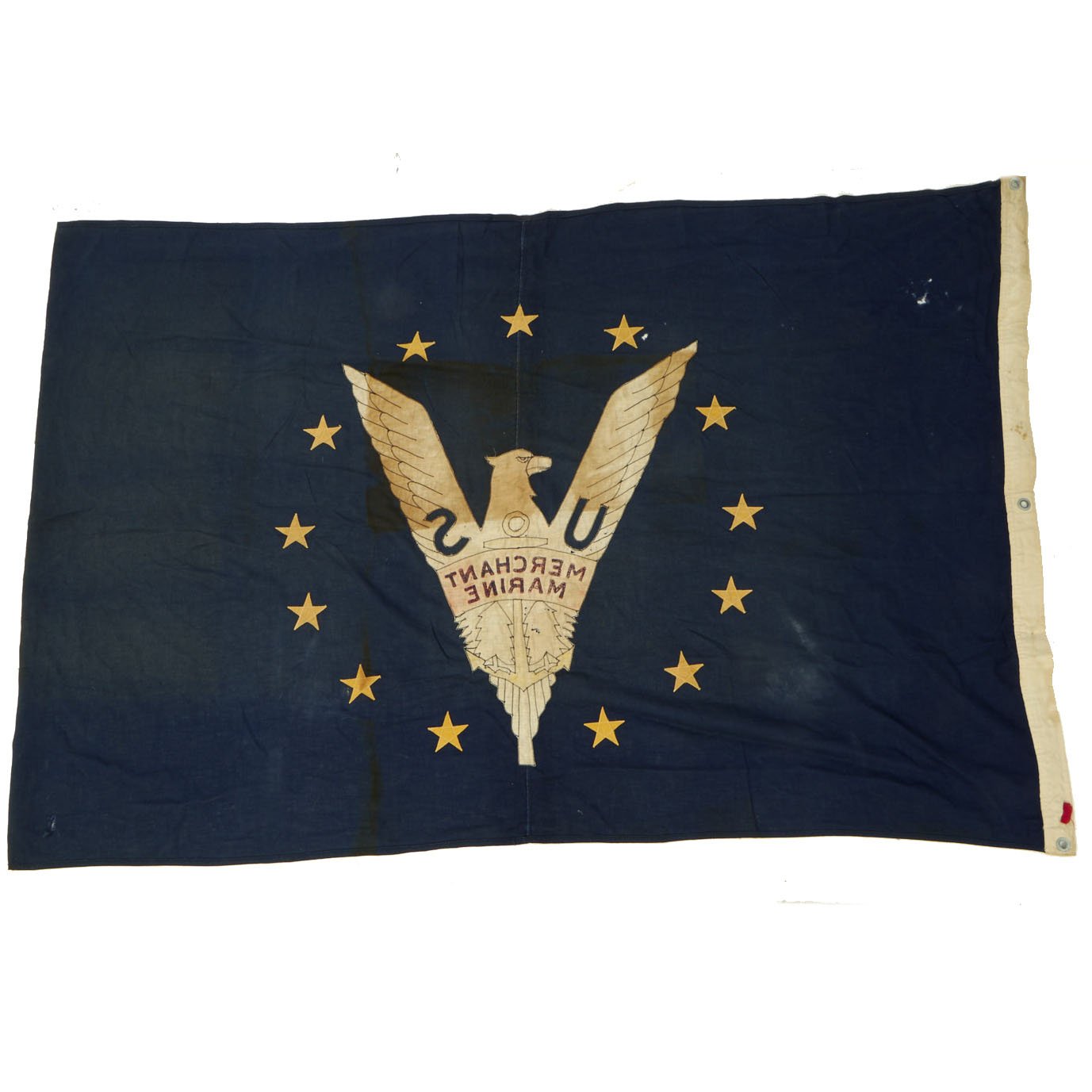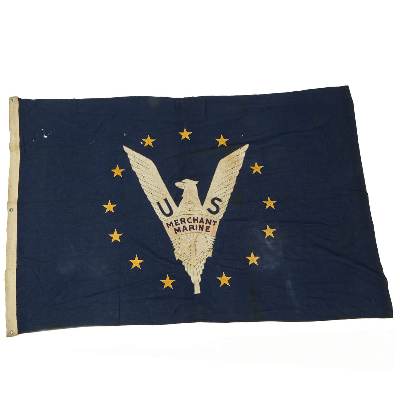 This is a very nice World War Two Era U.S. Merchant Marine flag, in a nice displayable 44" x 67" size, about 3.67 x 5.5 feet. The flag body is of multi-piece cotton construction, with the design made up of separate pieces sewn onto the flag. The center of the flag has a lovely 'V' shaped (for Victory) eagle, with U S and MERCHANT MARINE on the chest area over an anchor. This is then surrounded by 13 yellow stars in a circle, for the original 13 colonies. It has metal grommets at both ends of the header as well as one in the middle for flying the flag. From what we can tell, there were not much in the way of "official" flags during WWII for the Merchant Marine, so this was most likely custom made.