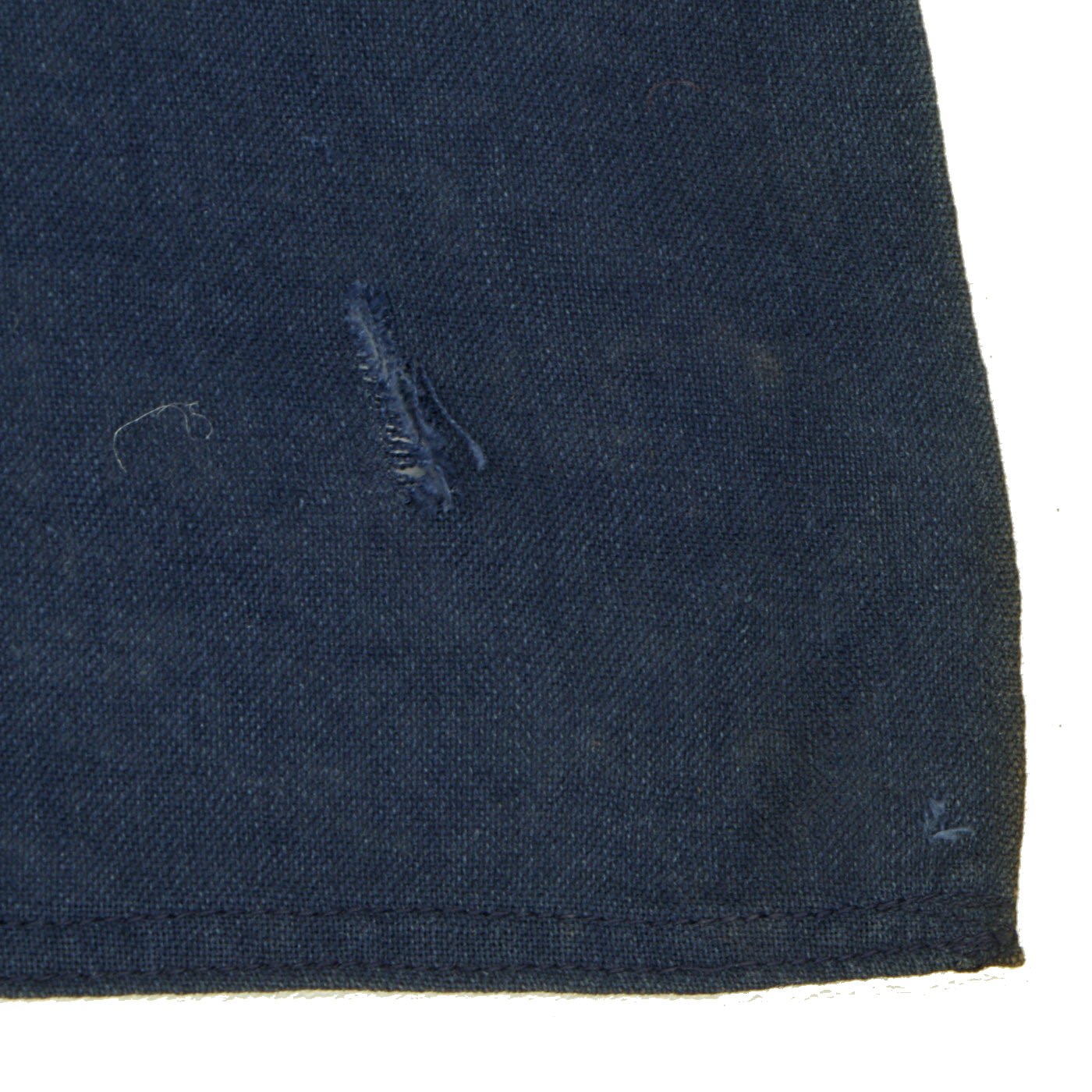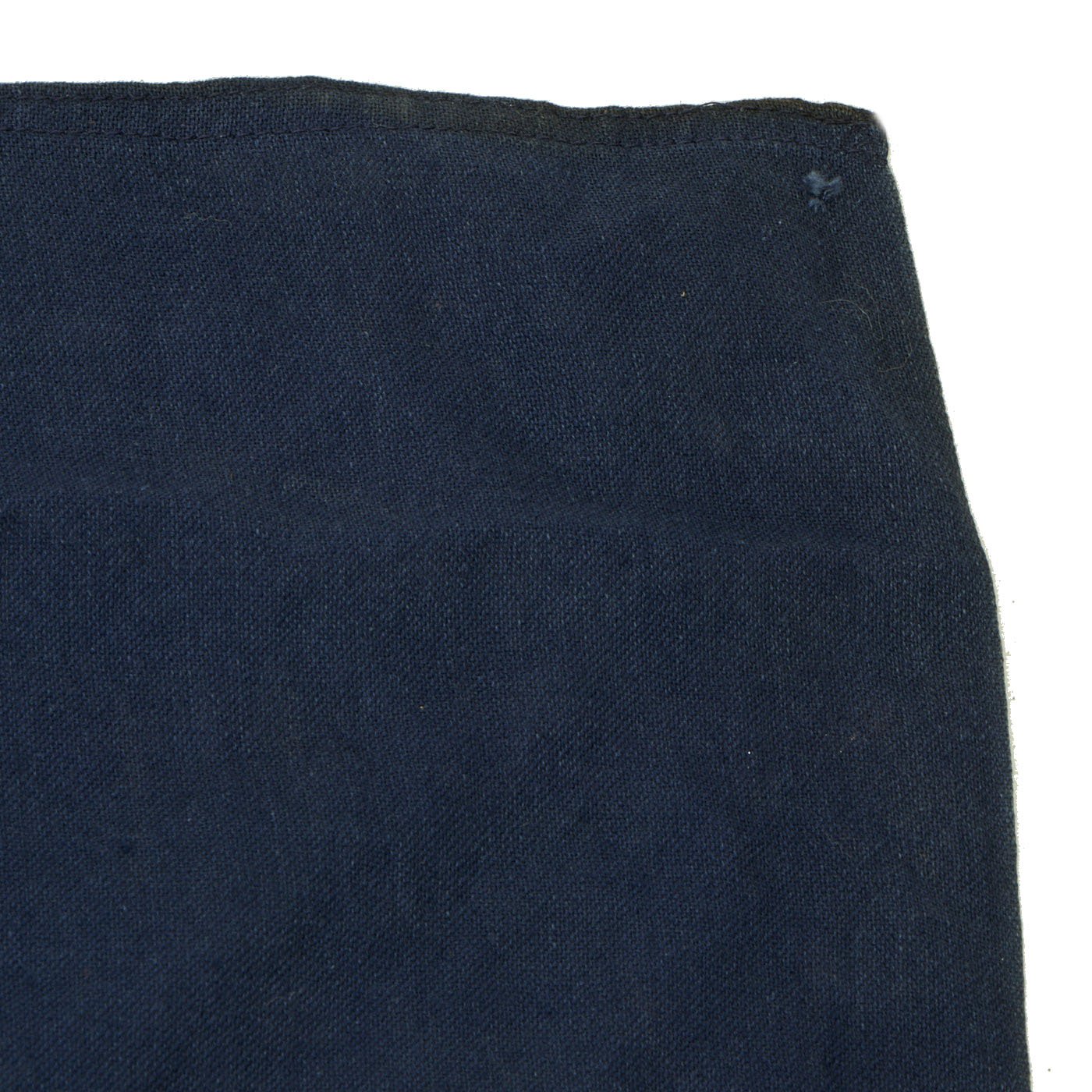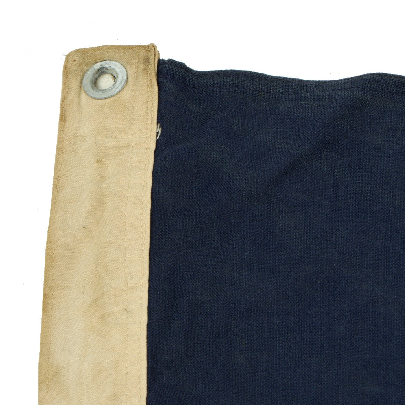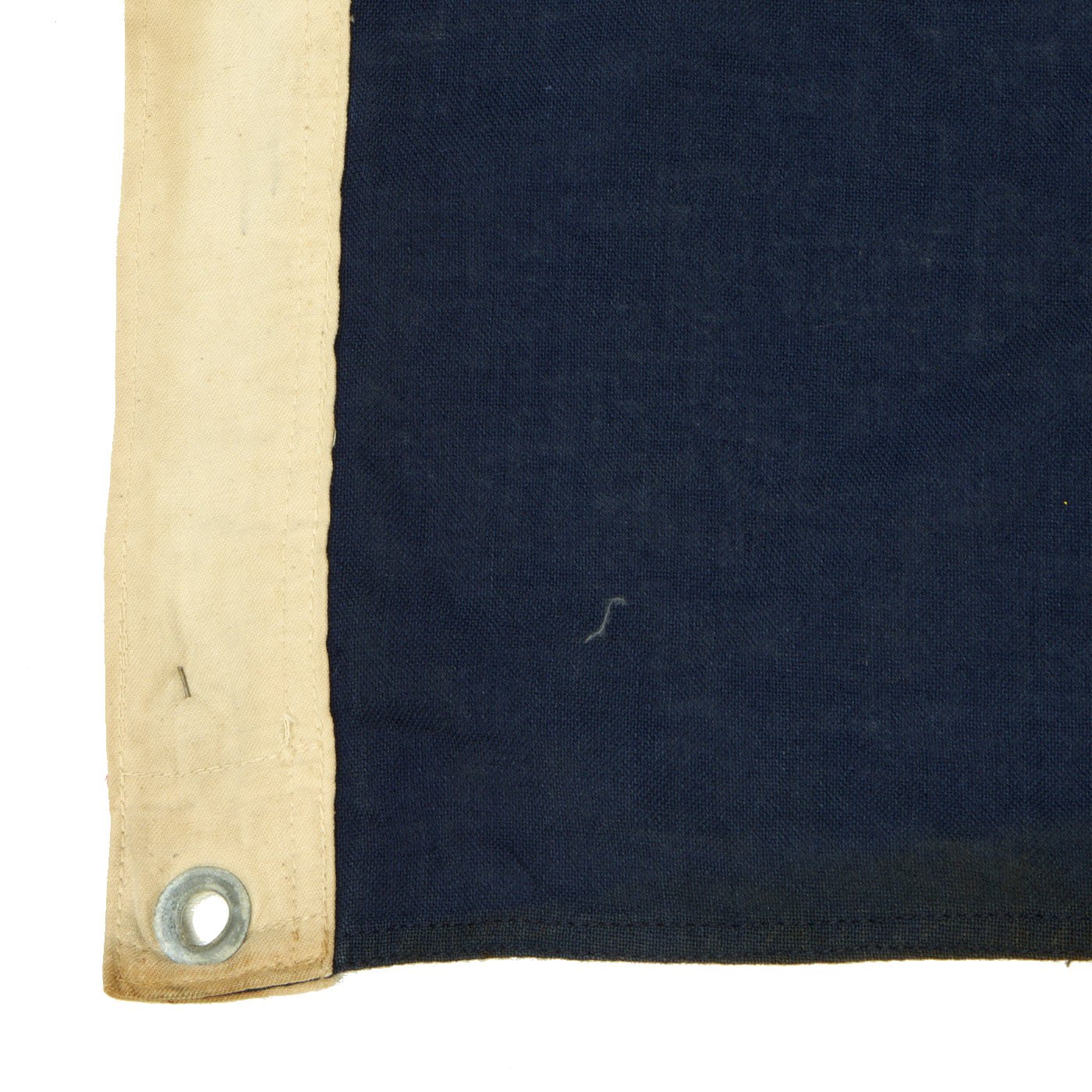 This is a very nice World War Two Era U.S. Merchant Marine flag, in a nice displayable 44" x 67" size, about 3.67 x 5.5 feet. The flag body is of multi-piece cotton construction, with the design made up of separate pieces sewn onto the flag. The center of the flag has a lovely 'V' shaped (for Victory) eagle, with U S and MERCHANT MARINE on the chest area over an anchor. This is then surrounded by 13 yellow stars in a circle, for the original 13 colonies. It has metal grommets at both ends of the header as well as one in the middle for flying the flag. From what we can tell, there were not much in the way of "official" flags during WWII for the Merchant Marine, so this was most likely custom made.