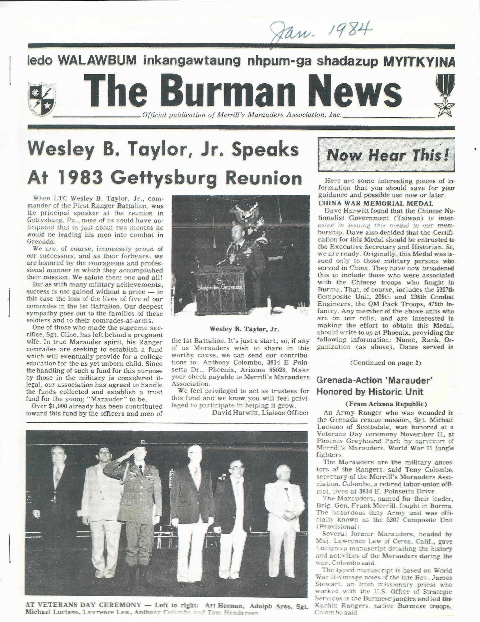 The Unit was officially designated as the "5307th Composite Unit (Provisional)" Code Name: "GALAHAD", later it became popularly known as "MERRILL'S MARAUDERS" named after its leader, Brigadier General Frank Merrill. Formed into six combat teams (400 per team),color-coded Red, White, Blue, Green, Orange and Khaki, two teams to a Battalion, the rest formed the H.Q. and Air Transport Commands.