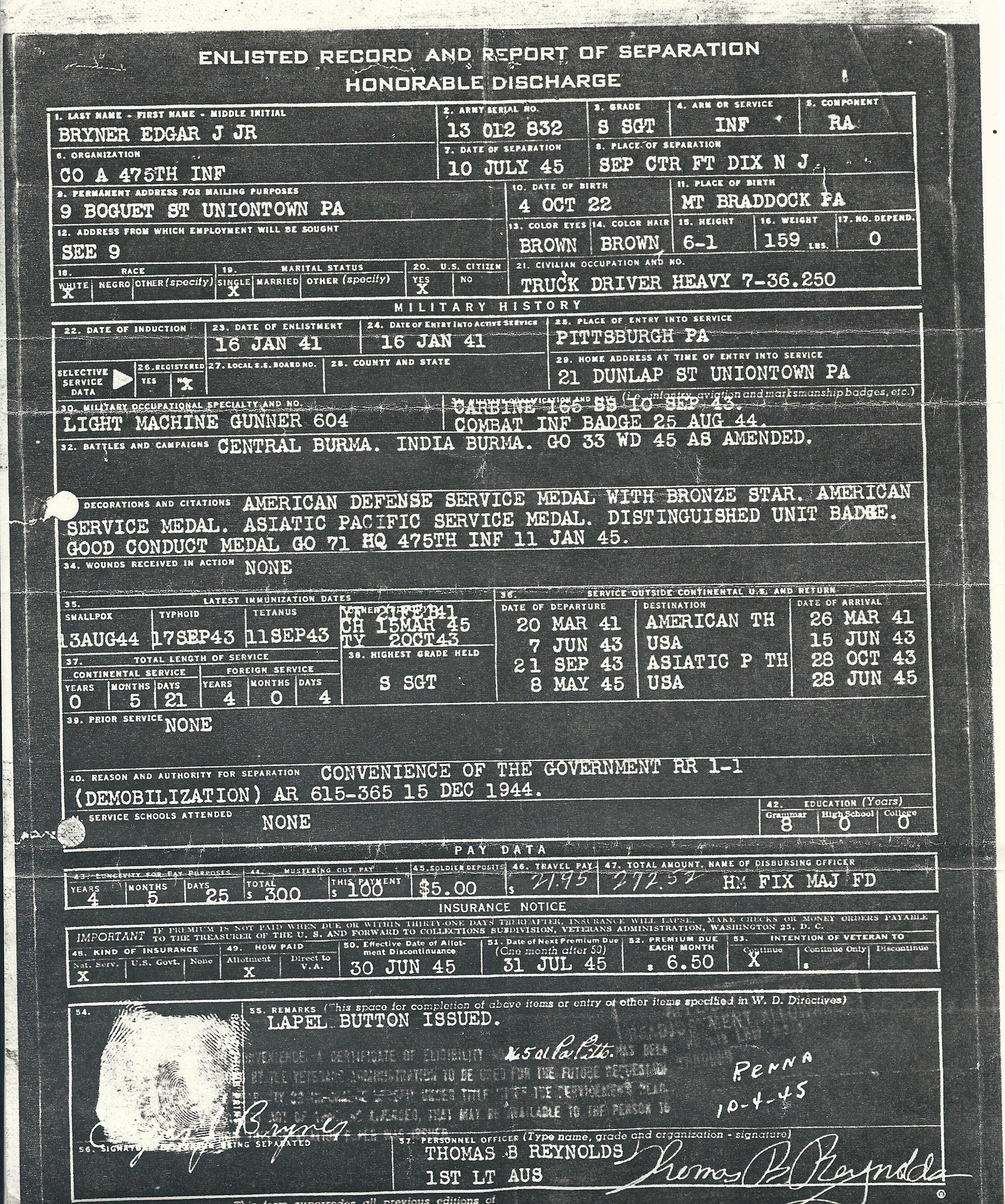 Original Items: On-of-a-kind set. Staff Sergeant Edgar Bryner Jr. was a member of the Company A in the 475th Infantry Regiment. Merrill’s Marauders (named after Frank Merrill) or Unit Galahad, officially named the 5307th Composite Unit (Provisional) which was changed in 1944 to the 475th Infantry Regiment, was a United States Army long range penetration special operations jungle warfare unit, which fought in the South-East Asian theatre of World War II, or China-Burma-India Theater (CBI). The unit became famous for its deep-penetration missions behind Japanese lines, often engaging Japanese forces superior in number.