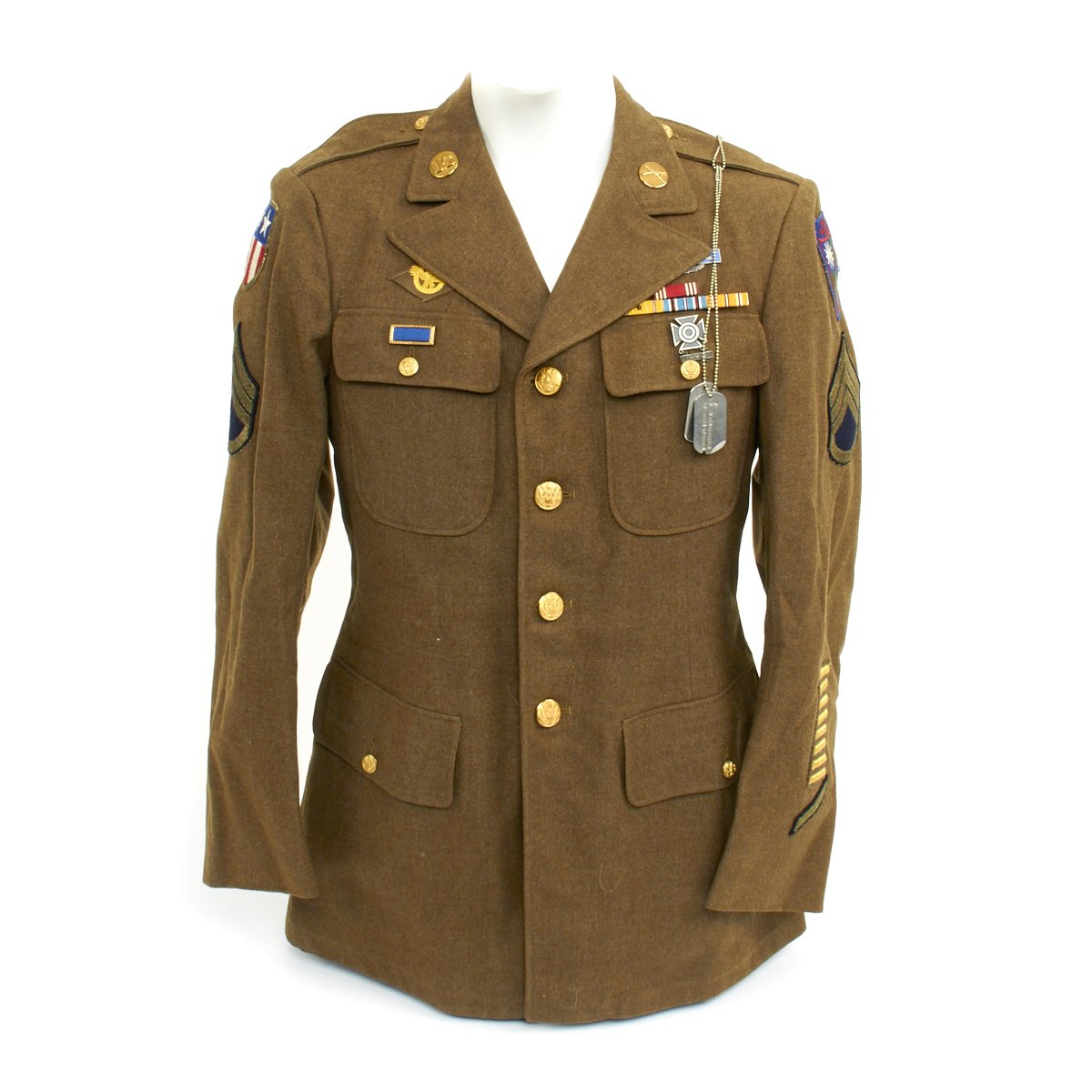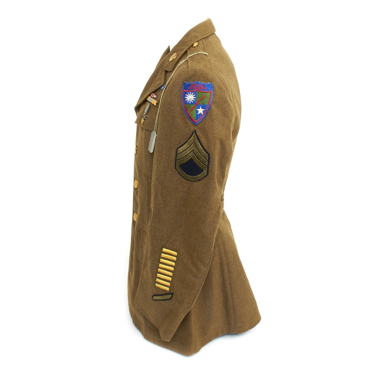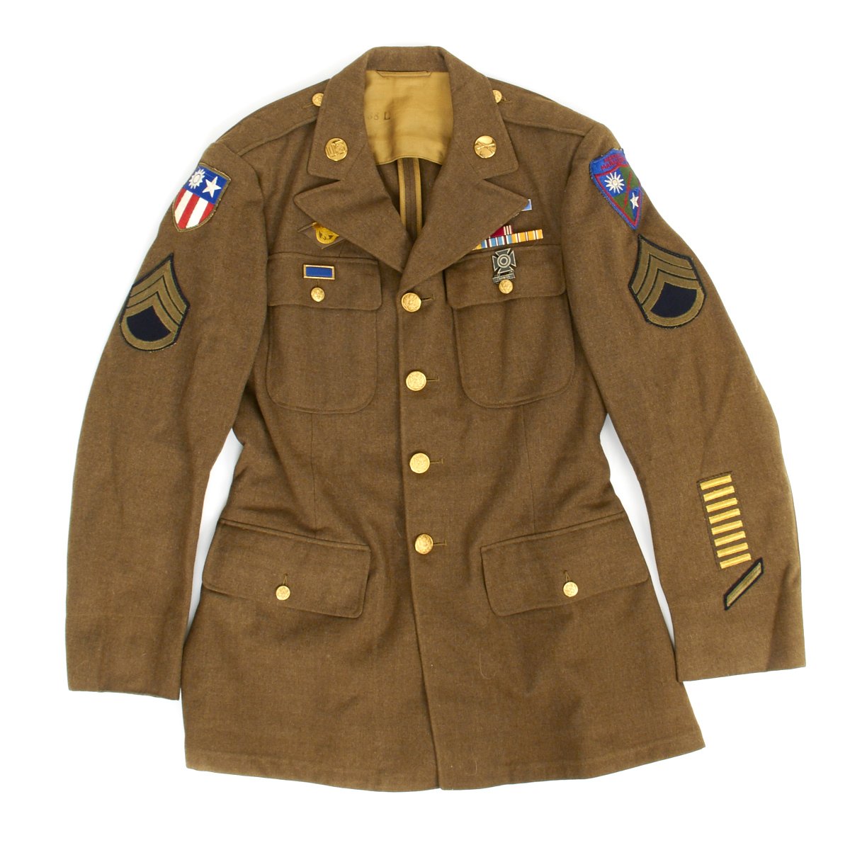 - Excellent condition WW2 Class A four pocket uniform jacket with wonderful condition patches, ribbons and material. Features a Merrills Marauders patch on left shoulder and China-Burma-India patch on right, a sterling silver CIB medal, and award ribbons are as follows: Army Good Conduct Medal, American Defense Service Medal with Bronze Star, American Campaign Medal, Asiatic–Pacific Campaign Medal. Presidential Unit Citation, Carbine Expert Badge, Ruptured Duck, Staff Sergeant Chevrons and 8 overseas service bars on left sleeve indicating 48+ months of overseas service.