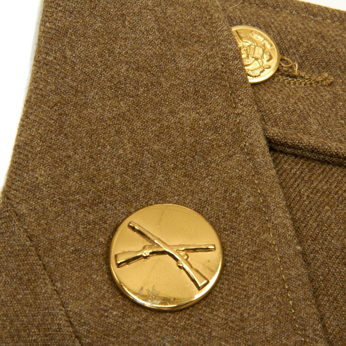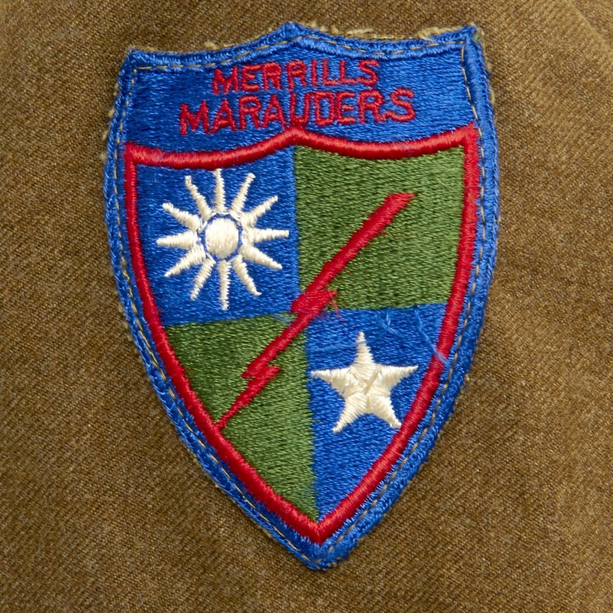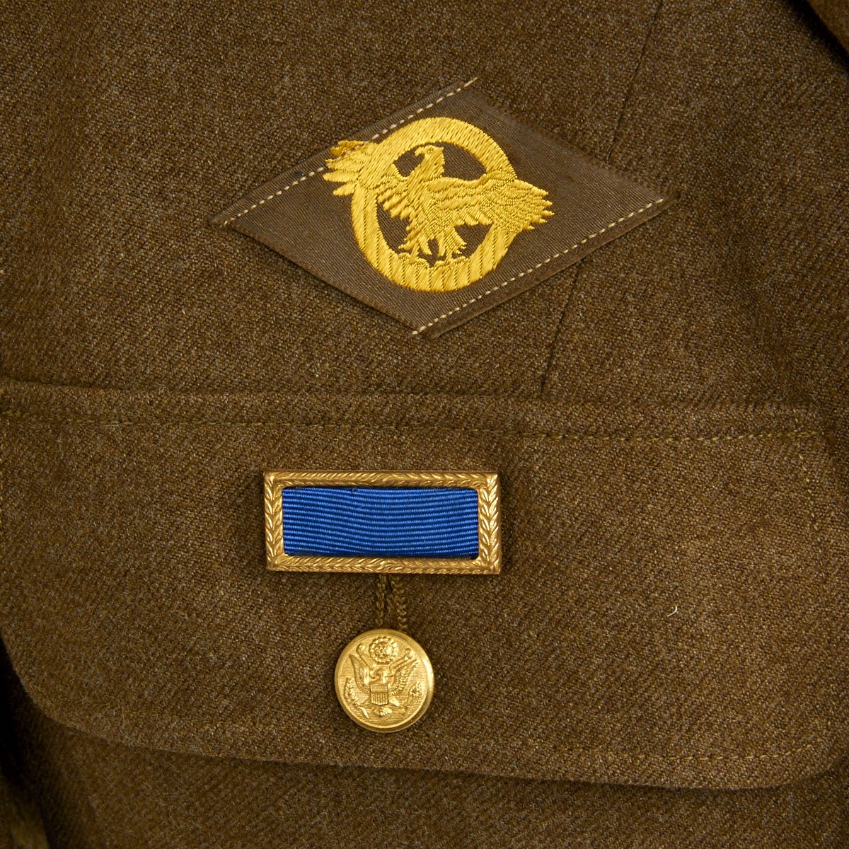 - Excellent condition WW2 Class A four pocket uniform jacket with wonderful condition patches, ribbons and material. Features a Merrills Marauders patch on left shoulder and China-Burma-India patch on right, a sterling silver CIB medal, and award ribbons are as follows: Army Good Conduct Medal, American Defense Service Medal with Bronze Star, American Campaign Medal, Asiatic–Pacific Campaign Medal. Presidential Unit Citation, Carbine Expert Badge, Ruptured Duck, Staff Sergeant Chevrons and 8 overseas service bars on left sleeve indicating 48+ months of overseas service.