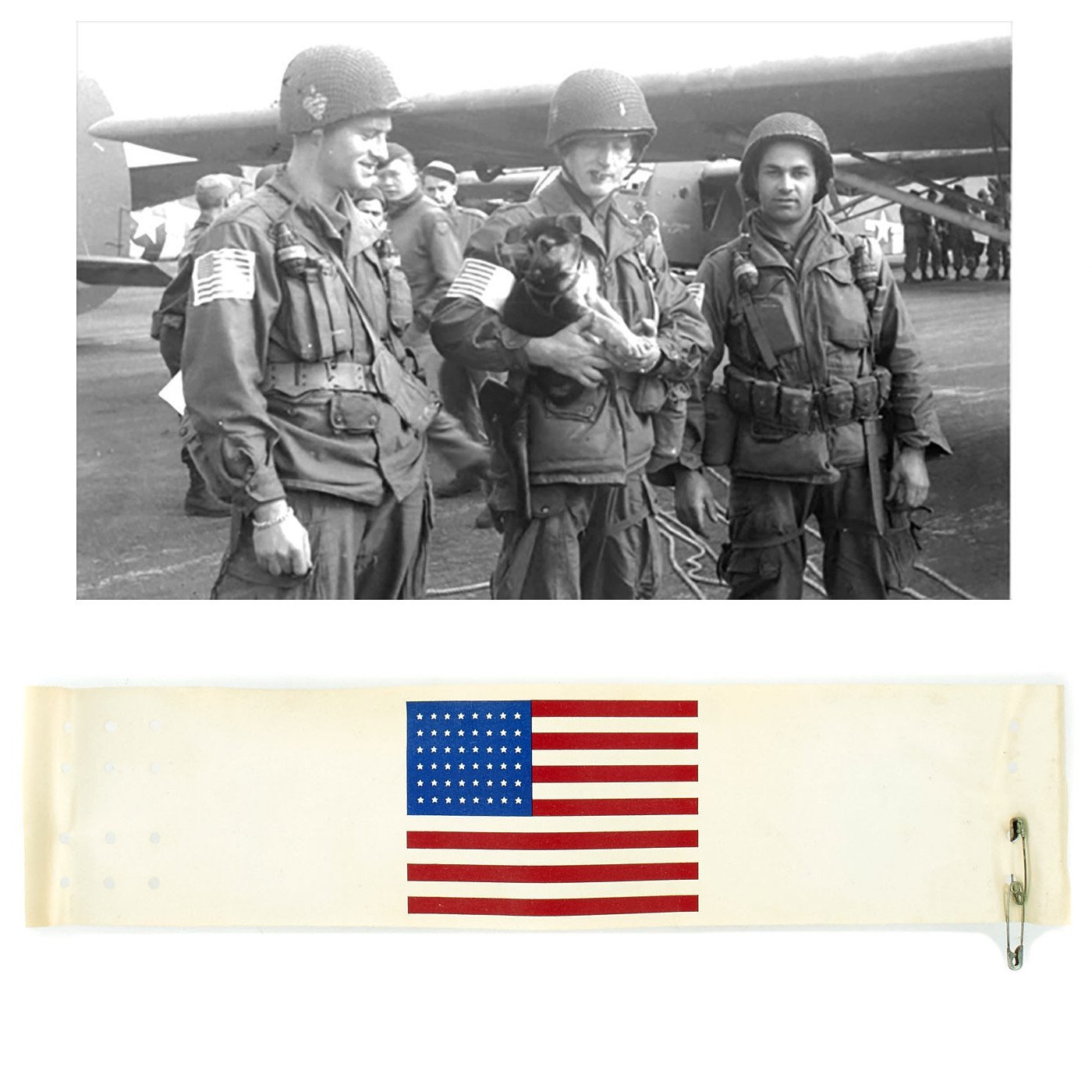 Original Item: Only One Available. This is a mint condition unissued example of a very scarce Airborne Paratrooper Flag Armband. This type of armband was typically used by U.S. Paratroopers for example in North Africa (1942), during the D-Day invasion in Normandy (June 1944) and during Operation Market Garden (September 1944). The armband was typically fixed to the uniform jacket arm with safety pins.