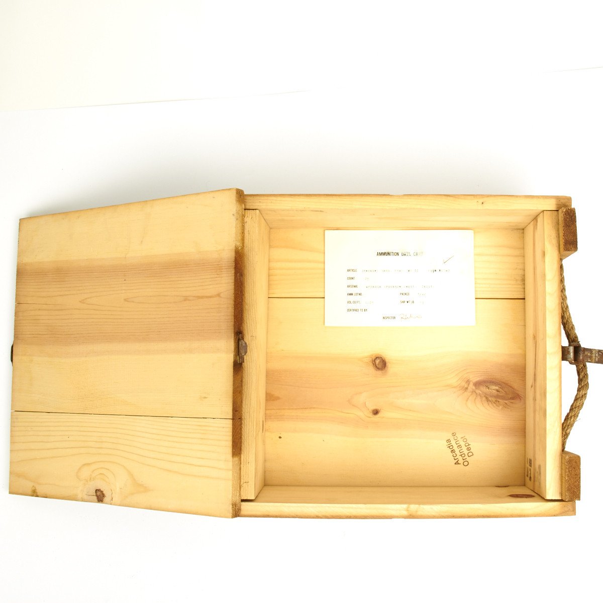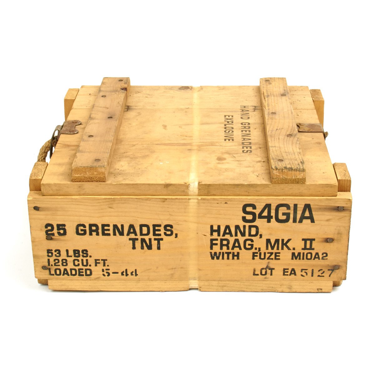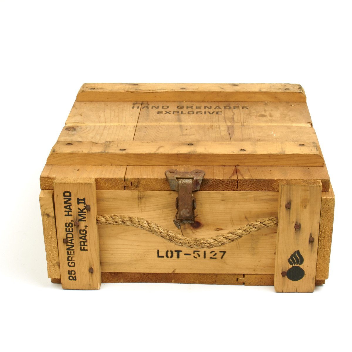 Original Item: Nearly unissued condition wood crate designed to hold WW2 25 MKII FRAG hand grenades. Offered in excellent condition with rope handles and original markings.