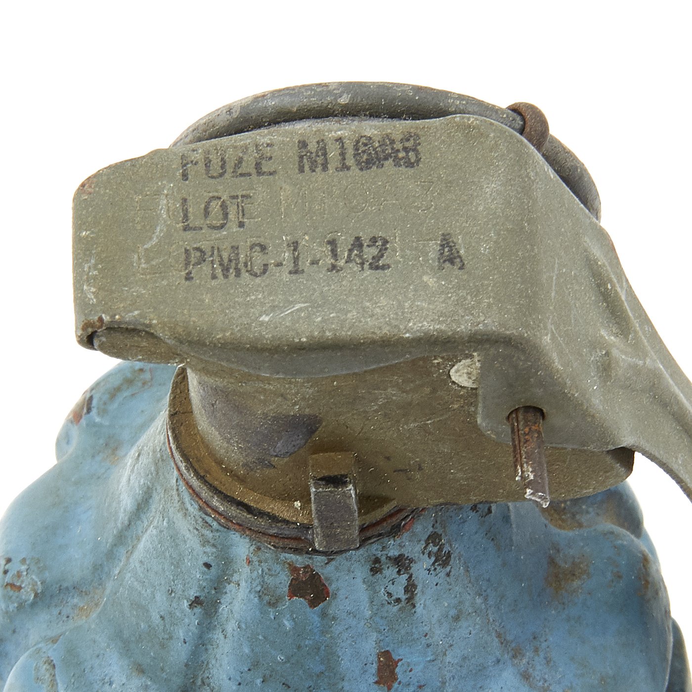 This grenade was originally made as an inert practice round, with a hole in the bottom and a practice fuse, which has the correct WWII style spoon. It was painted blue post war, the standard color the U.S. Army paints inert ordnance such as grenades, mines, etc. The fuse spoon was originally an M10A3, but was updated later to a M16AB version.