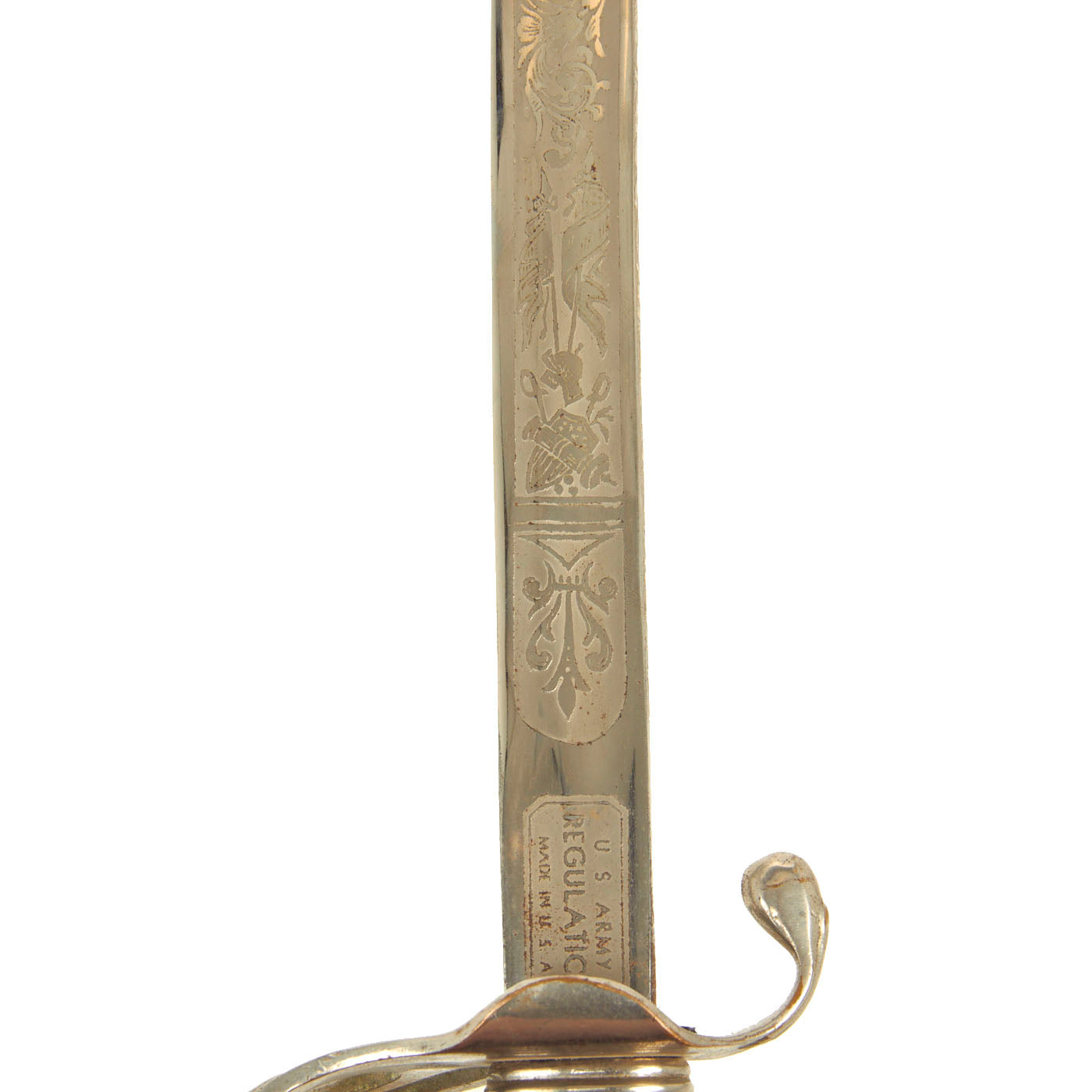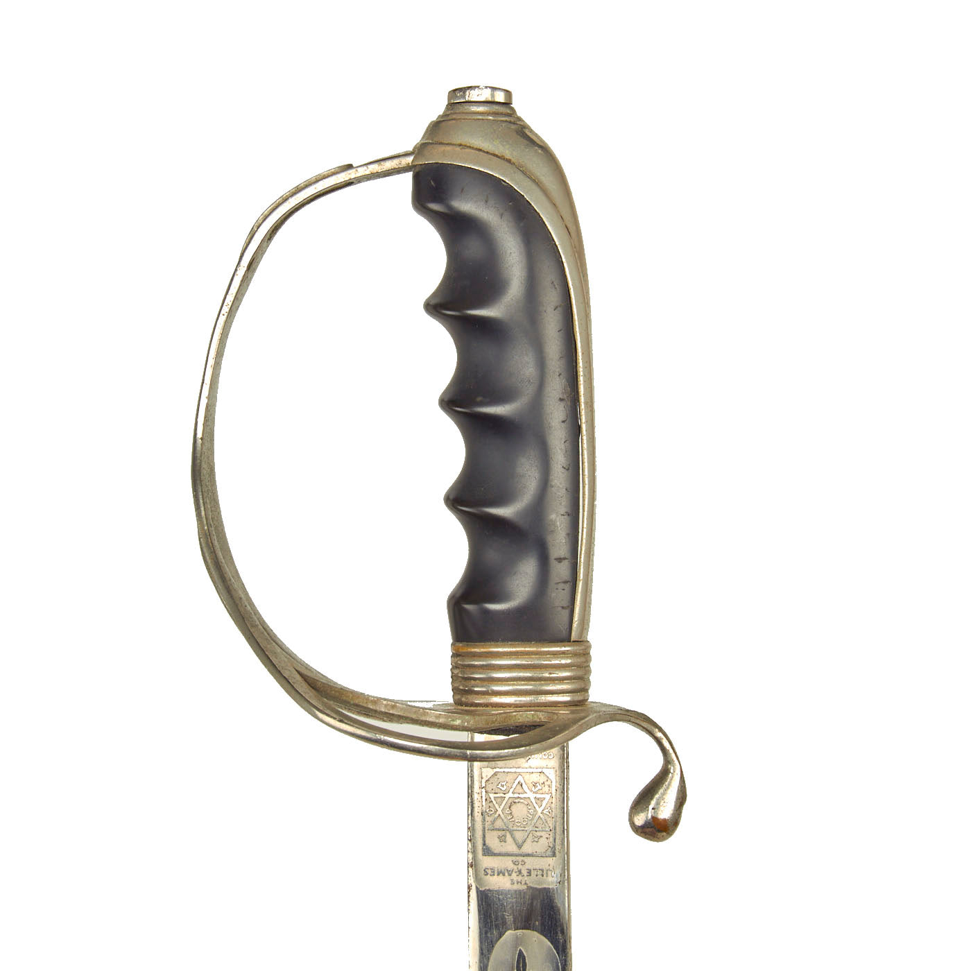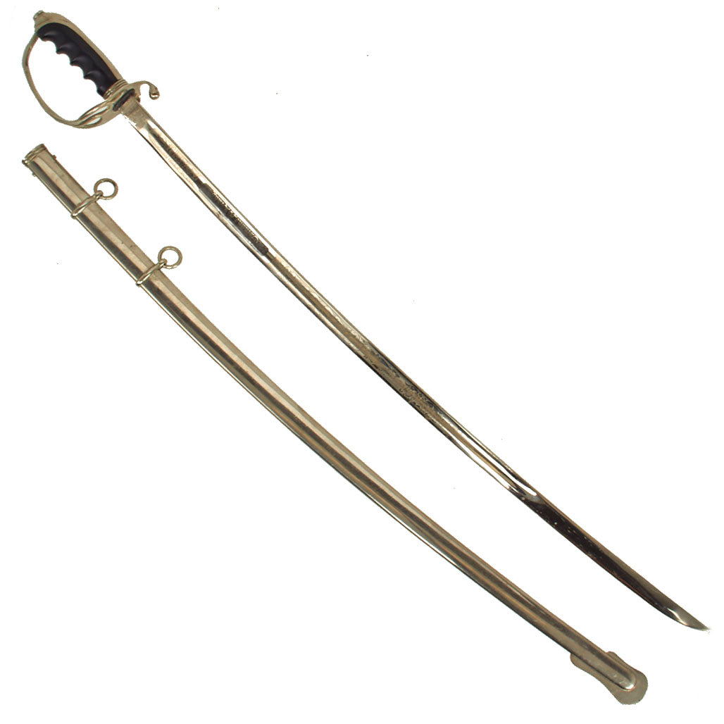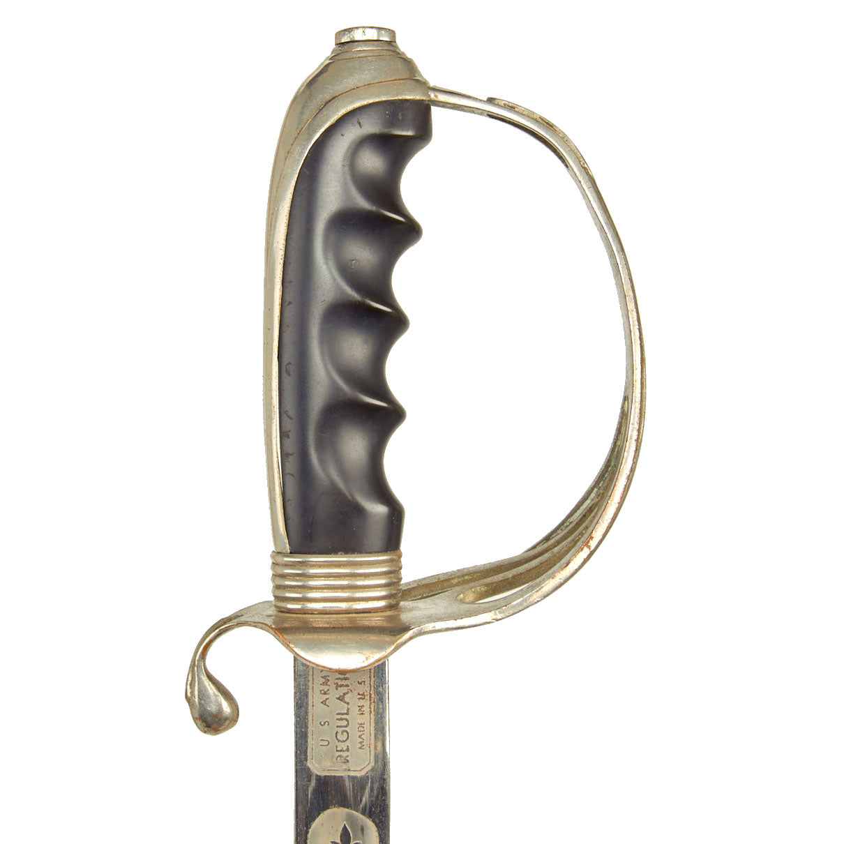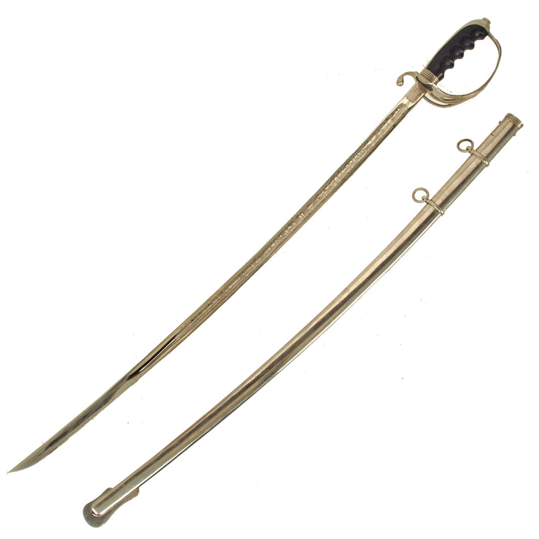This example has a very nice four bar nickel plated hand guard, with a black lacquered wood grip with finger grooves. The slim slightly curved 31.5 inch long blade shows some lovely etched designs, with U.S. on one side, and the Federal Eagle with the Motto E PLURIBUS UNUM on the other. The blade is fully nickel plated, and marked THE TILLEY-AMES CO. / COLUMBUS, OHIO on one side and U.S. ARMY / REGULATION / MADE IN U.S.A.