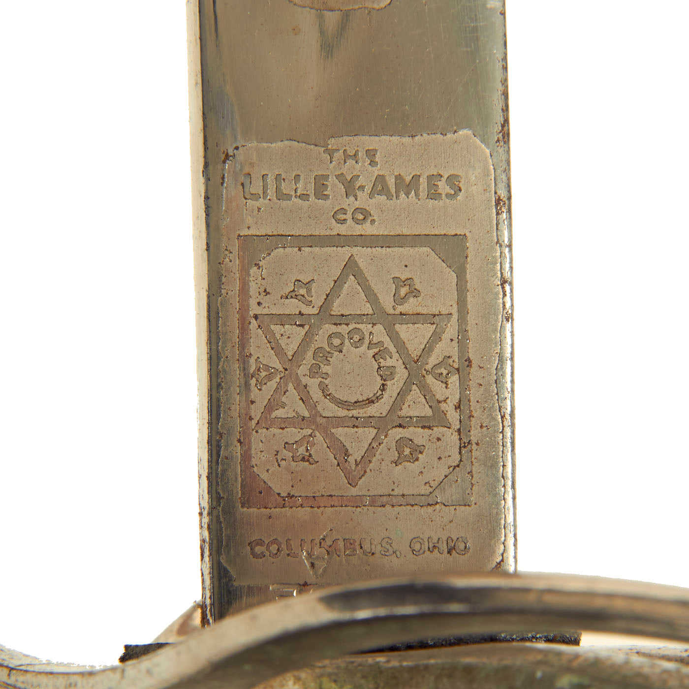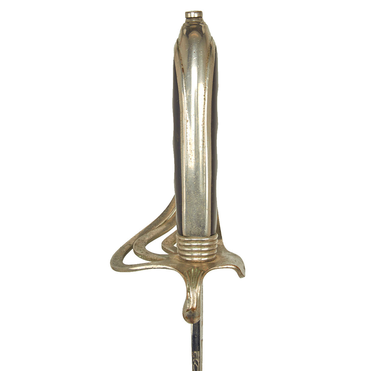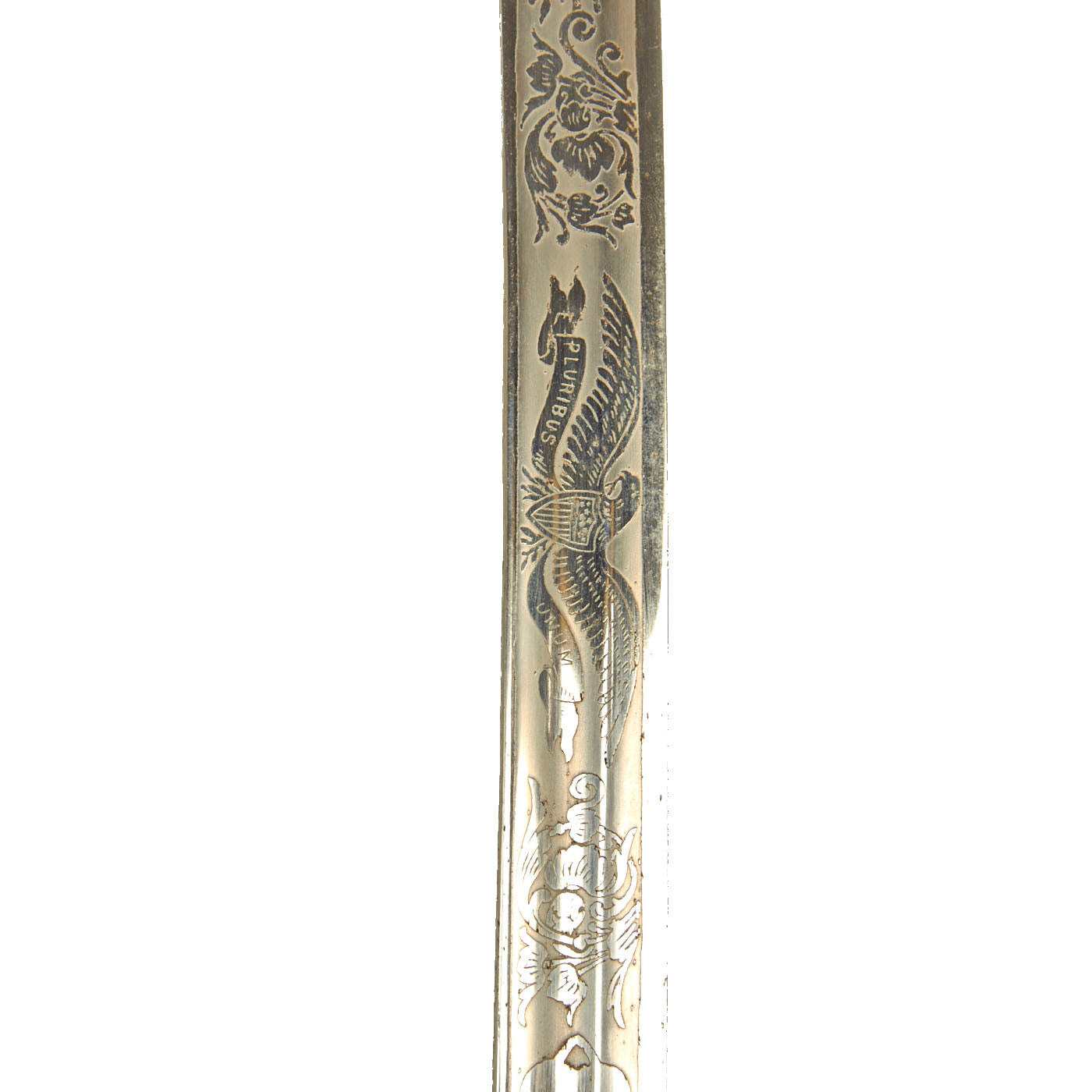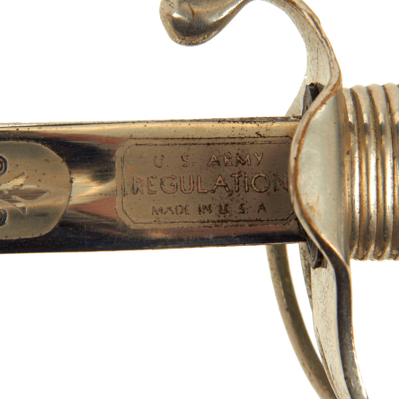 This example has a very nice four bar nickel plated hand guard, with a black lacquered wood grip with finger grooves. The slim slightly curved 31.5 inch long blade shows some lovely etched designs, with U.S. on one side, and the Federal Eagle with the Motto E PLURIBUS UNUM on the other. The blade is fully nickel plated, and marked THE TILLEY-AMES CO. / COLUMBUS, OHIO on one side and U.S. ARMY / REGULATION / MADE IN U.S.A.