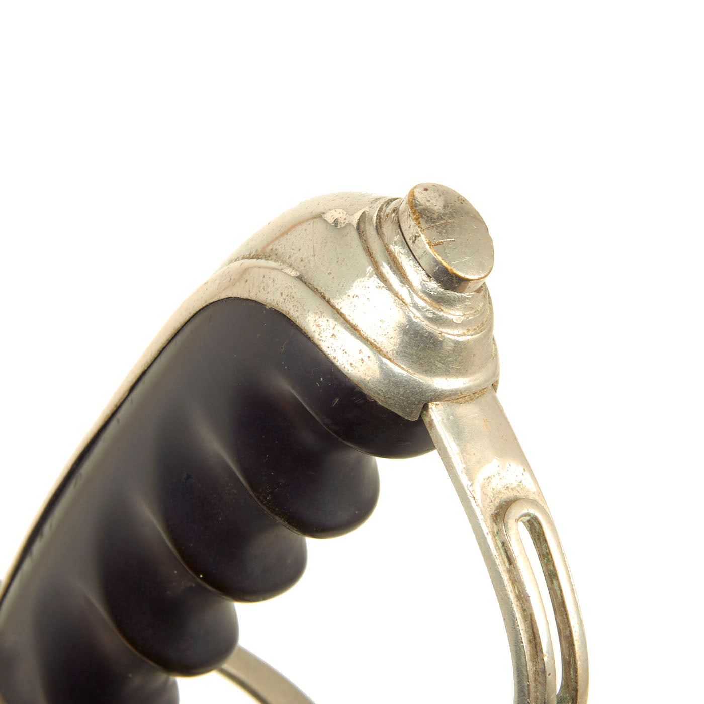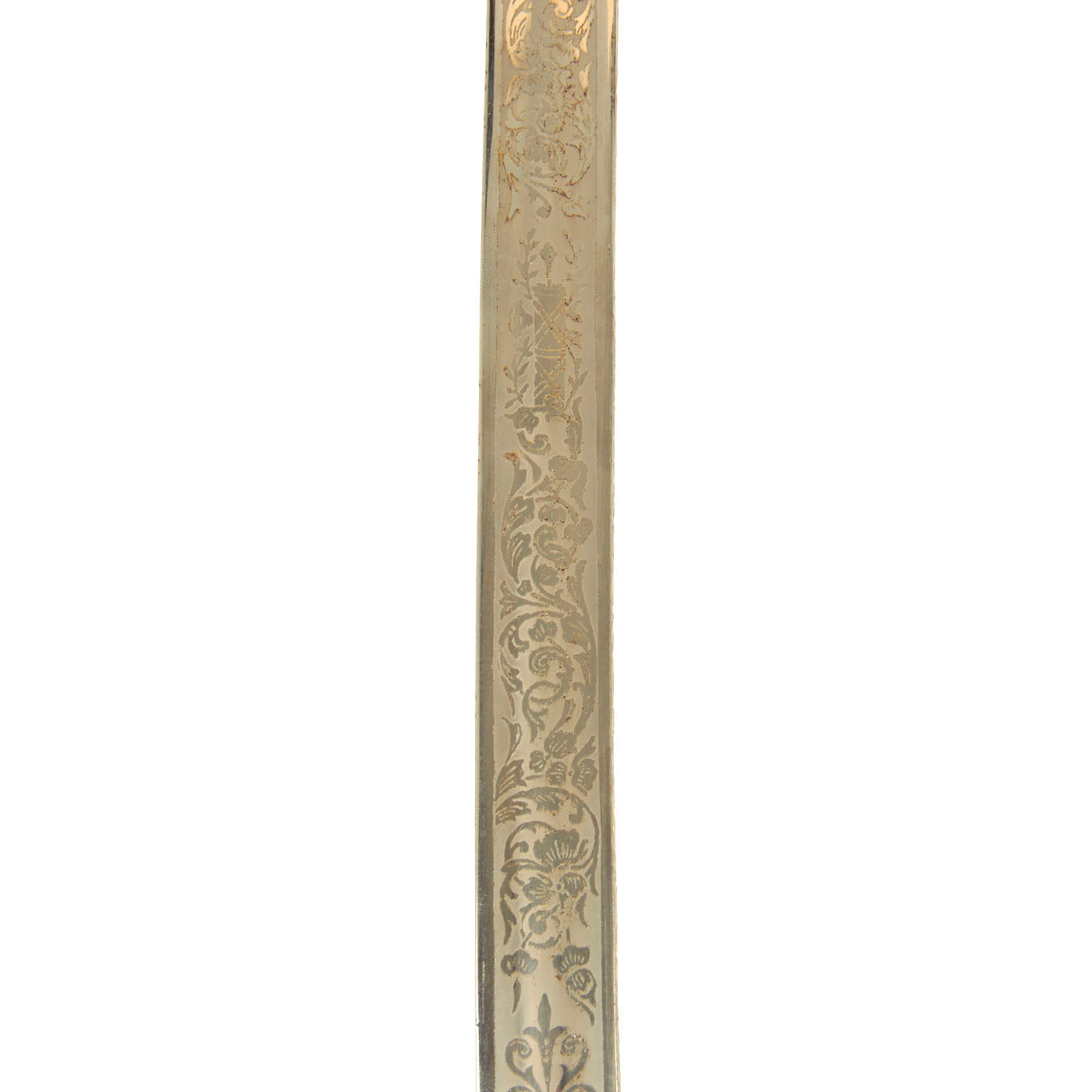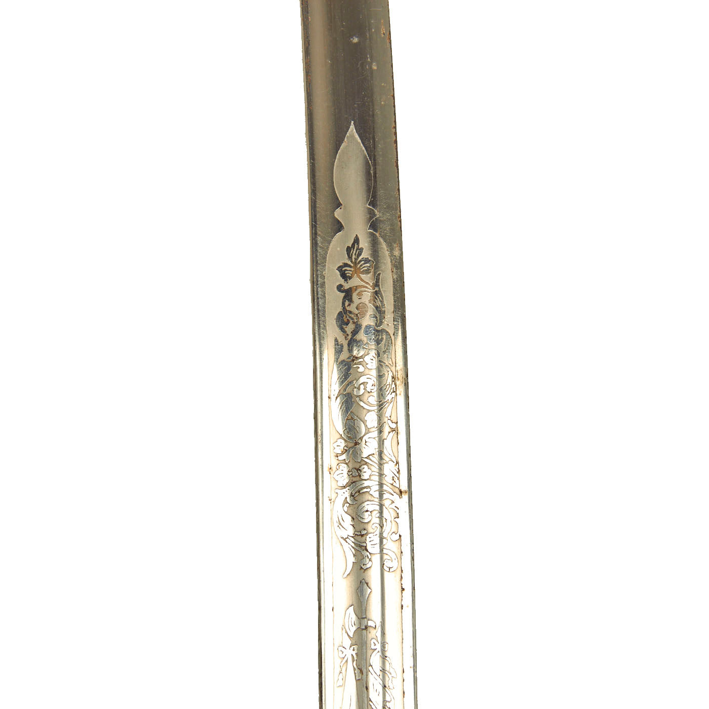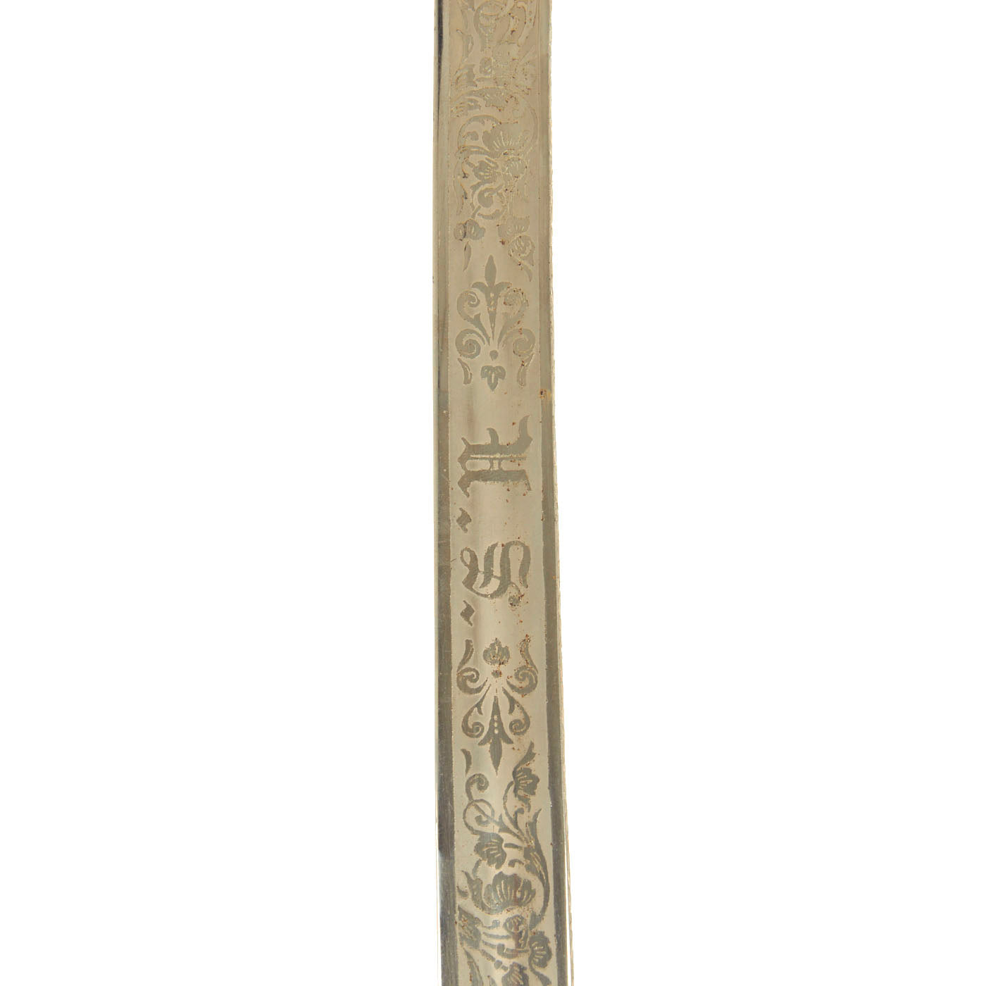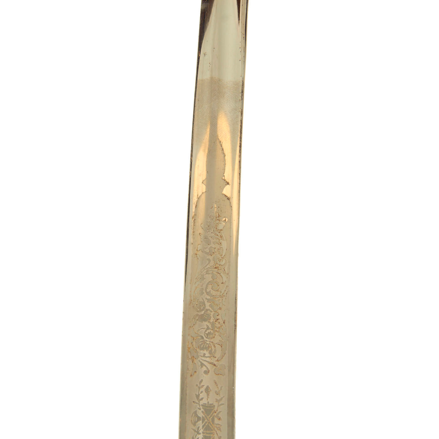 This example has a very nice four bar nickel plated hand guard, with a black lacquered wood grip with finger grooves. The slim slightly curved 31.5 inch long blade shows some lovely etched designs, with U.S. on one side, and the Federal Eagle with the Motto E PLURIBUS UNUM on the other. The blade is fully nickel plated, and marked THE TILLEY-AMES CO. / COLUMBUS, OHIO on one side and U.S. ARMY / REGULATION / MADE IN U.S.A.