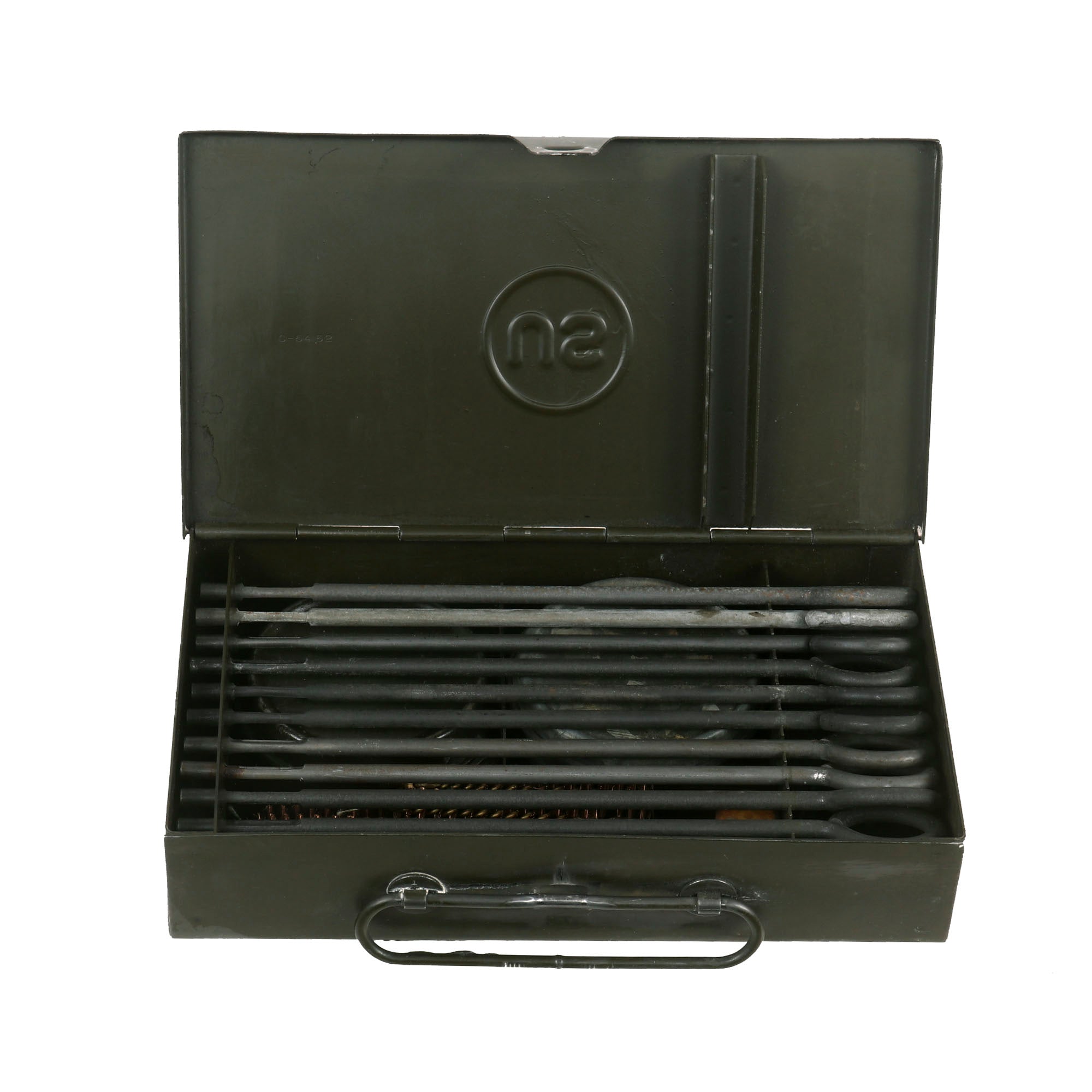 Original Item: Only One Available. One of the most important tools on the battlefield aside from your brain is the weapon system in which you are armed with. Whether it was in combat or just training, preventative and continual maintenance on your weapon is important. This cleaning kit is often referred to as a “squad” cleaning kit due to the amount of materials inside. The kit contains (10) parkerized steel cleaning rods, (10) bronze bore brushes, (10) takedown tools, (1) oiler, (1) cosmic container and lastly a dozen or so small cleaning cloths. Only 4 brushes are shown in the photographs, but there are definitely 10 included.