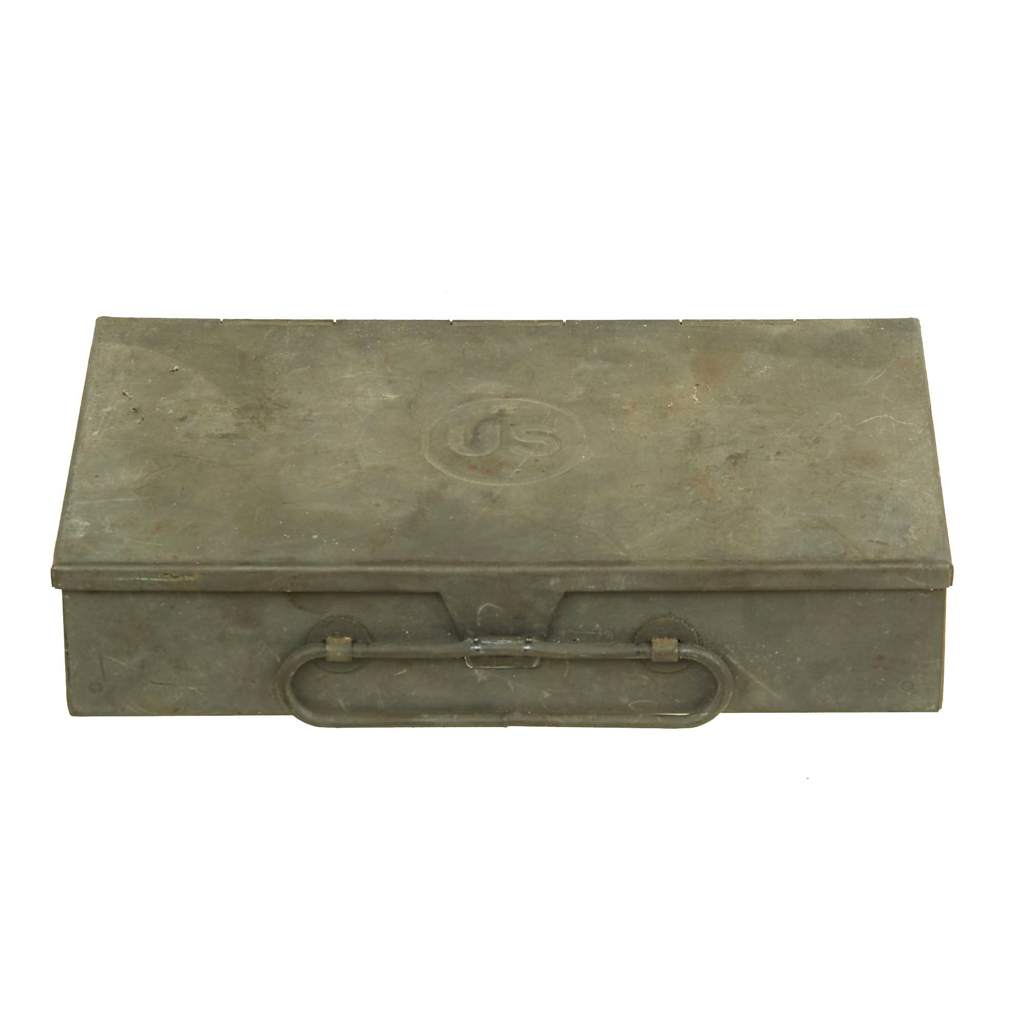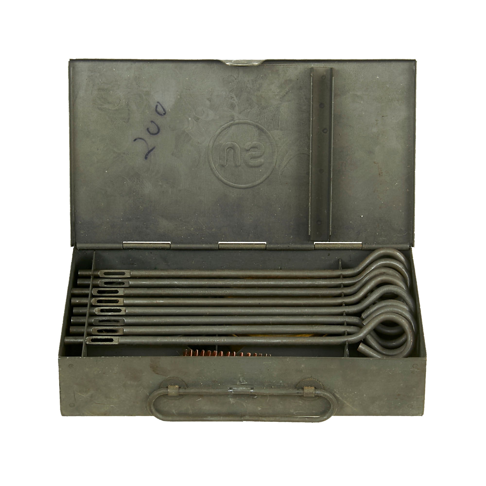 The kit comes contained in its original US stamped 9” x 5” x 2” steel box. The overall condition is really nice and does show signs of faithful use and presents itself without any extensive damage or wear. The box is undamaged, still closing and locking as intended.