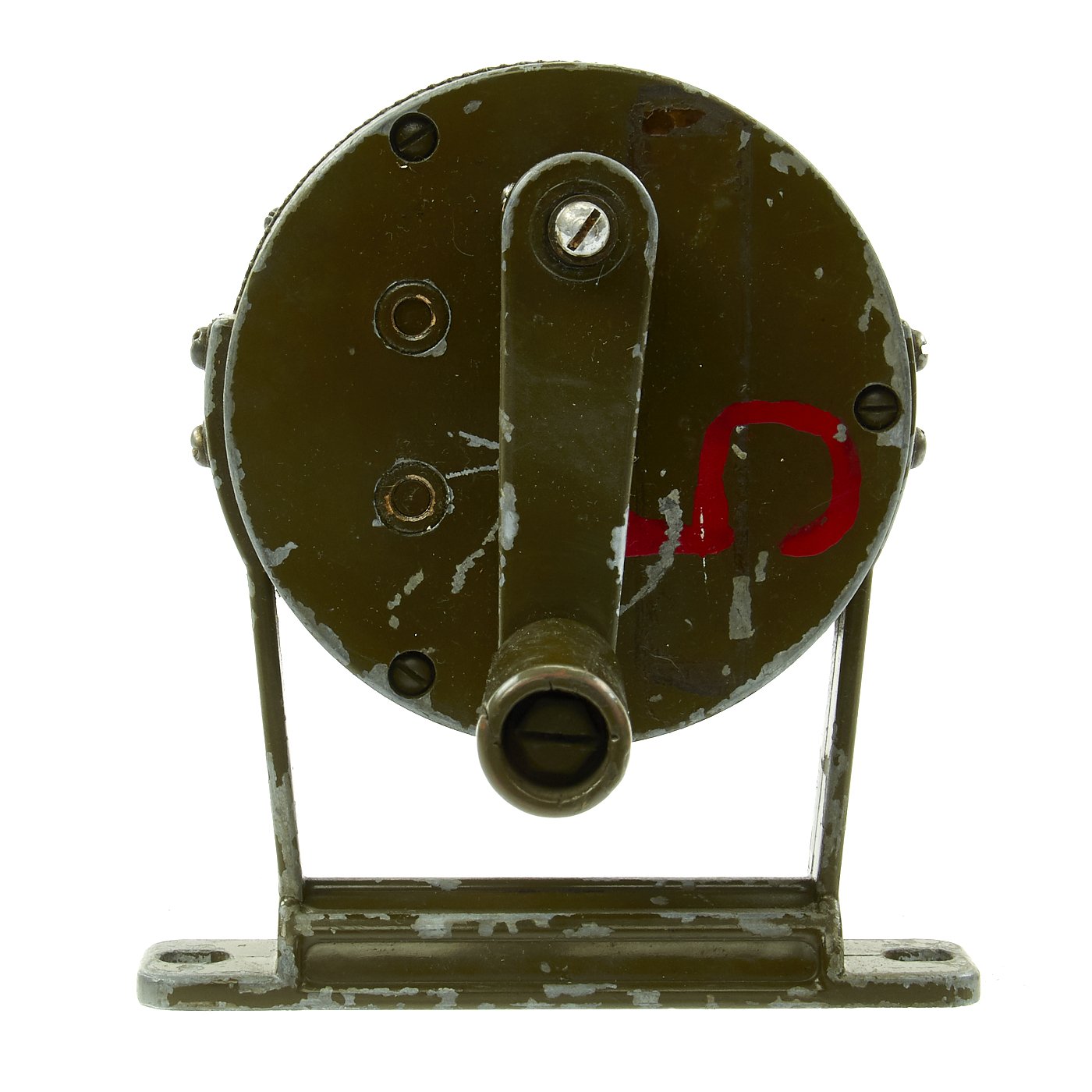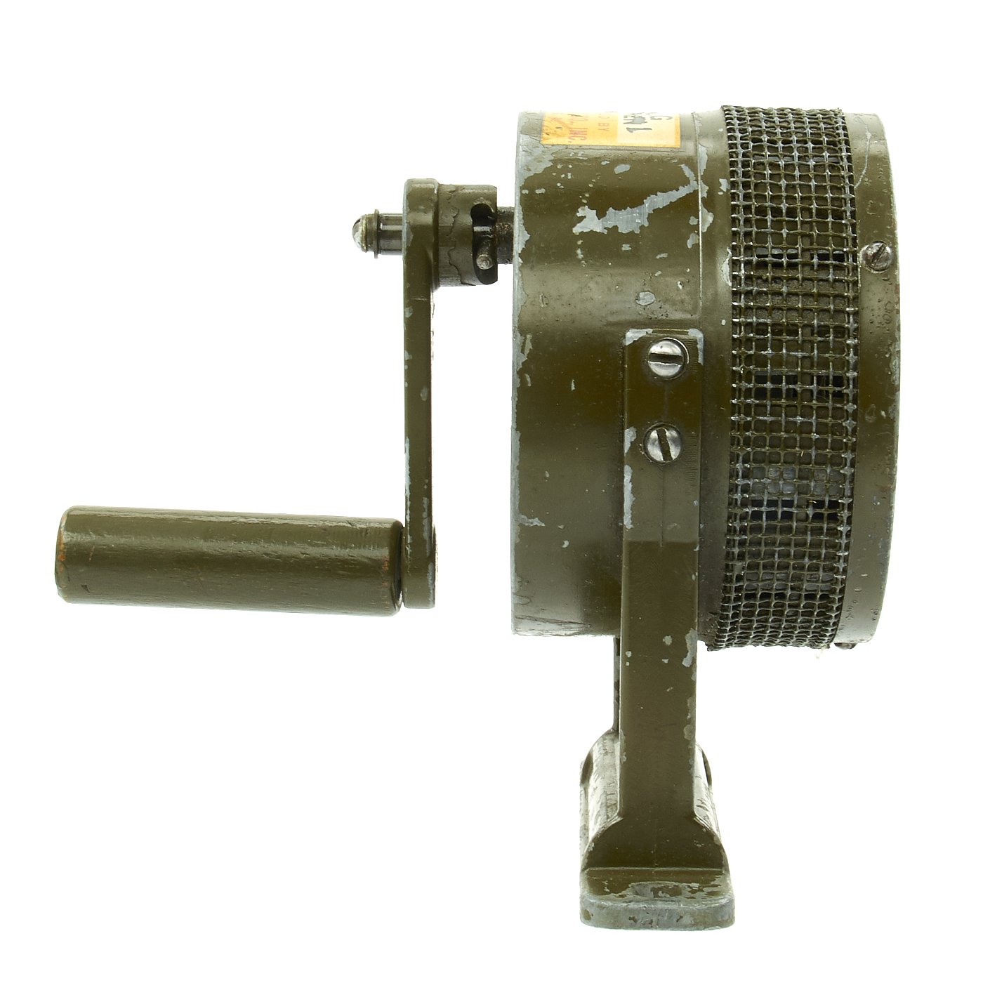 Constructed predominately of aluminum, with a single piece carry handle / mounting bracket, which is screwed into the main housing. The crank with wooden handle protrudes out the back. These were originally painted OD green, however the paint does not stick to the aluminum very well, so often the paint flakes off. However this example has both the mesh side cover and perforated front cover over the rotor, which we rarely see.