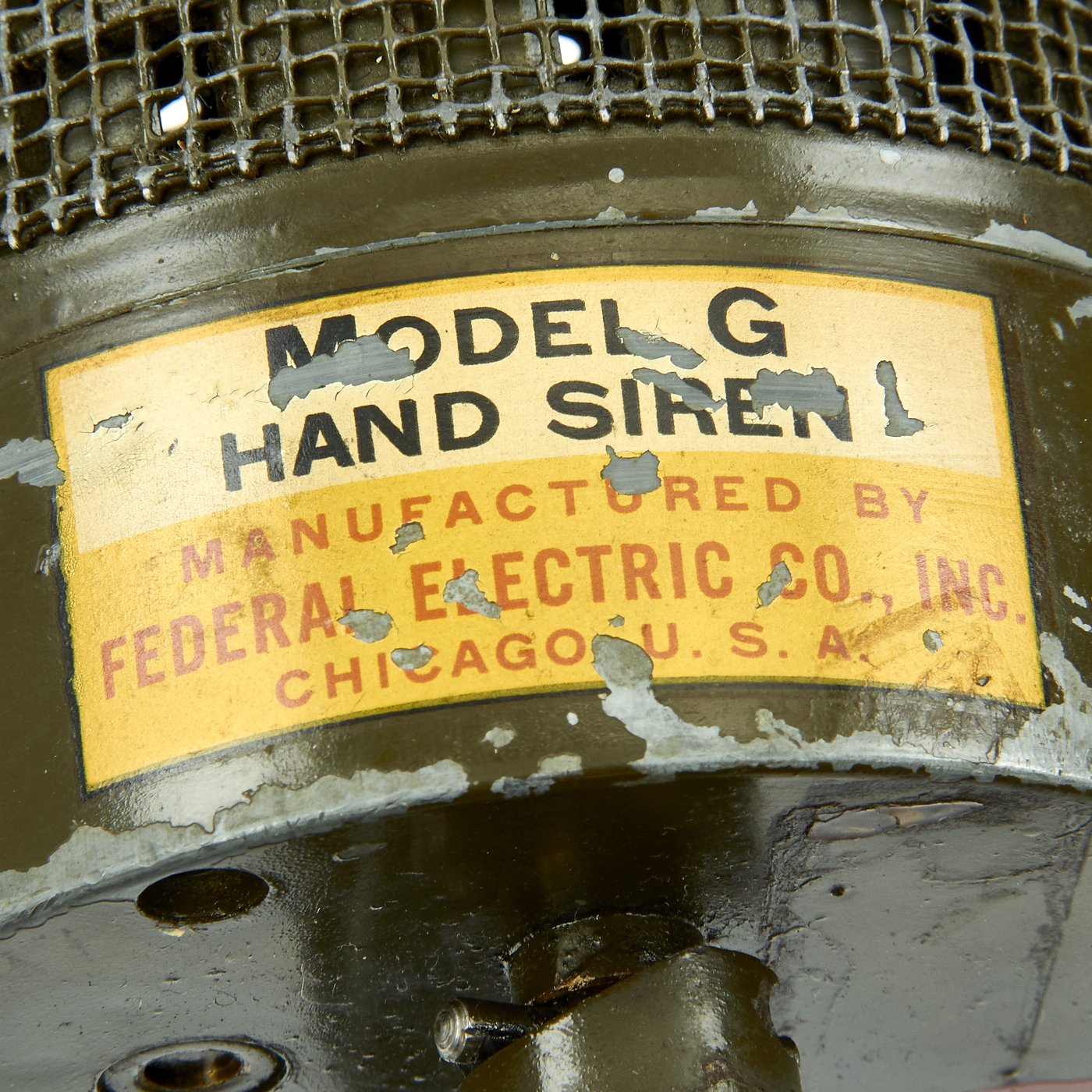 Original Item: Only One Available: This a very rare fully functional (and loud) U.S. WWII Model G Hand Crank Air Raid Siren. Introduced in 1938, the Model G was very similar to the Hand Held Siren made by Federal Electric, however the G is slightly larger, and can hand held or bolted to a stable location for better leverage.