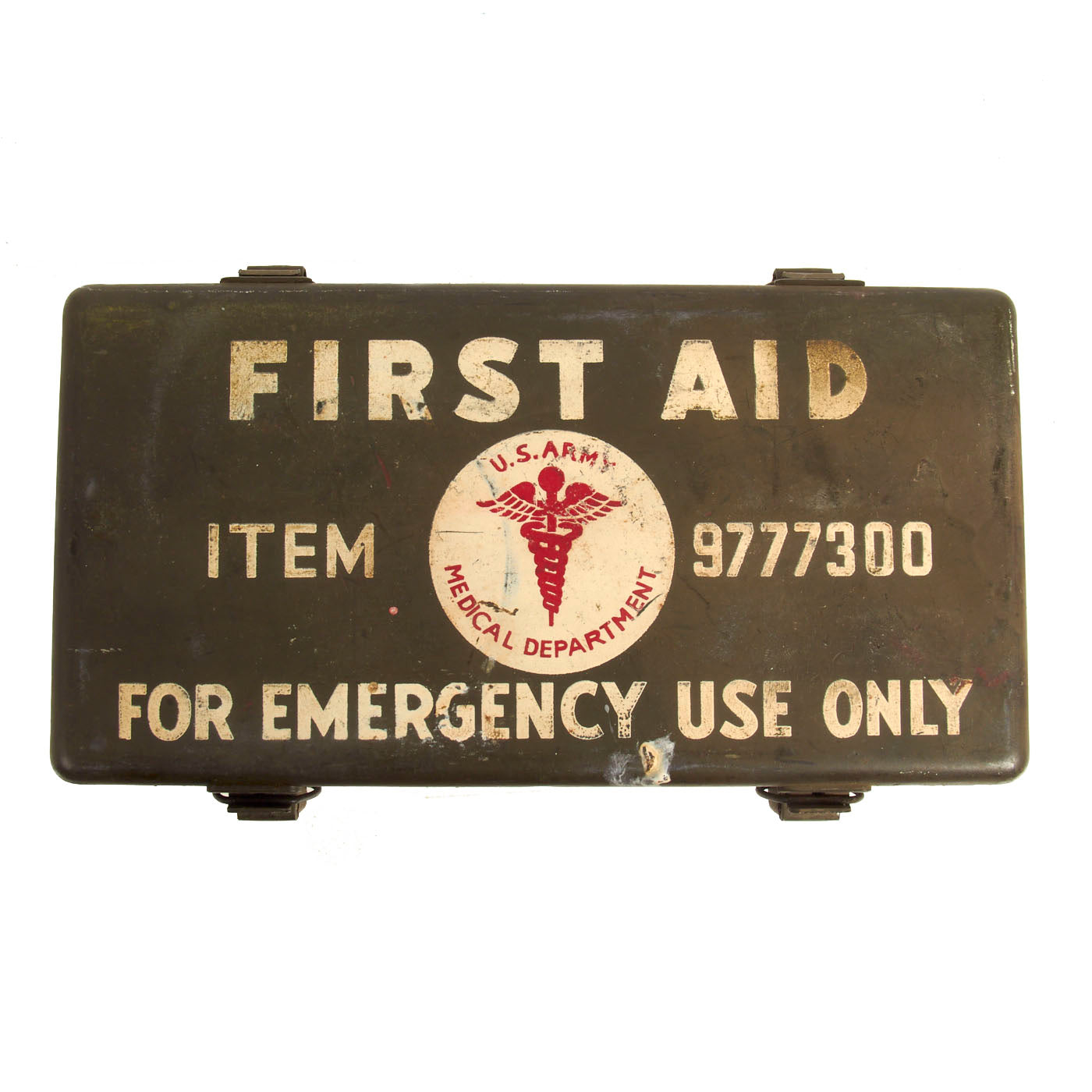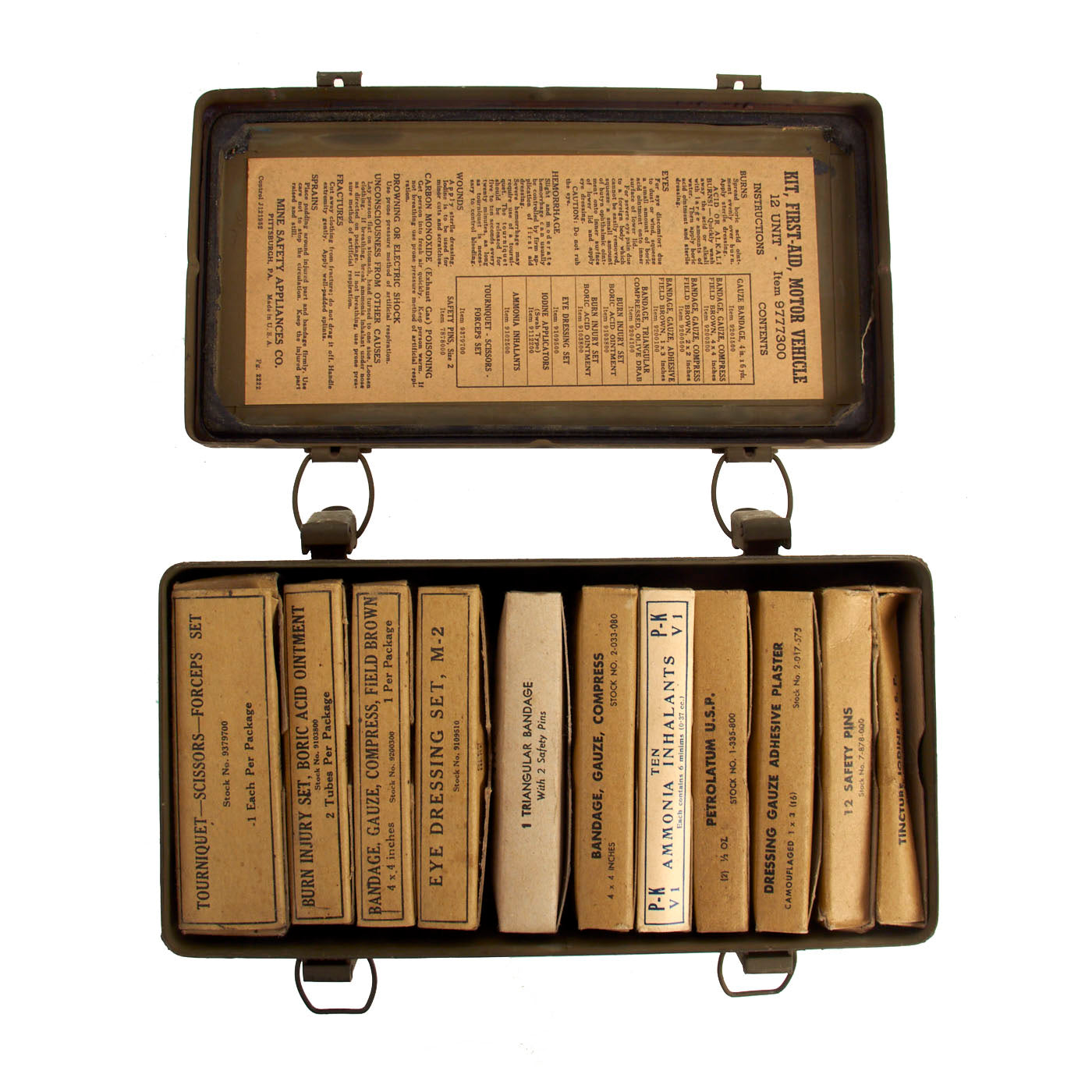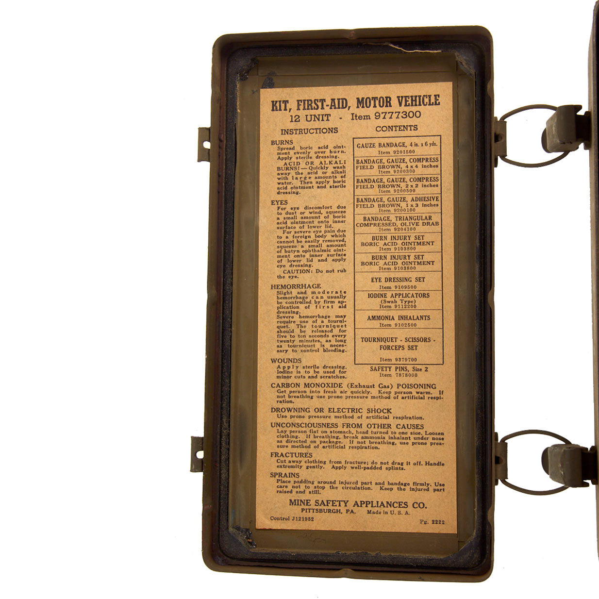 Original Item: Only One Available. In order to offer the best possible first response treatment in the event of a crash or injury involving the vehicle or its passengers, the United States Army Medical Department introduced a series of Motor Vehicle First-Aid Kits. These kits were specifically designed for certain vehicles, and this reflected in their contents. Each kit was divided into units, each of which was individually packaged within the metal container, and these included basic gauze dressings, tourniquets, scissors, along with drugs and medication such as Ammonia and Iodine.