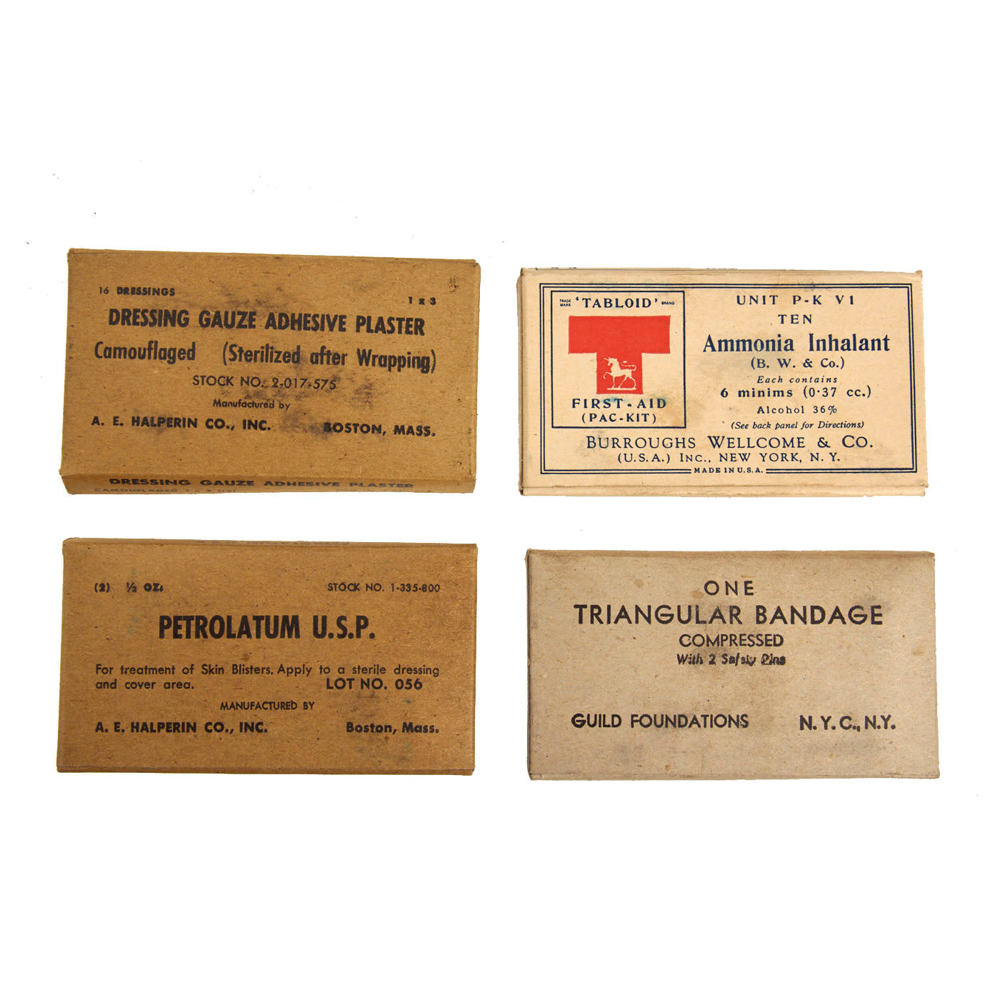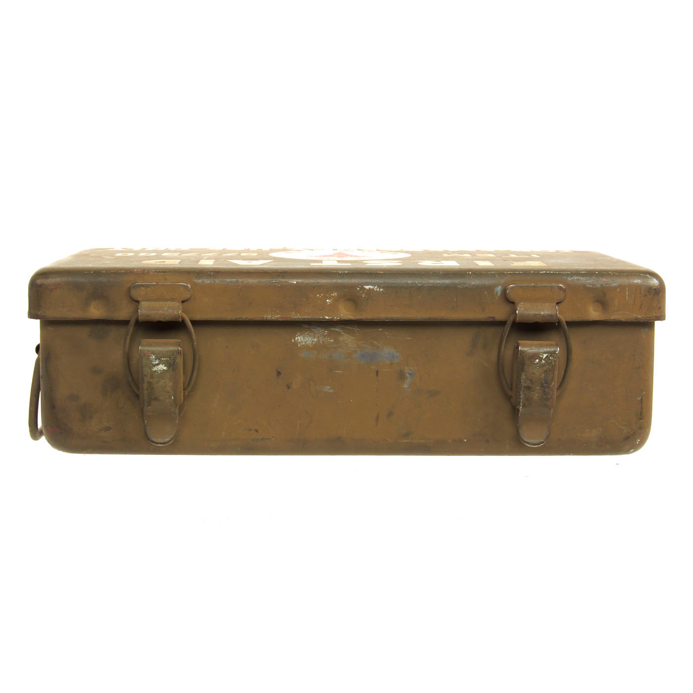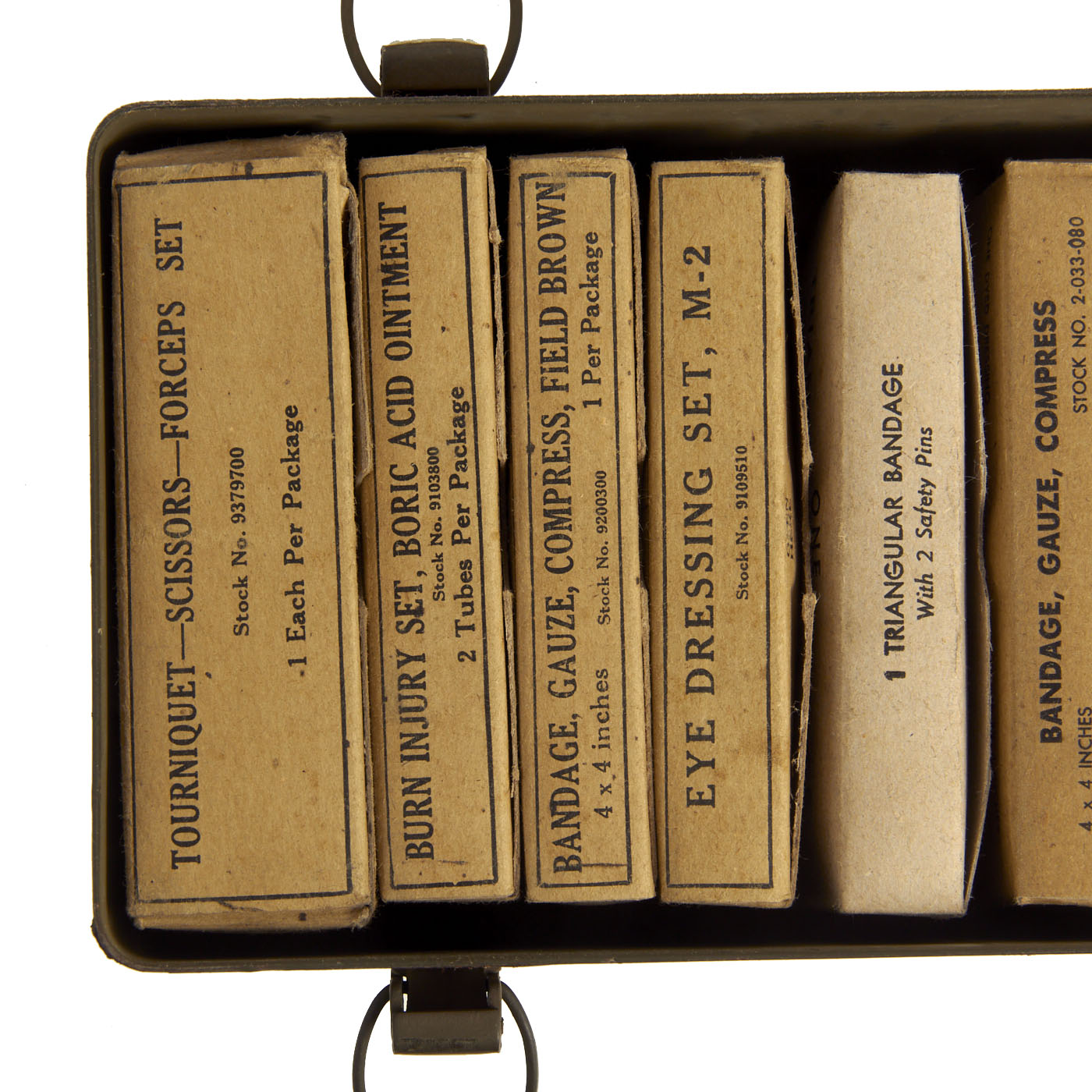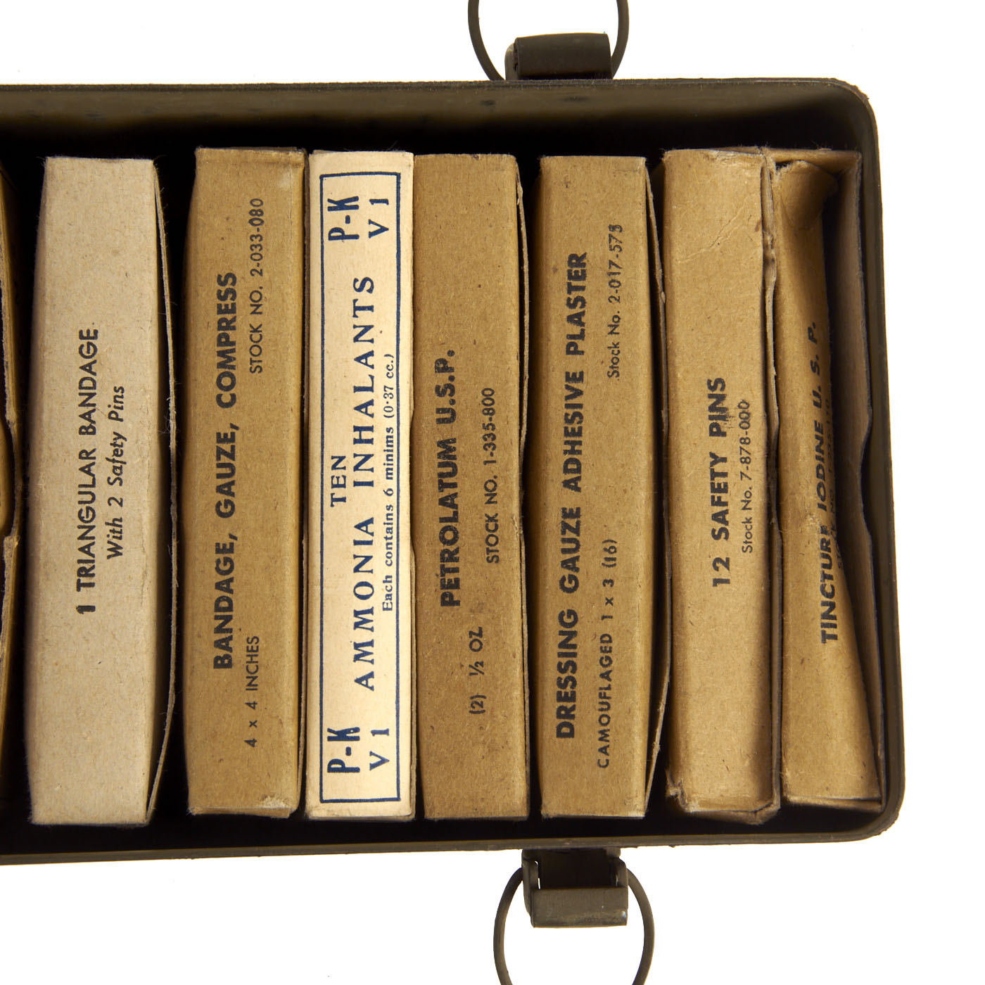 Original Item: Only One Available. In order to offer the best possible first response treatment in the event of a crash or injury involving the vehicle or its passengers, the United States Army Medical Department introduced a series of Motor Vehicle First-Aid Kits. These kits were specifically designed for certain vehicles, and this reflected in their contents. Each kit was divided into units, each of which was individually packaged within the metal container, and these included basic gauze dressings, tourniquets, scissors, along with drugs and medication such as Ammonia and Iodine.