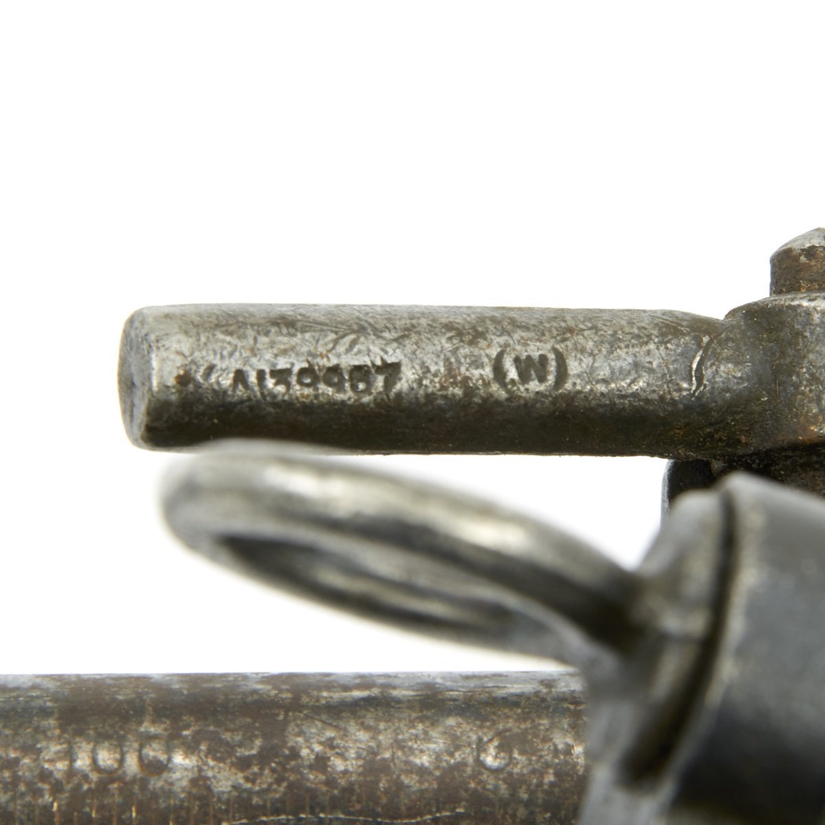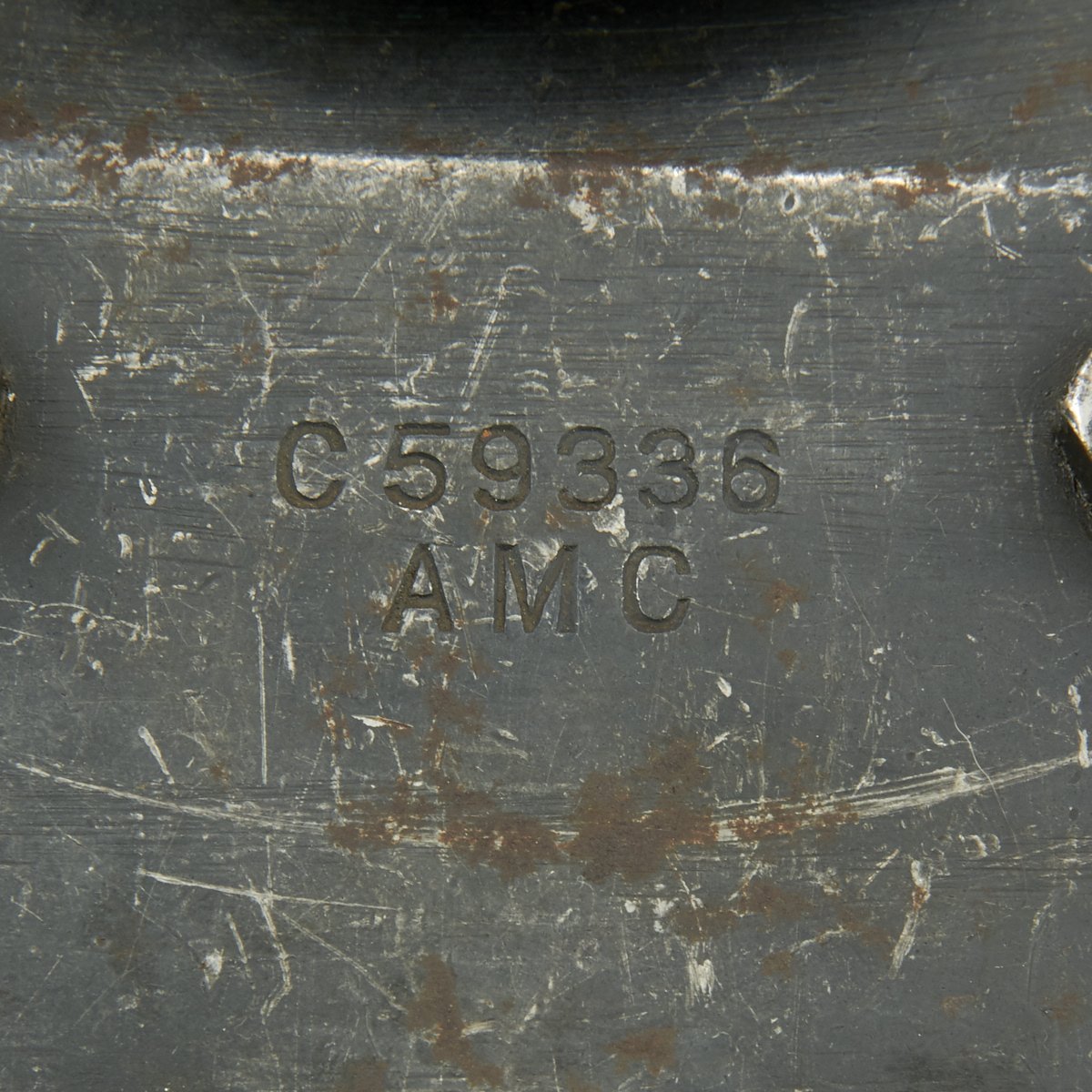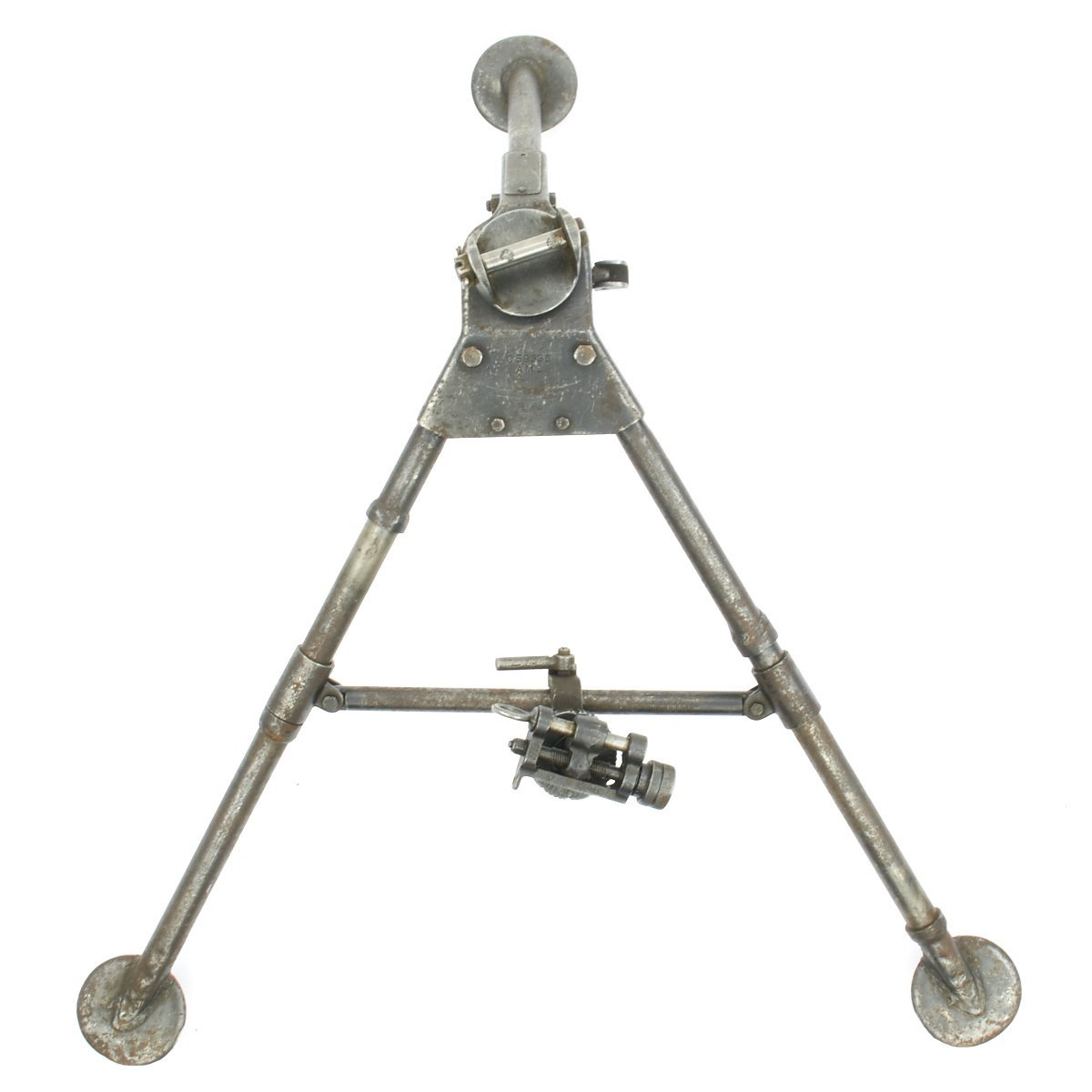 The top head of the tripod is stamped C59336 / AMC and is marked in multiple other locations. Features brass socket for the pintle and fully functional legs, cross bar and welded feet. It is complete, functional and in excellent condition. All paint was removed by previous collector years ago, so the exterior has a nice worn blued patina. The pintle is ordnance bomb marked, and comes complete with the cross pin and castle nut, with cotter pin still installed.