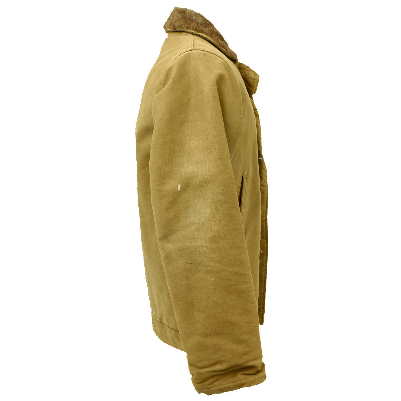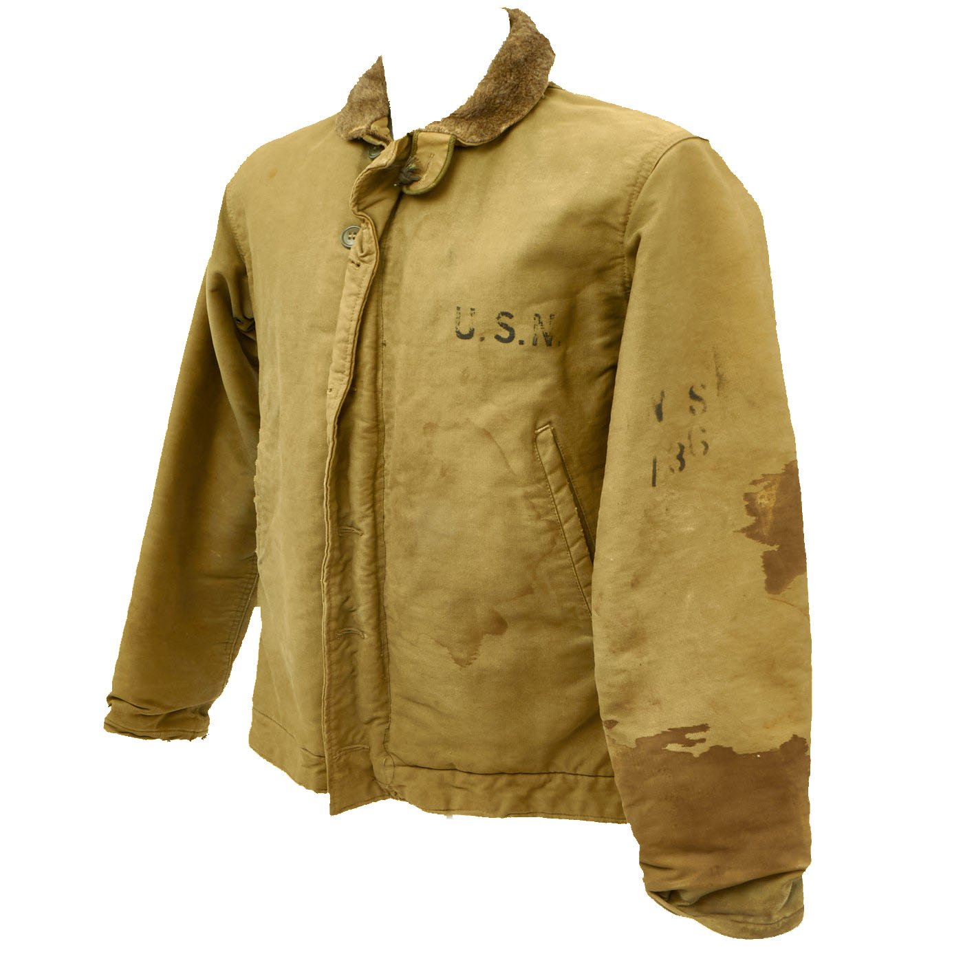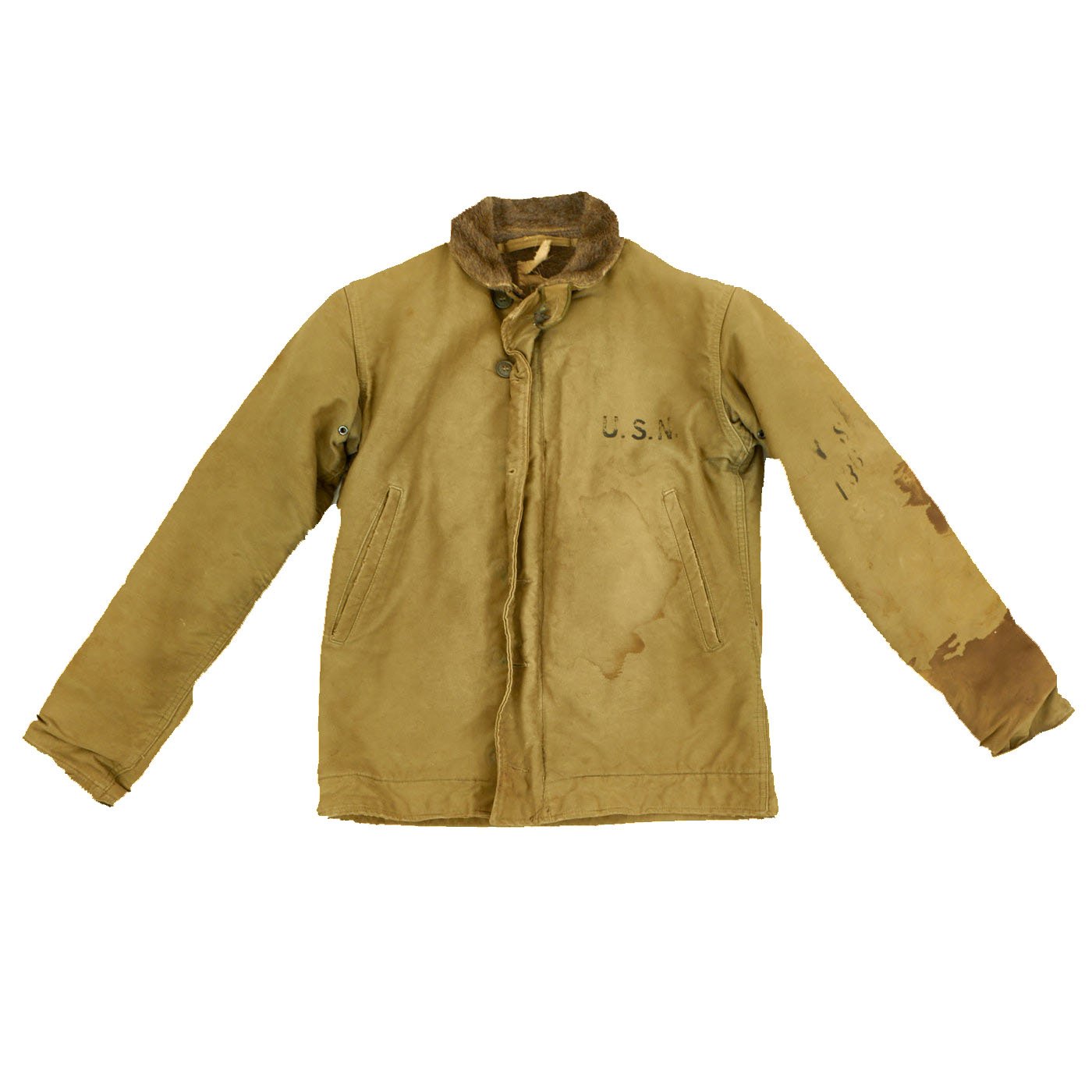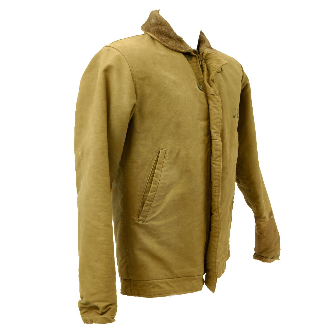 Original Item: Only One Available. Vintage 1940 - 1945 WWII United States Navy Stenciled USN Deck Jacket in size 38. The jacket is in very good condition, with fully functional zipper. Made from a ribbed material called “jungle cloth”, these jackets were lined with an alpaca artificial fur. These were very durable and warm coats, which were extremely sought after during WWII and the years later. Most veterans took theirs home and wore them until they simply fell apart… which is why these jackets are so rare today. This Jacket shows signs of honest wear, with wear at the usual places; cuffs, collar, skirt, etc. There is some staining, as pictured.