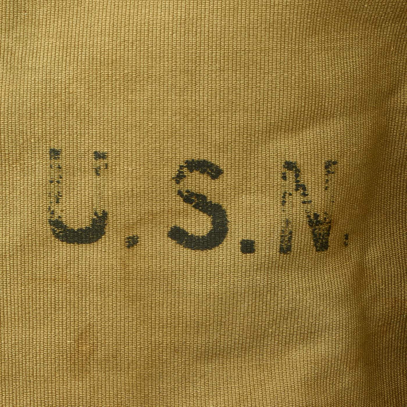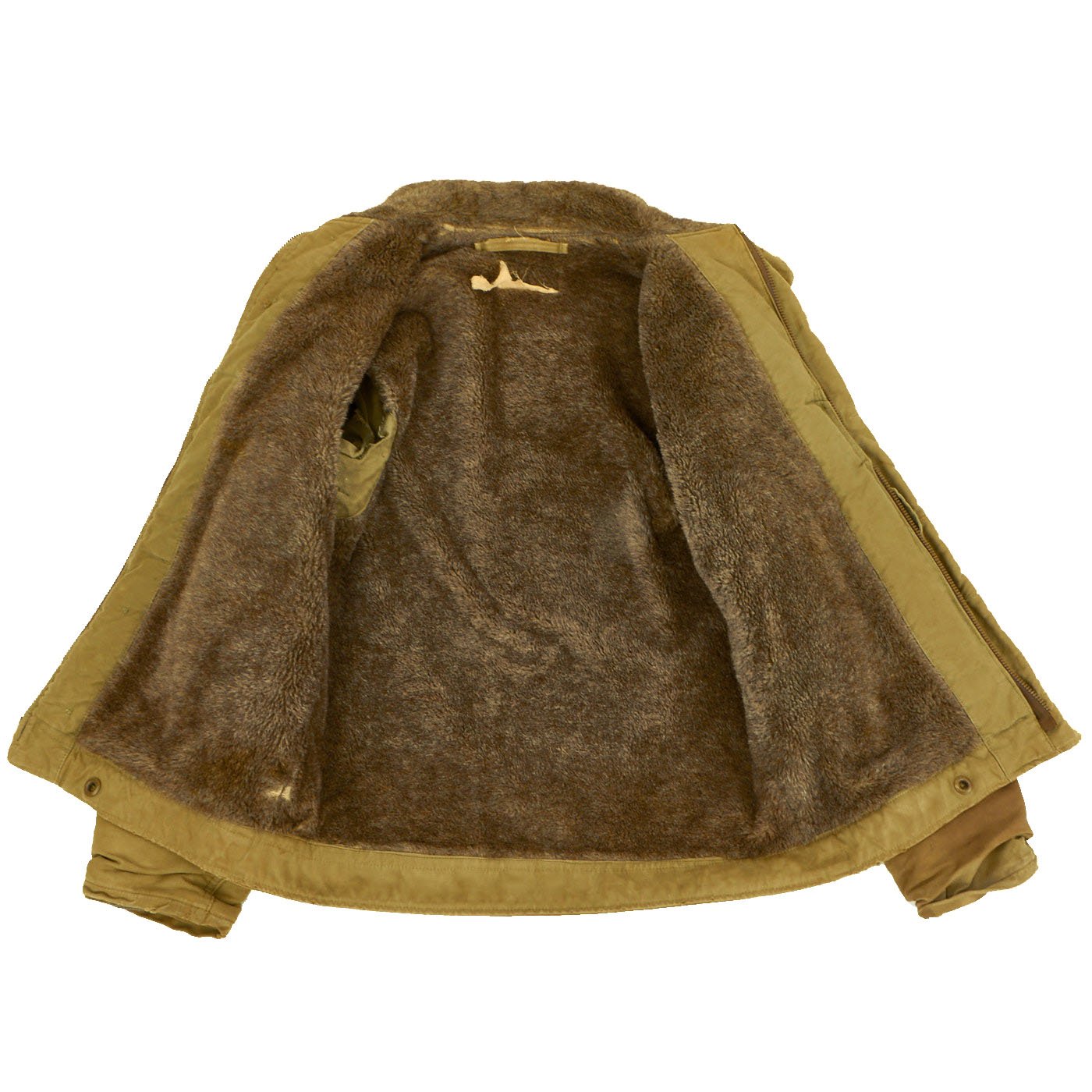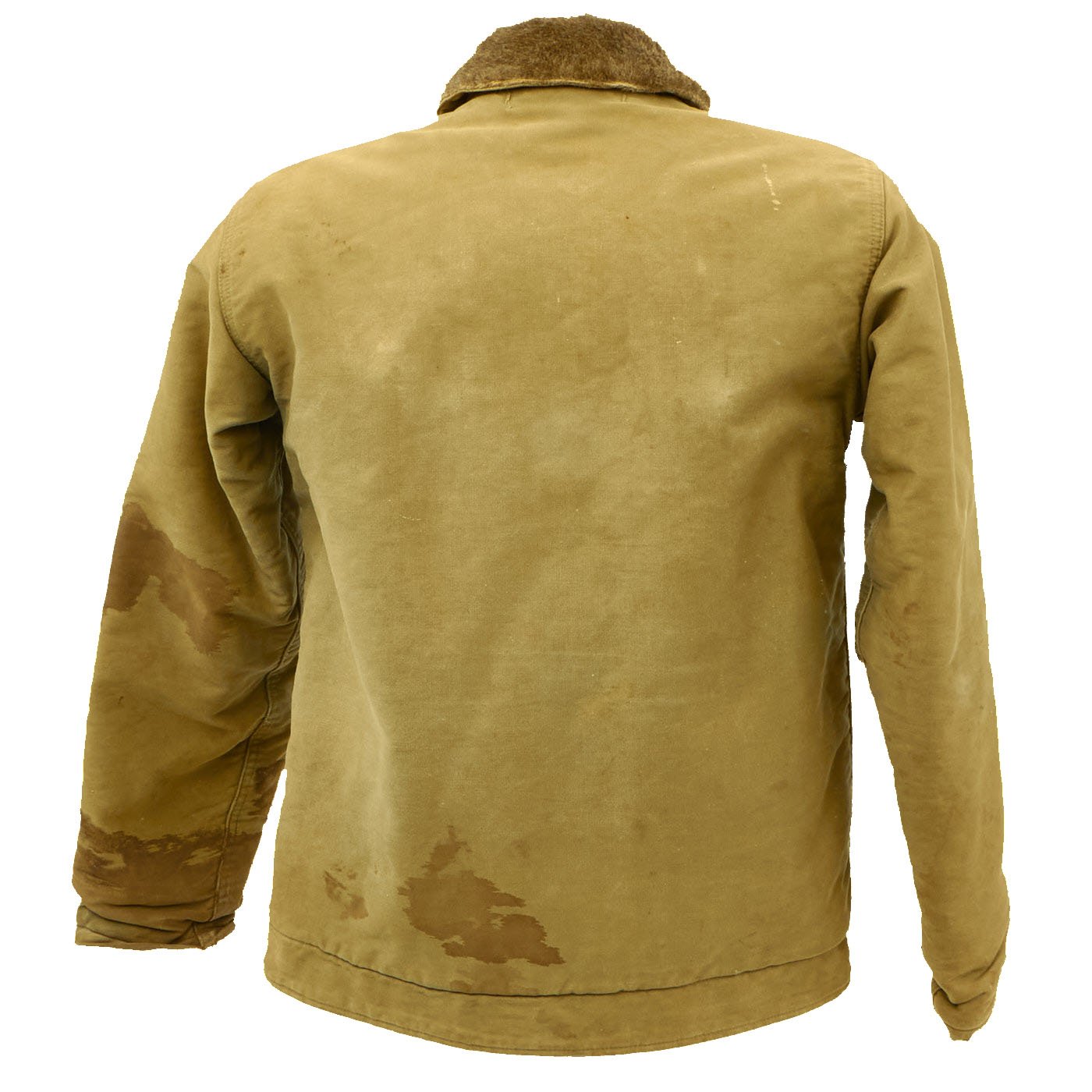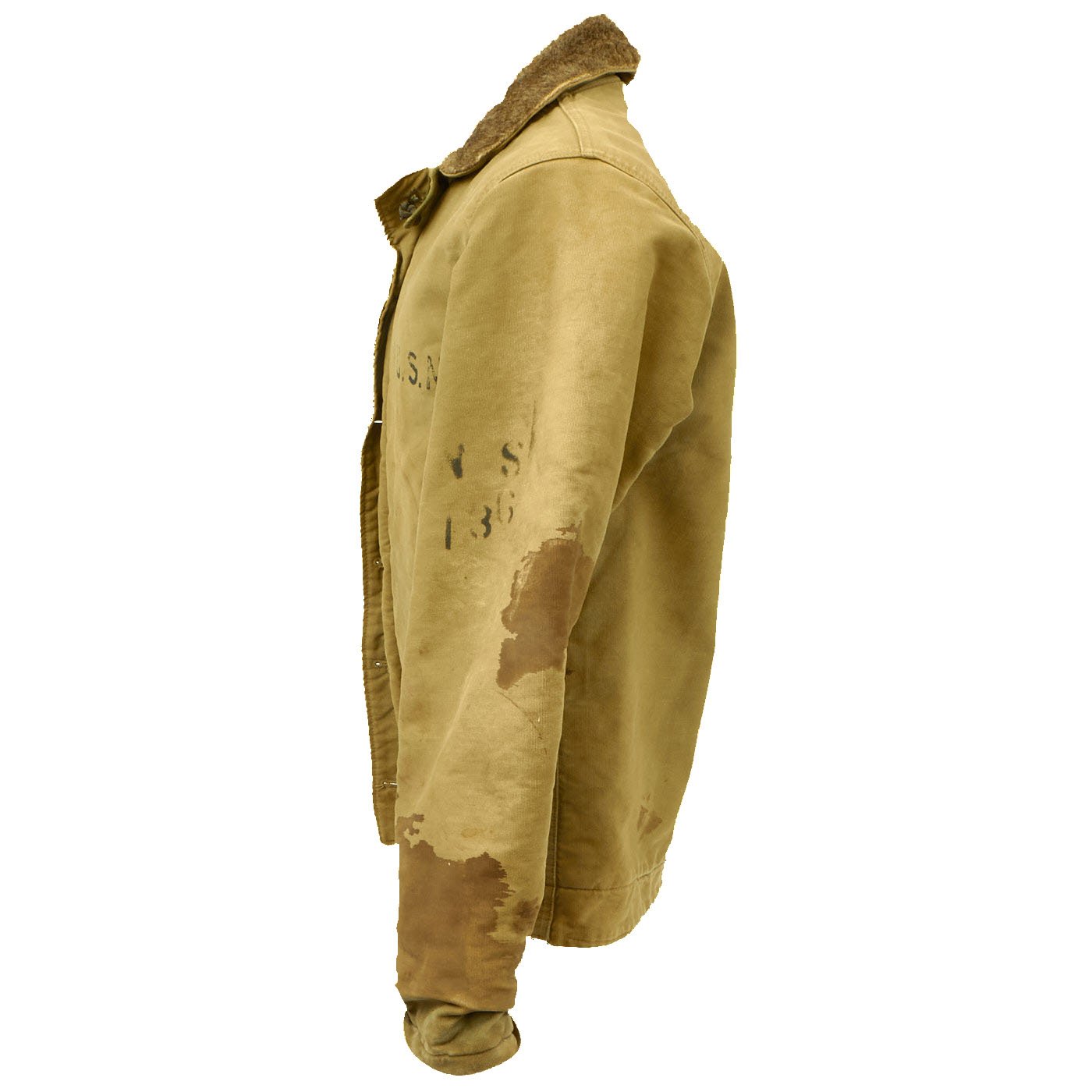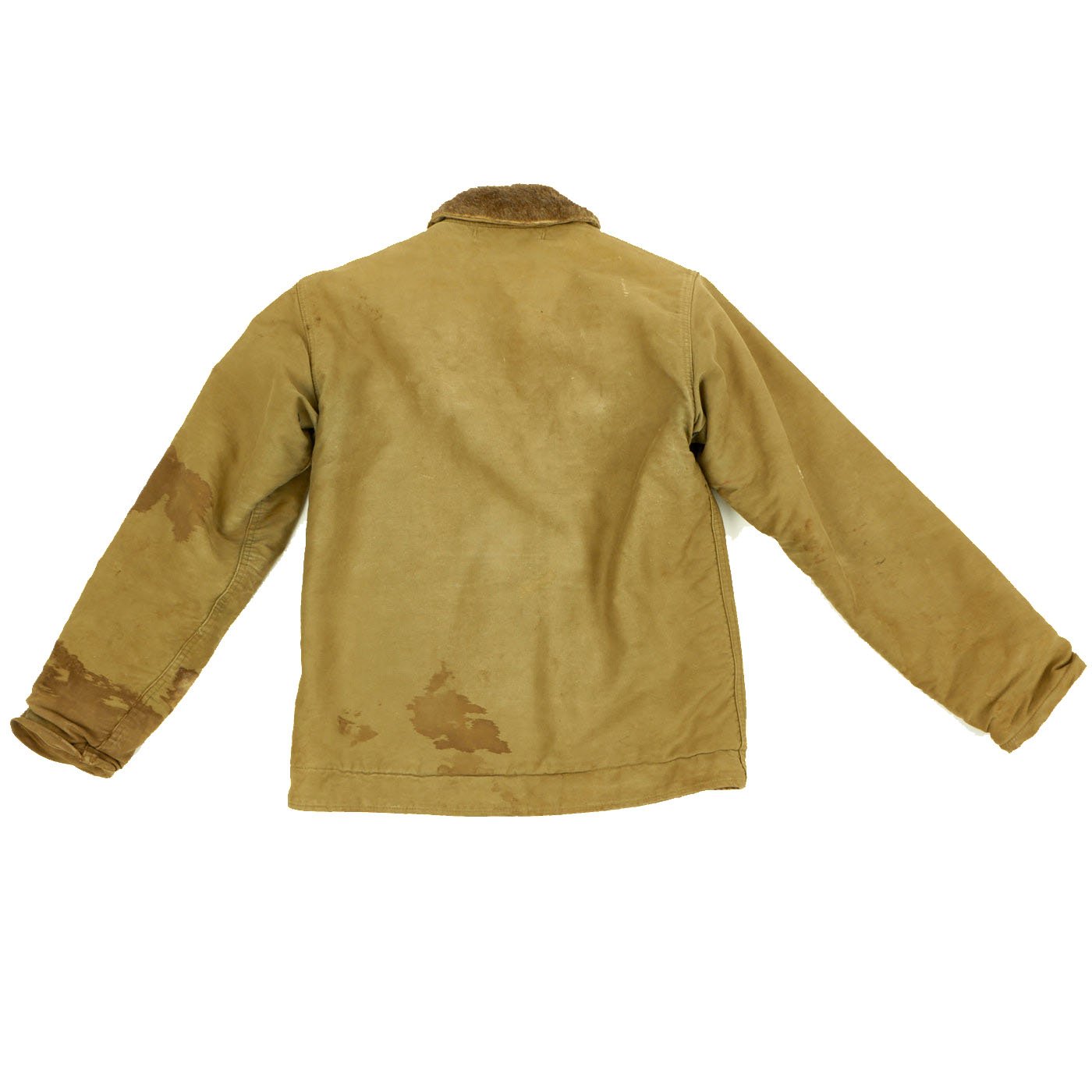 Original Item: Only One Available. Vintage 1940 - 1945 WWII United States Navy Stenciled USN Deck Jacket in size 38. The jacket is in very good condition, with fully functional zipper. Made from a ribbed material called “jungle cloth”, these jackets were lined with an alpaca artificial fur. These were very durable and warm coats, which were extremely sought after during WWII and the years later. Most veterans took theirs home and wore them until they simply fell apart… which is why these jackets are so rare today. This Jacket shows signs of honest wear, with wear at the usual places; cuffs, collar, skirt, etc. There is some staining, as pictured.