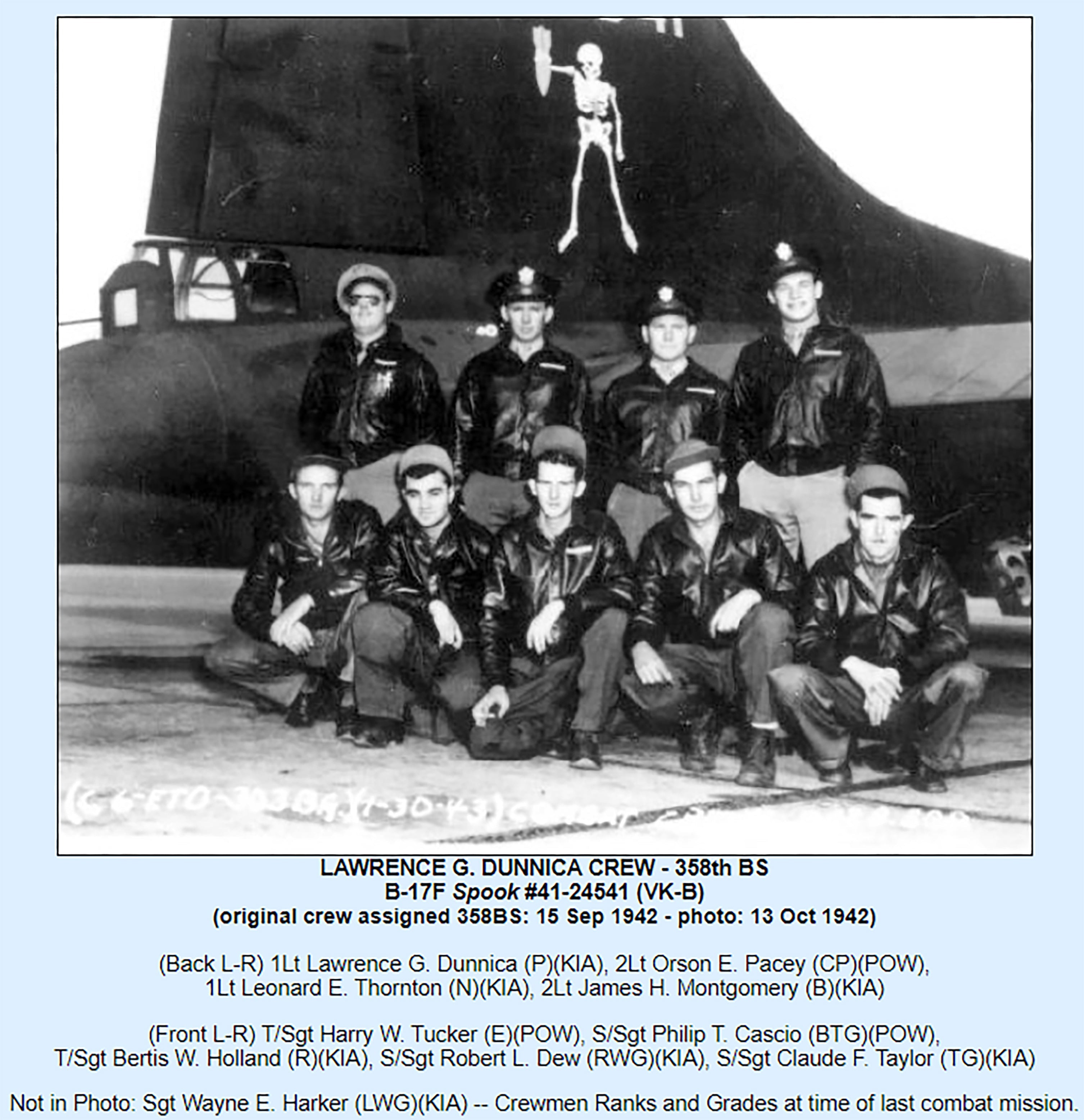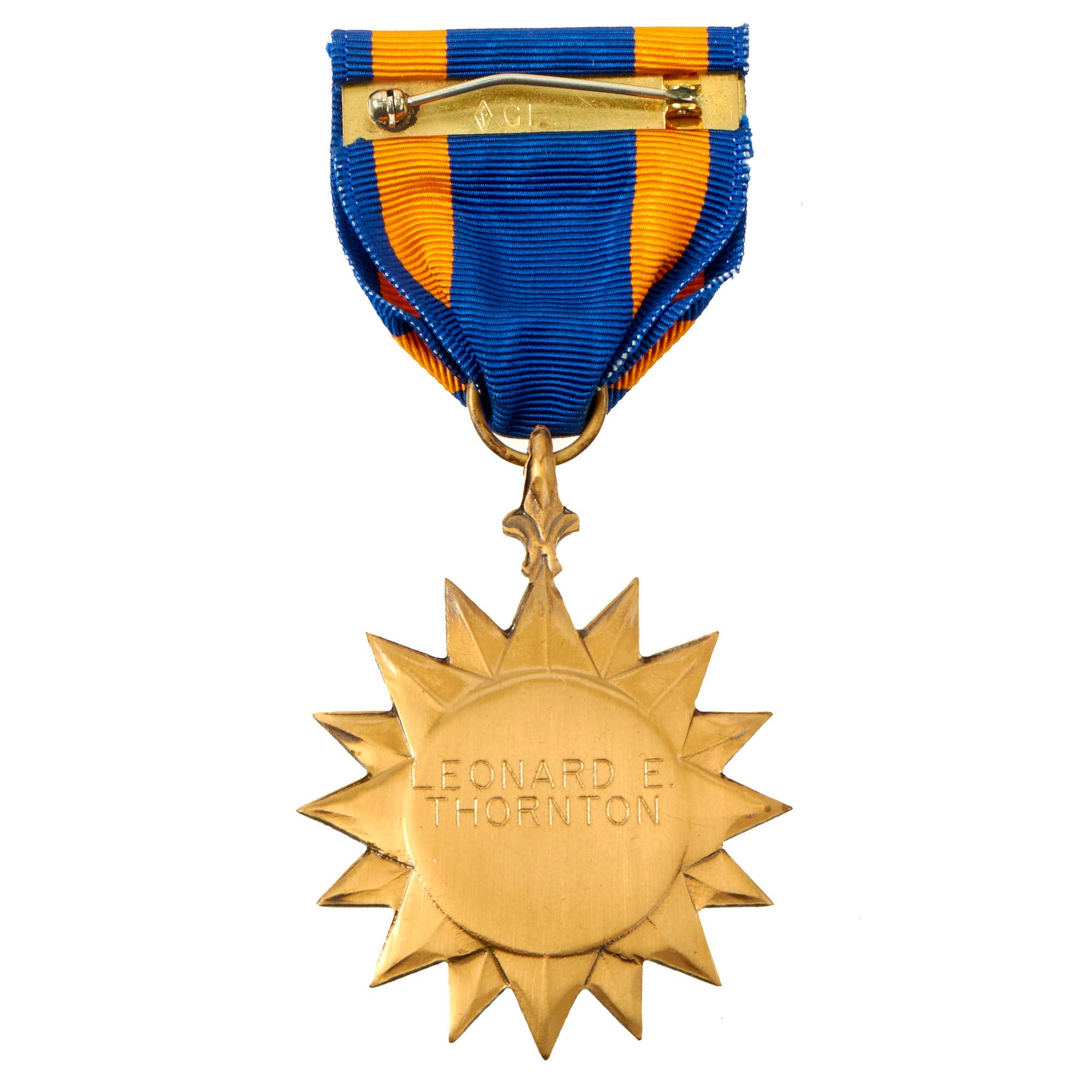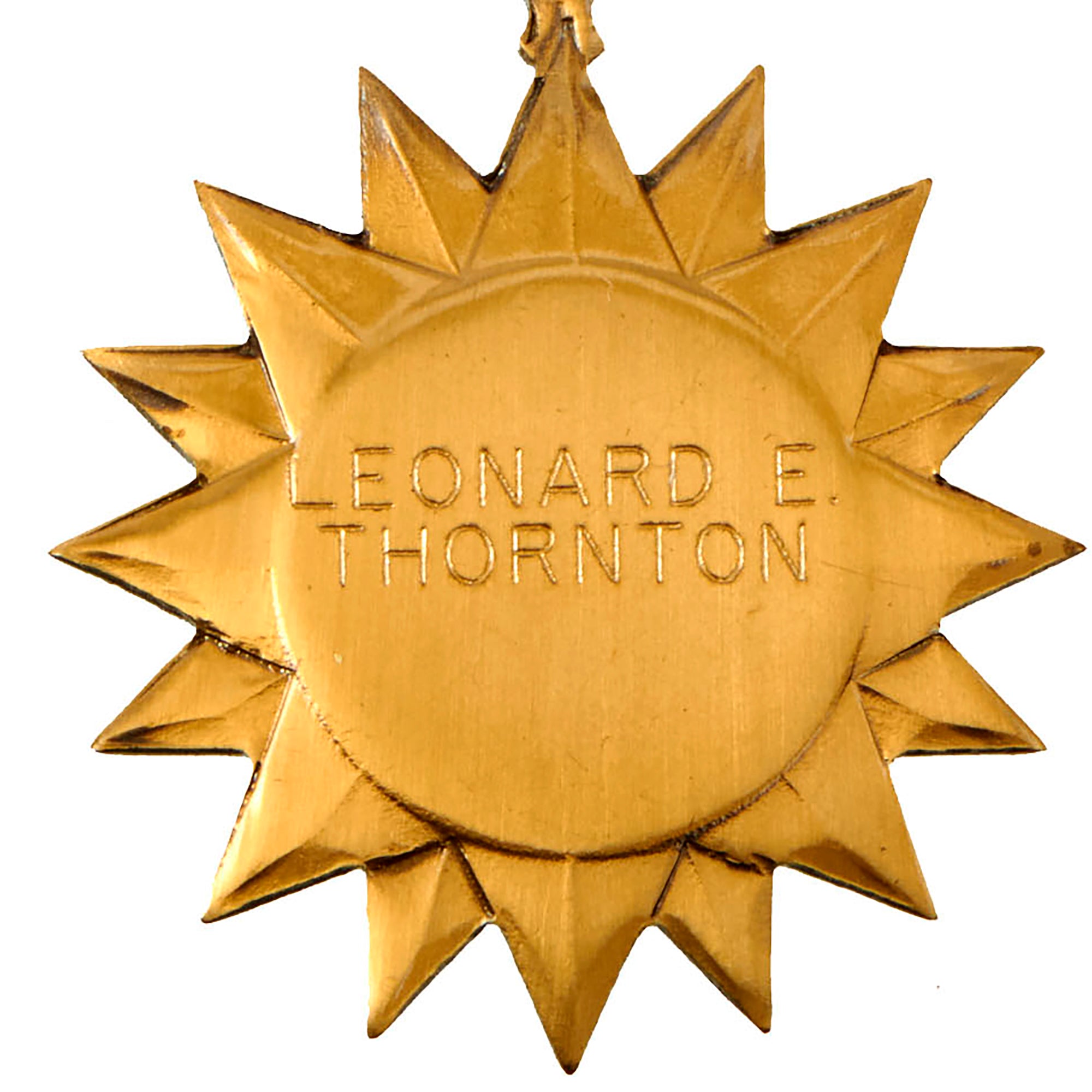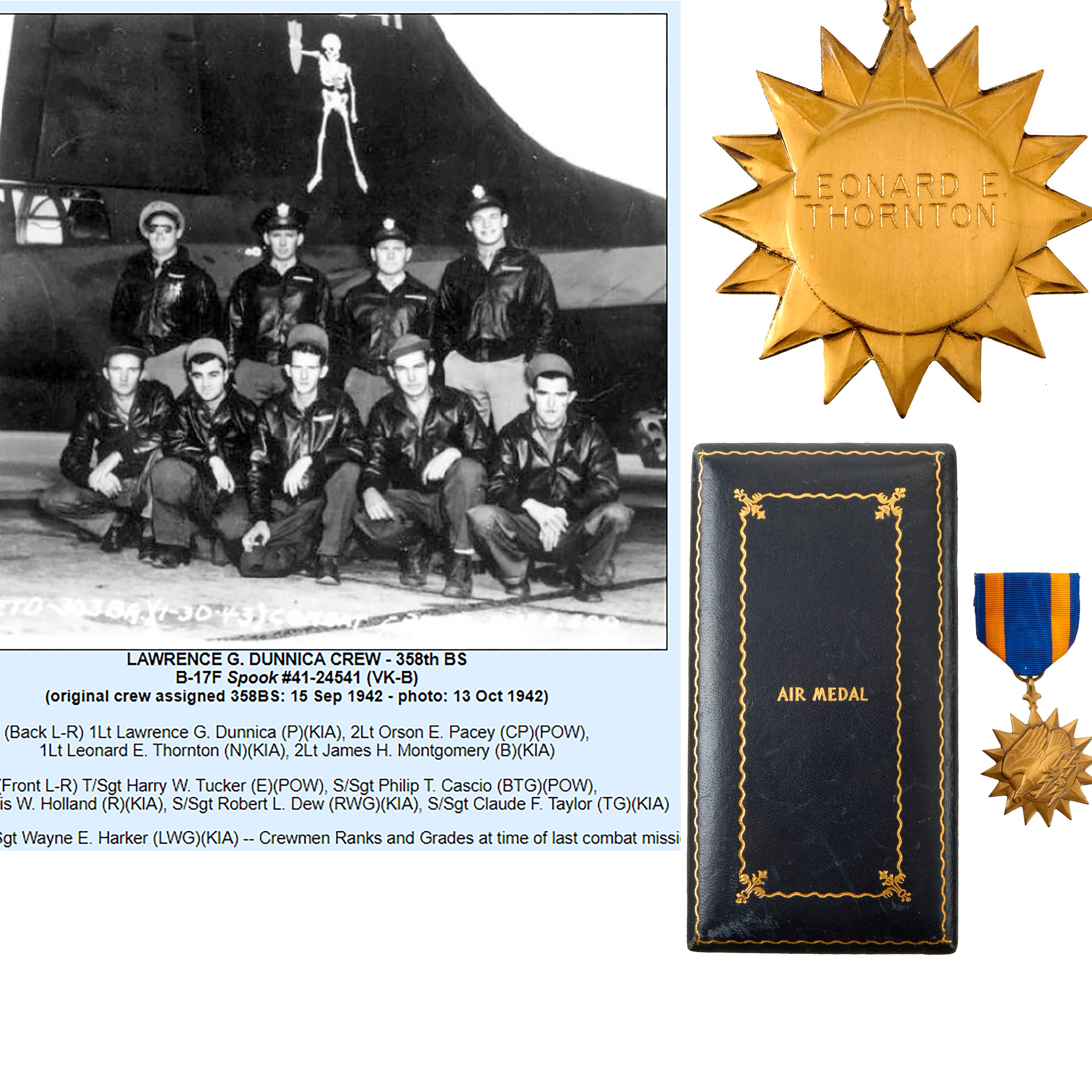 The medal is named engraved on the reverse for LEONARD E. THORNTON. Lt. Thornton was a Navigator aboard B-17 41-24541 / Spook which was shot down by enemy aircraft on February 16, 1943. After dropping bombs on the target, Spook left the Group formation to go to the aid of a 306th BG(H) B-17 being attached by a few ME-109s. While circling the damaged B-17 at about 10,000 feet, fifteen ME-109s suddenly appeared. Some members of the 306th BG(H) B-17 then bailed out. Lt Dunnica then started flying a course back to England. Spook was shot down in the English Channel about 20 miles from the English coast. Upon crashing in the cold icy water the B-17 broke into parts. Tail Gunner, Sgt Taylor, went down in the tail section. Waist Gunner, S/Sgt Dew, was last seen floating in high waves. Pilot, Lt Dunnica, failed to get out the Pilot's window and went down with his B-17. Radio Operator, T/Sgt Holland, had been shot and couldn't exit the B-17. Lt Pacey, T/Sgt Tucker and S/Sgt Cascio escaped through the radio hatch and reached an inflated rubber dinghy. They spent about fourteen hours in the dinghy, were strafed three times, flipped over many times in the high waves, and eventually reached the French coast near Brest in the early dark morning. They found a small shoreline hut and slept a short time. About 0600 they saw a distant French House. The French family gave them coffee, bread and a change of clothing and then asked the crewmen to leave since German soldiers were in the area. They were captured a few hours later and transported to a jail in Paris, then to Frankfurt, Germany and POW camps.